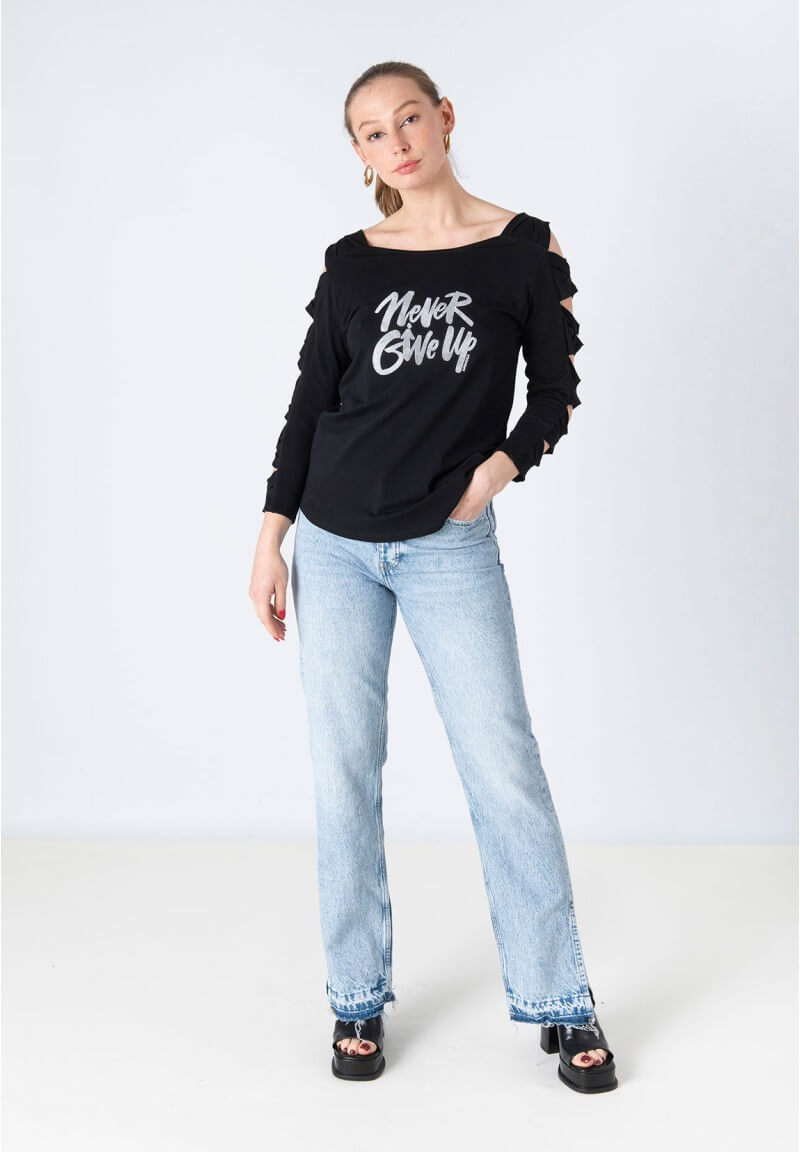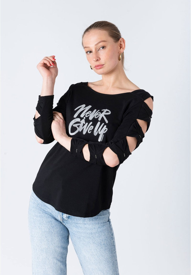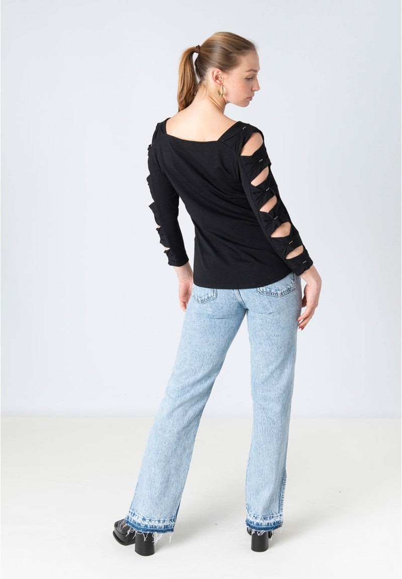 La camiseta Animosa Lazos tiene un toque original ya que sus mangas se forman por lazos con tachas en el centro.