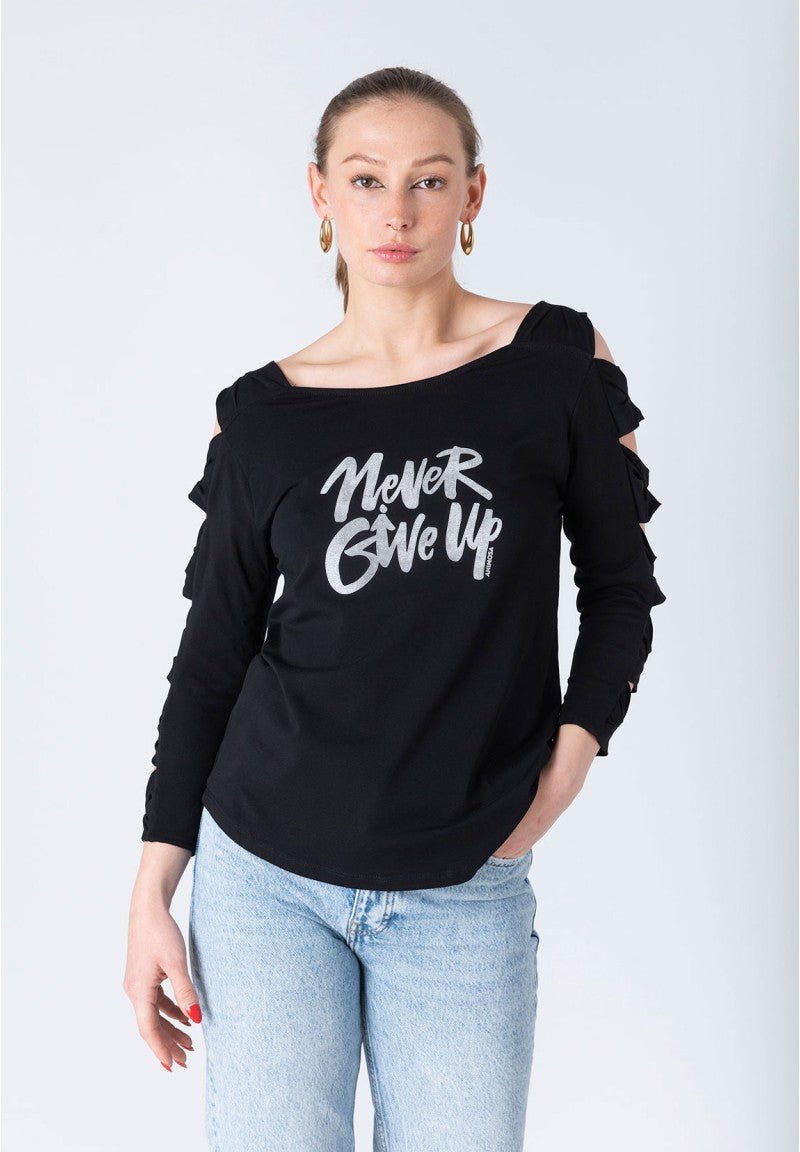 Camiseta Animosa Lazos en negra con frase en tono plateado.