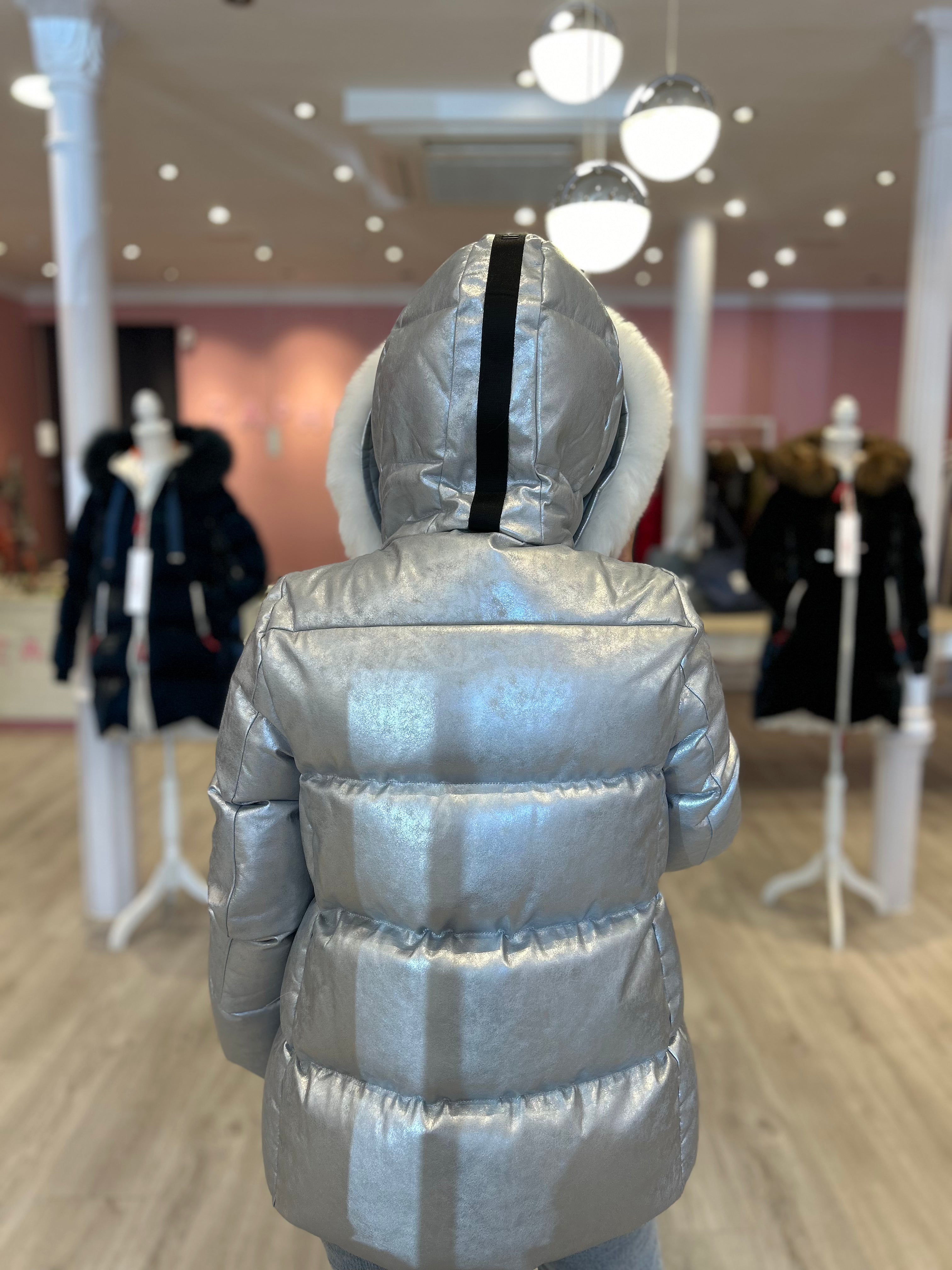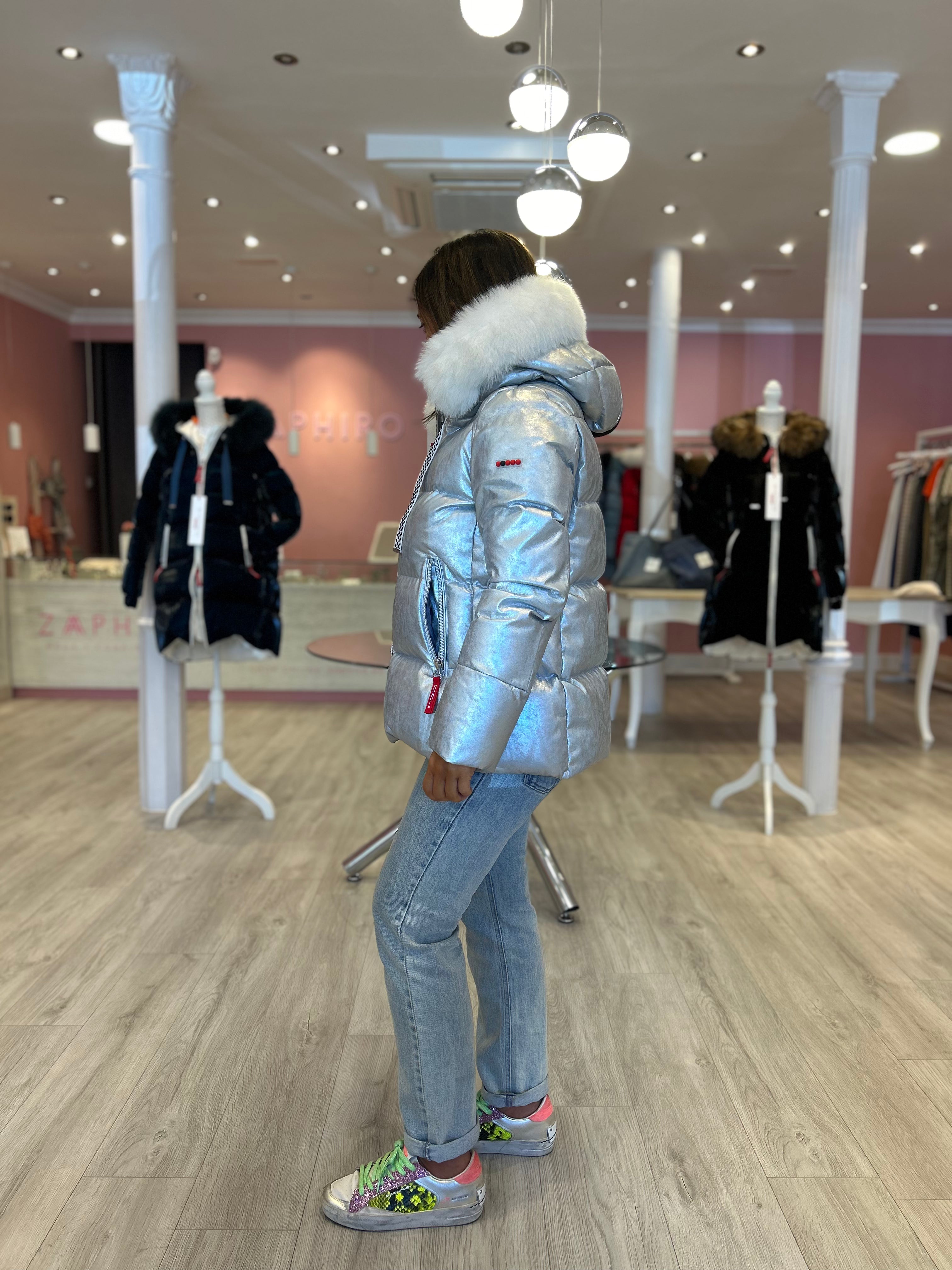 Cazadora Dichi Kelli color plata metalizada, con pelo natural desmontable en la capucha.