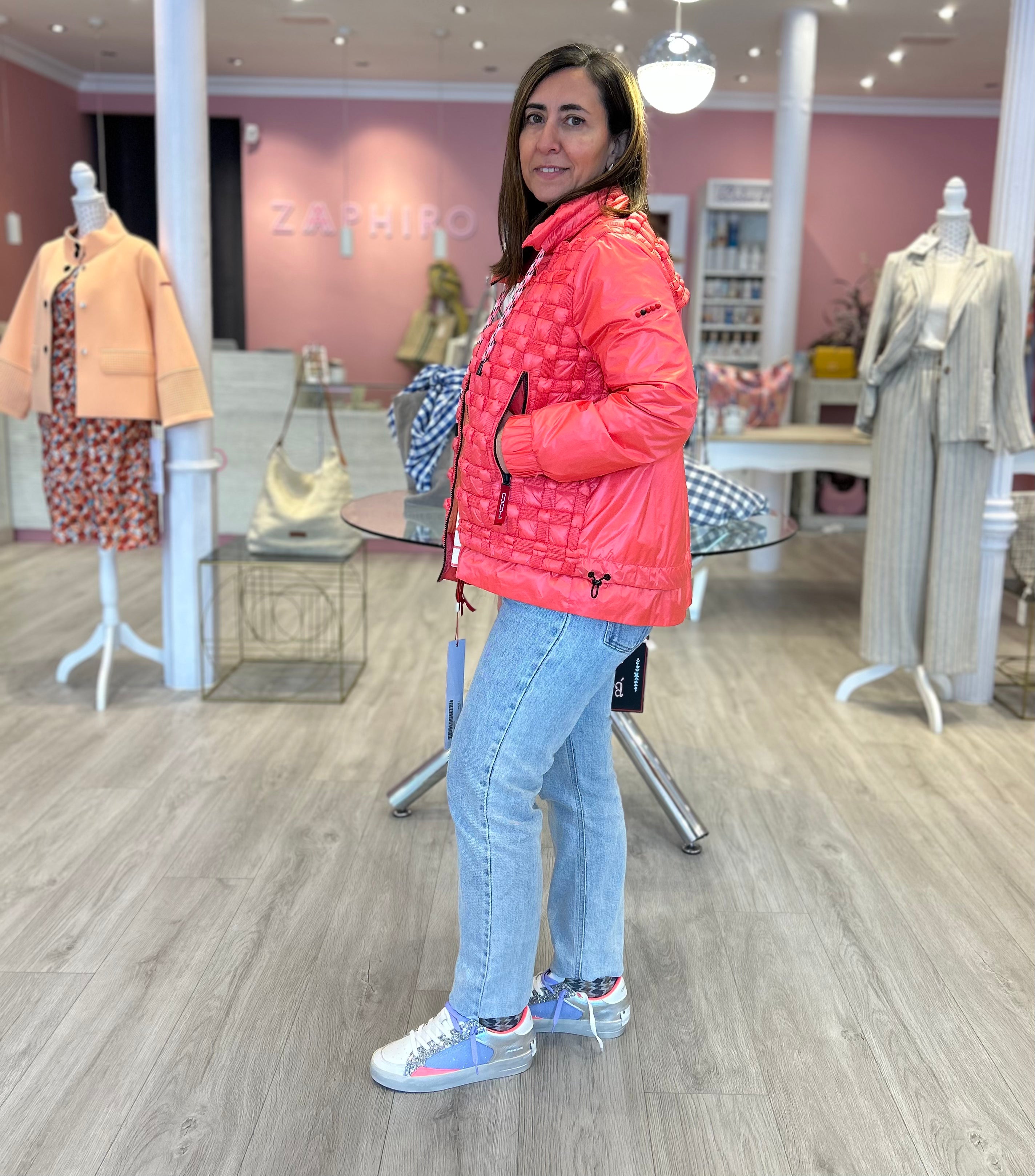 Cazadora Dichi Noe en color coral , con tejido haciendo dibujo y liso en la parte trasera.