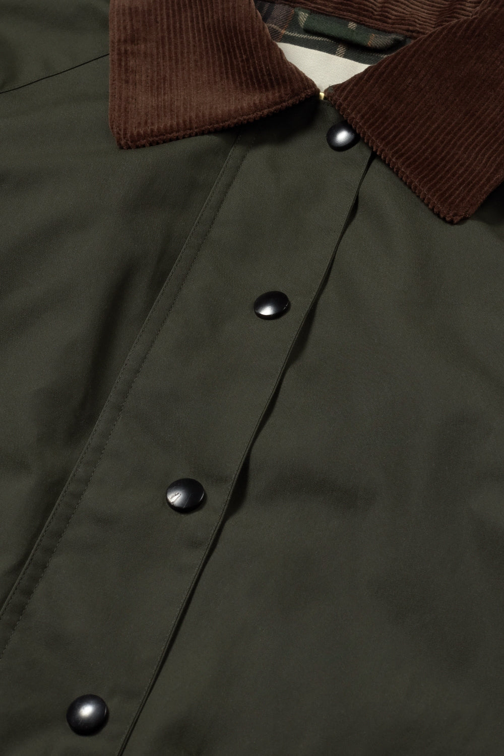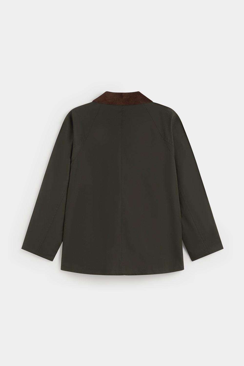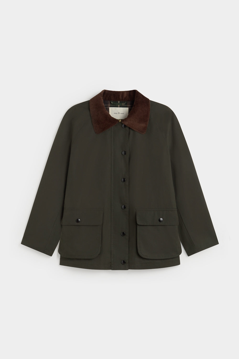 Chaqueta eseOese Mackenzie en color verde y solapa de pana en marrón. Forro interior de franela con estampado a cuadros.