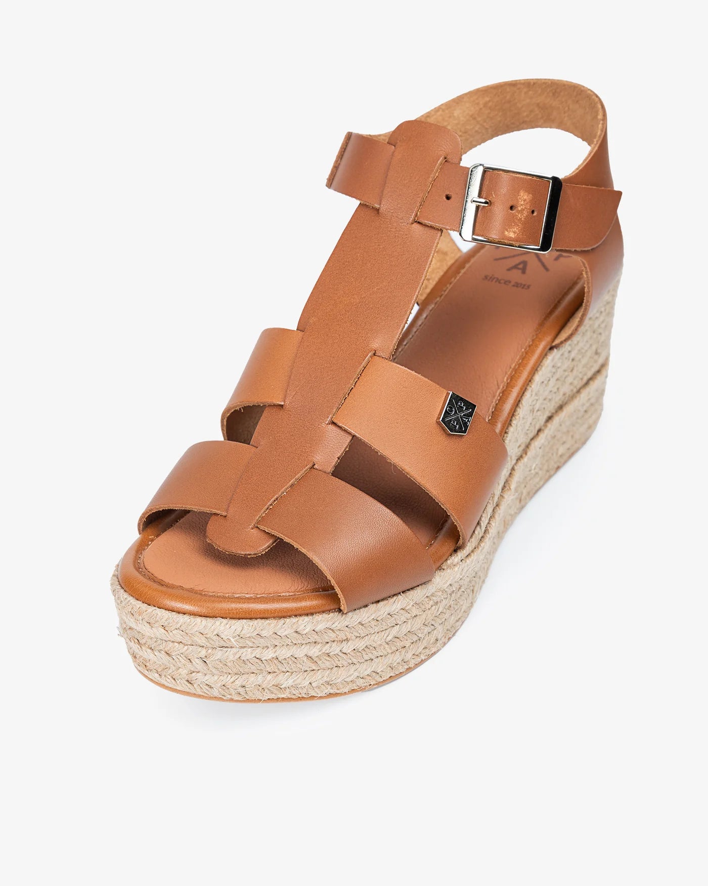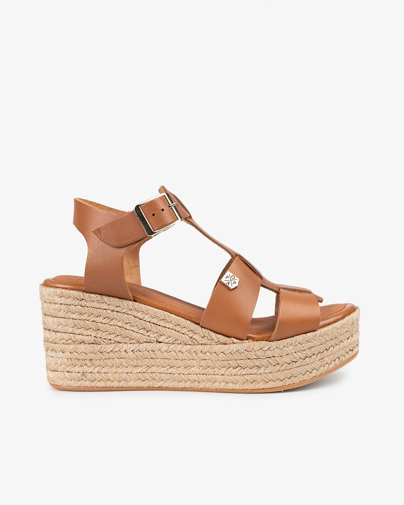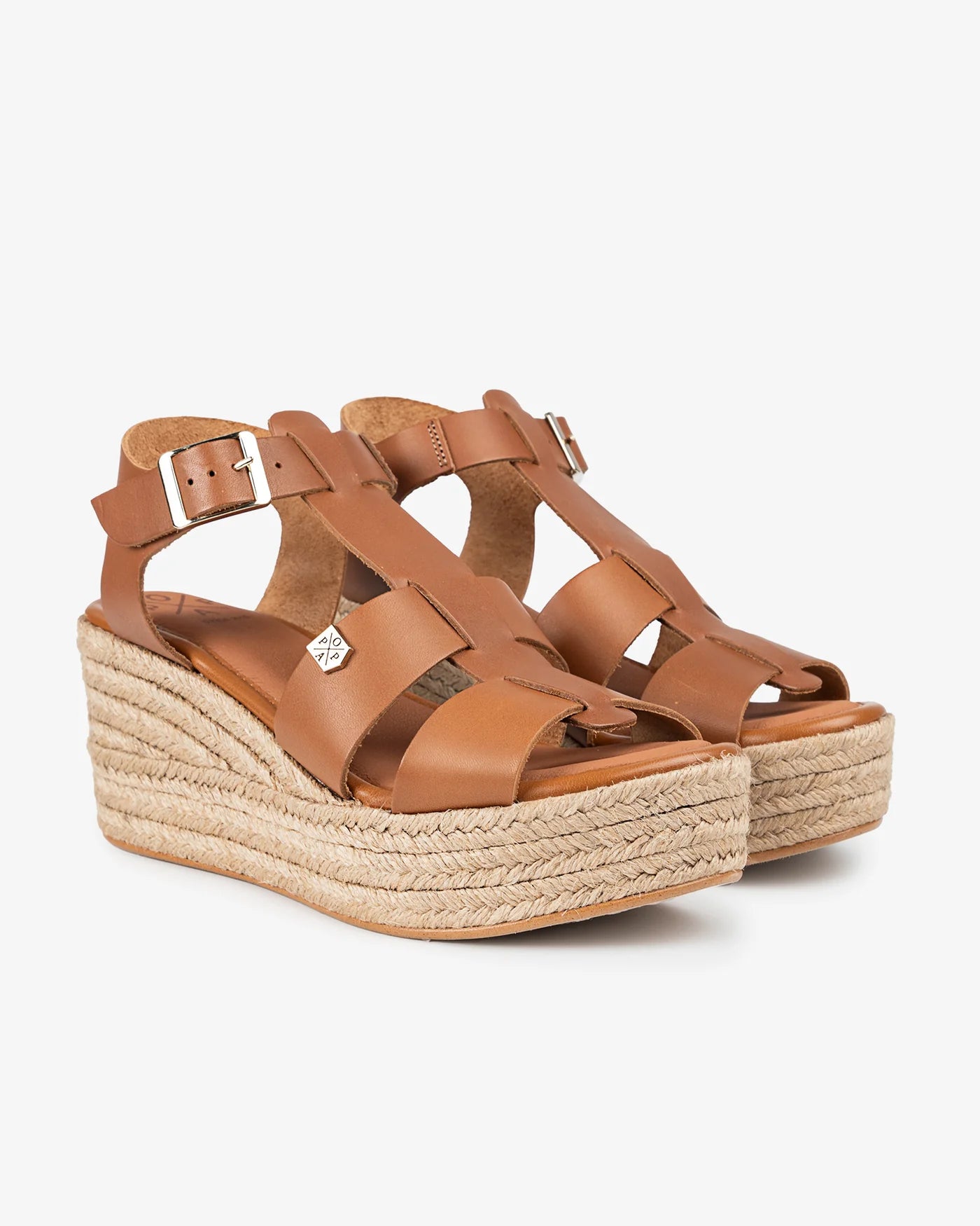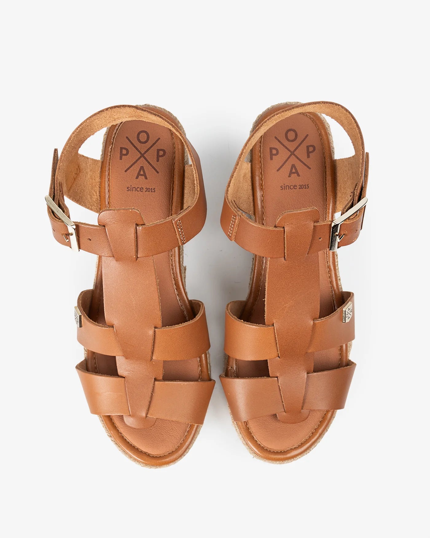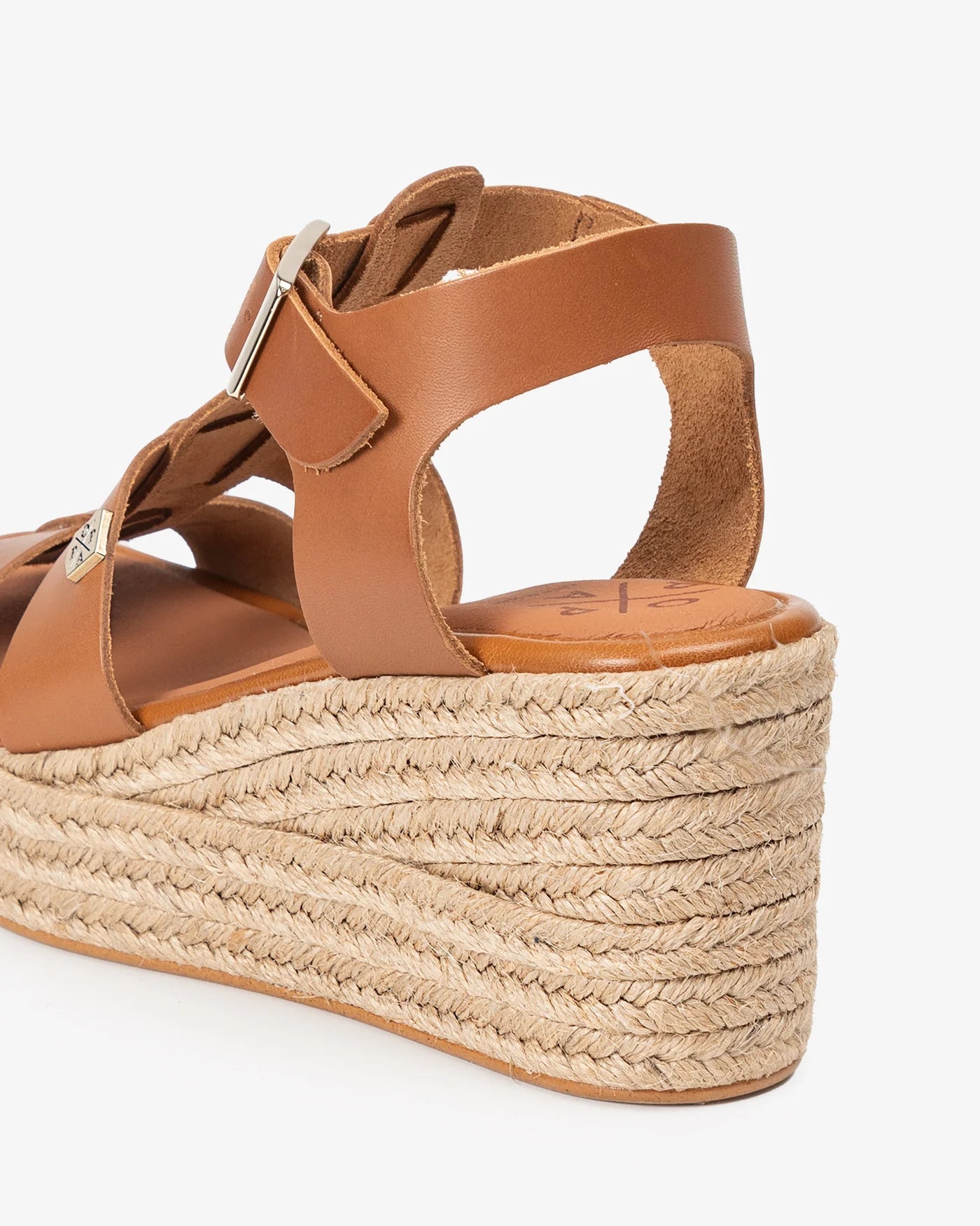 Cuña POPA Grumari de piel en color cuero ajustable en el tobillo.