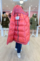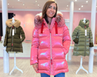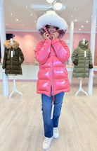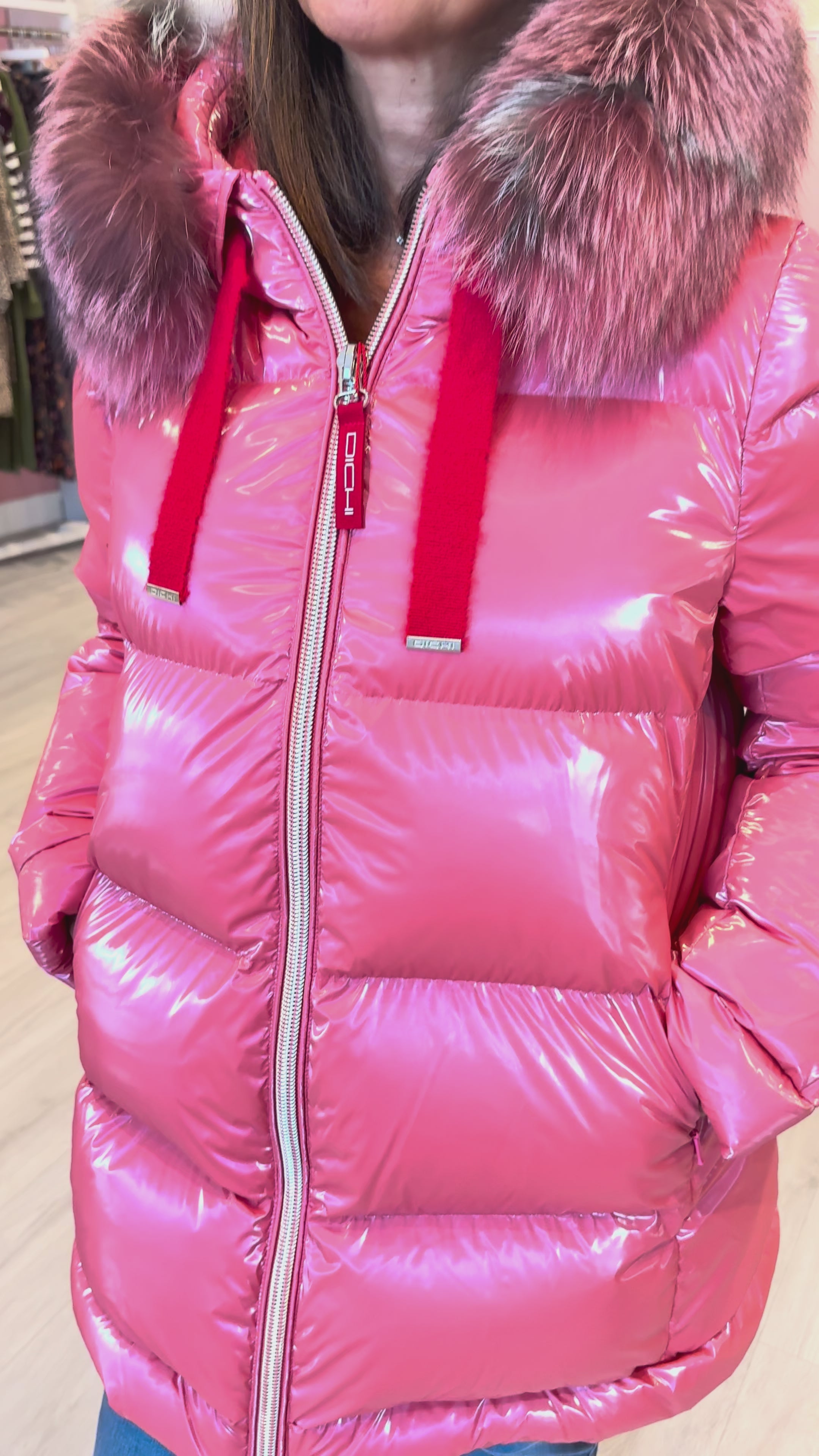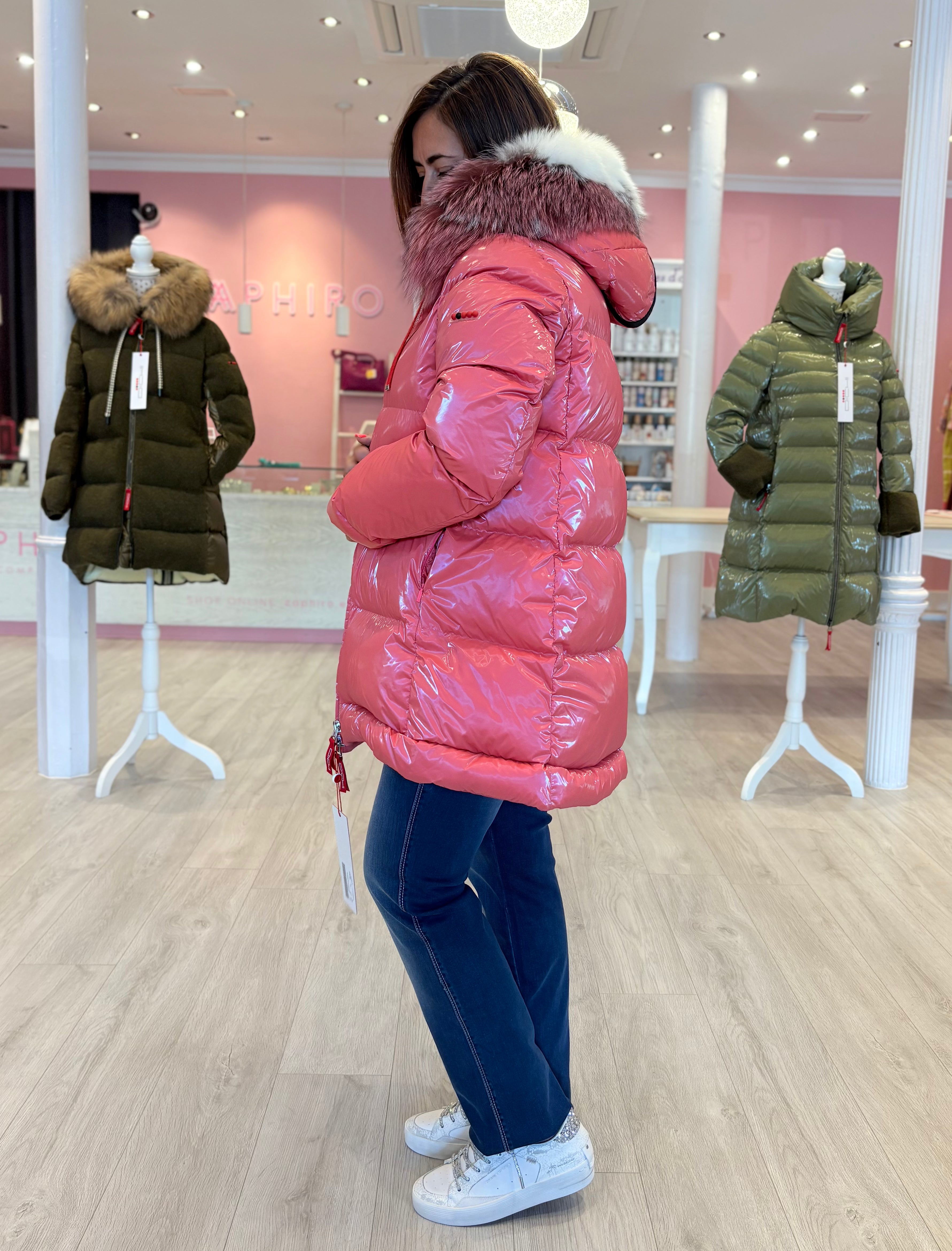 Plumífero DICHI Mireya en color rosa chicle y en un tejido con efecto brillante. El pelo natural al tomo es desmontable.