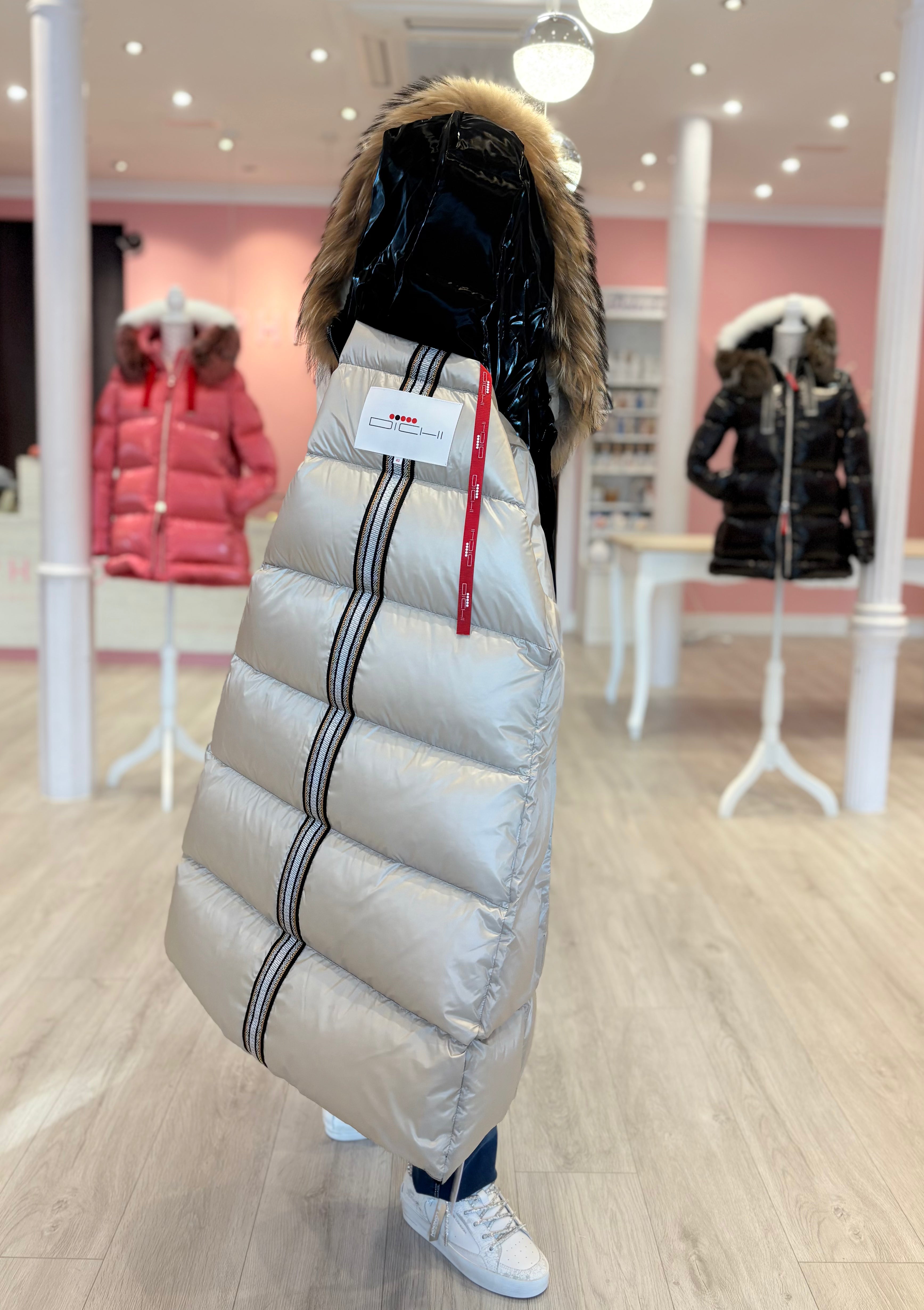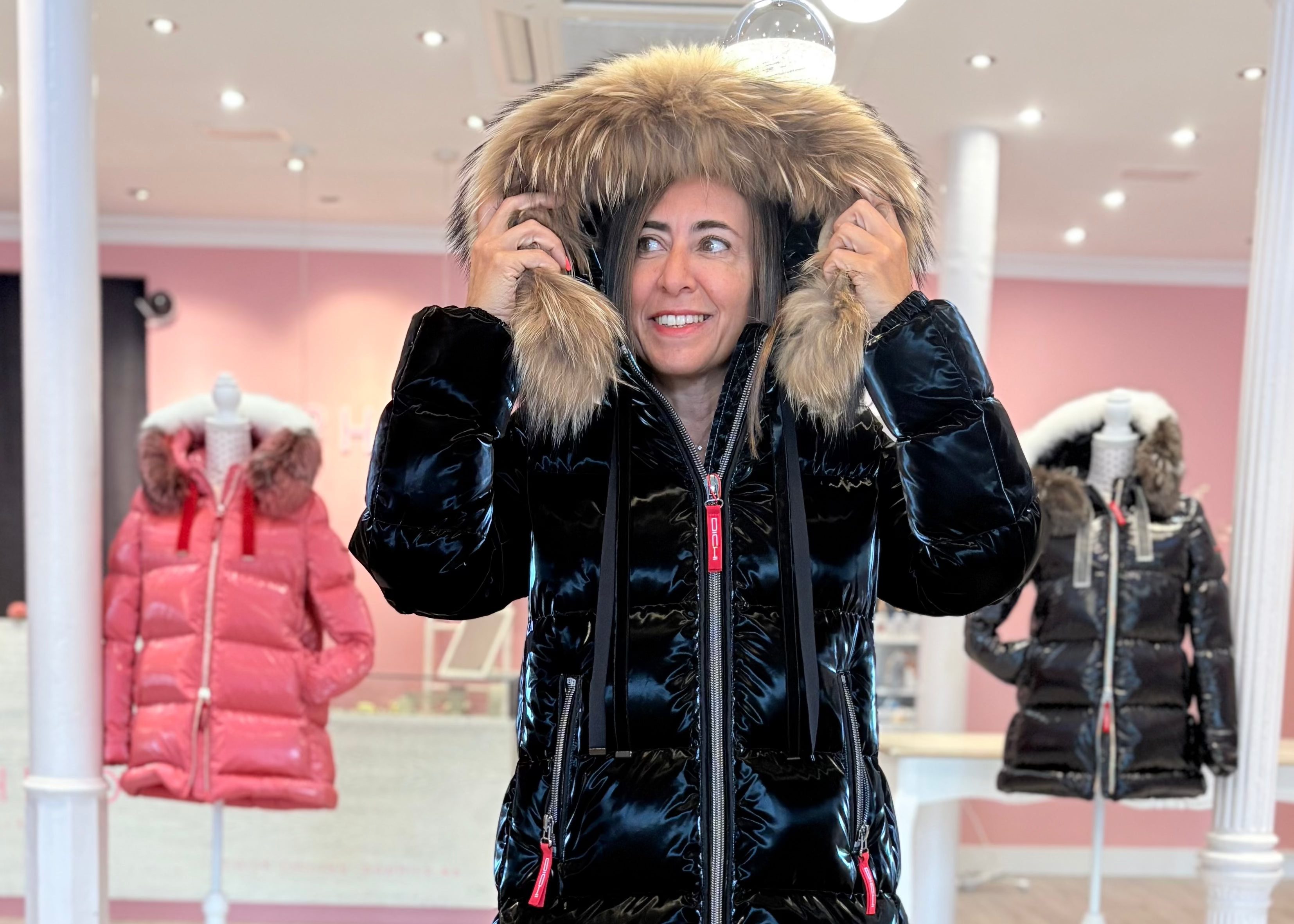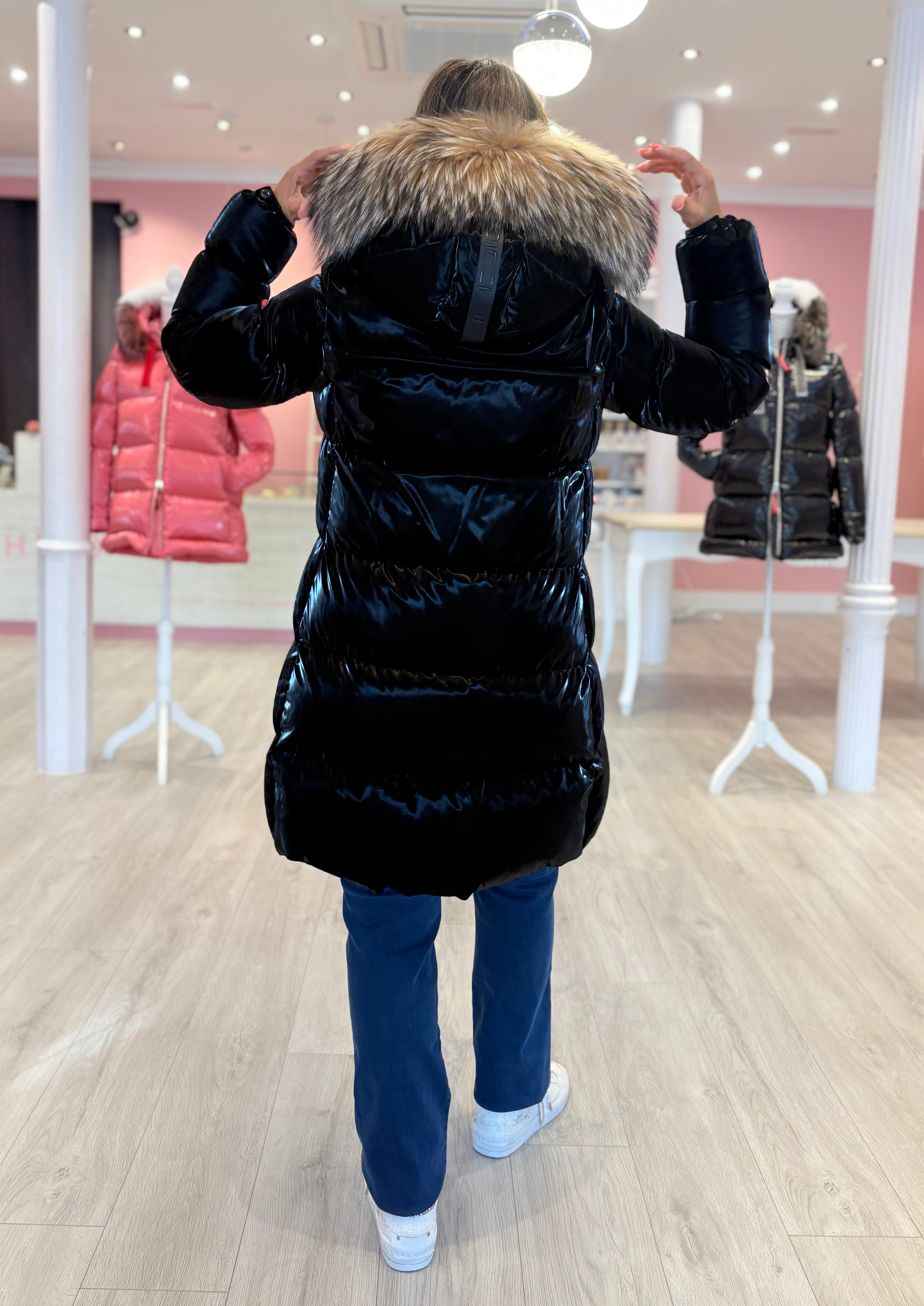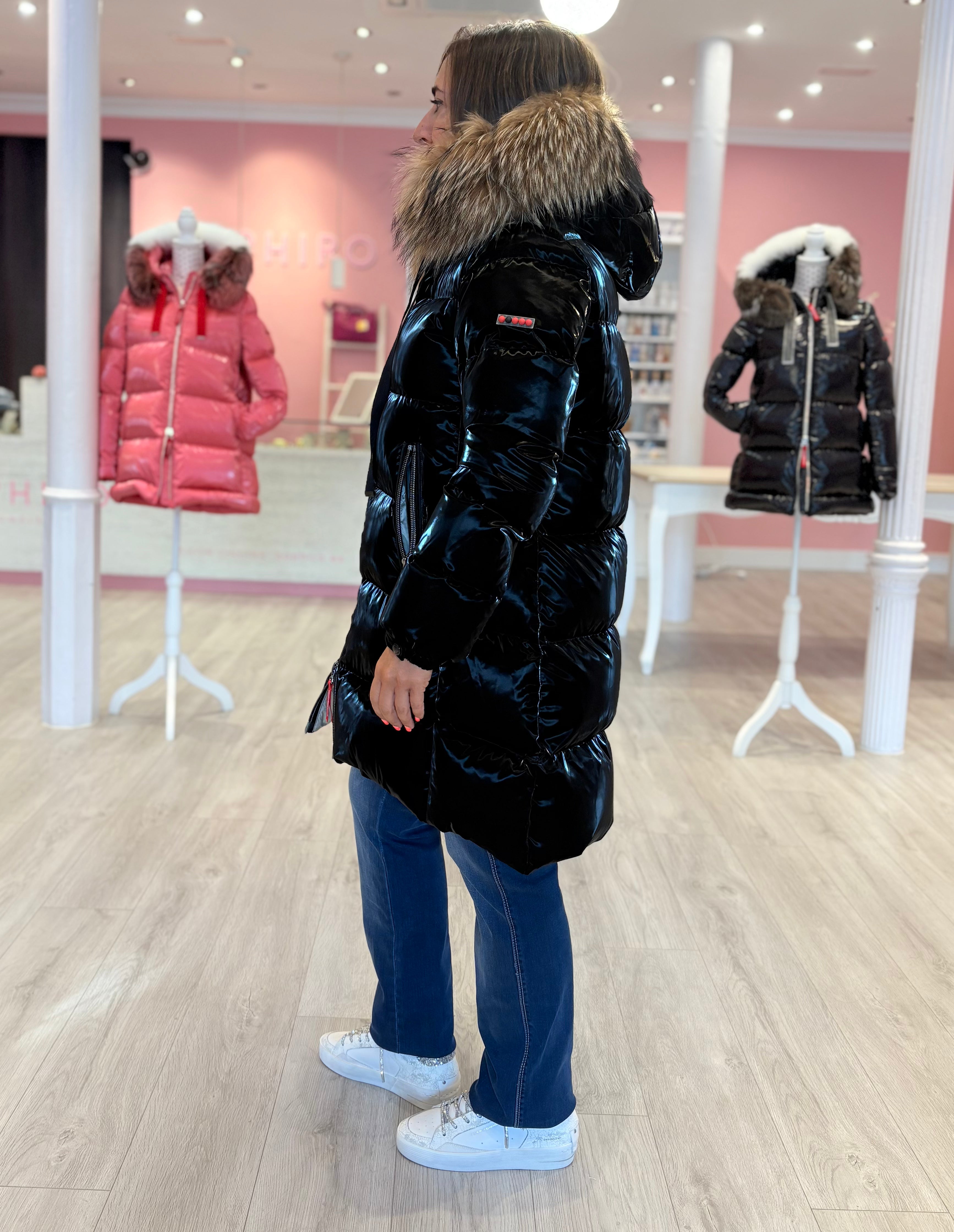 Plumífero DICHI Morena en color negro con tejido efecto brillo y cordones de terciopelo para ajuste de capucha. El pelo natural es desmontable.