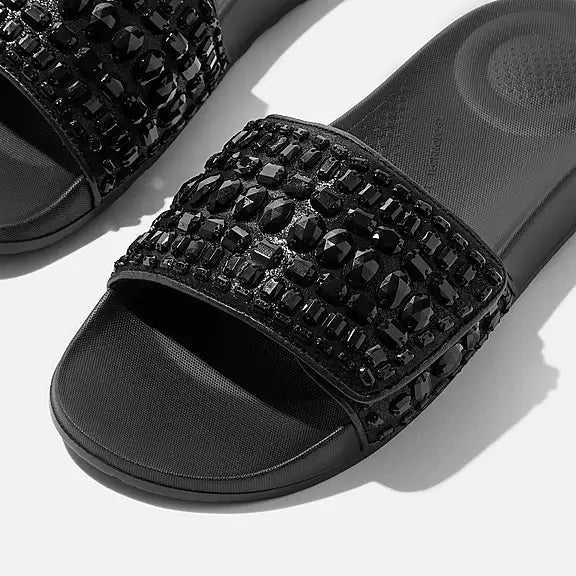 Sandalia FITFLOP negra con cristales gruesos y ajustable en el empeine.