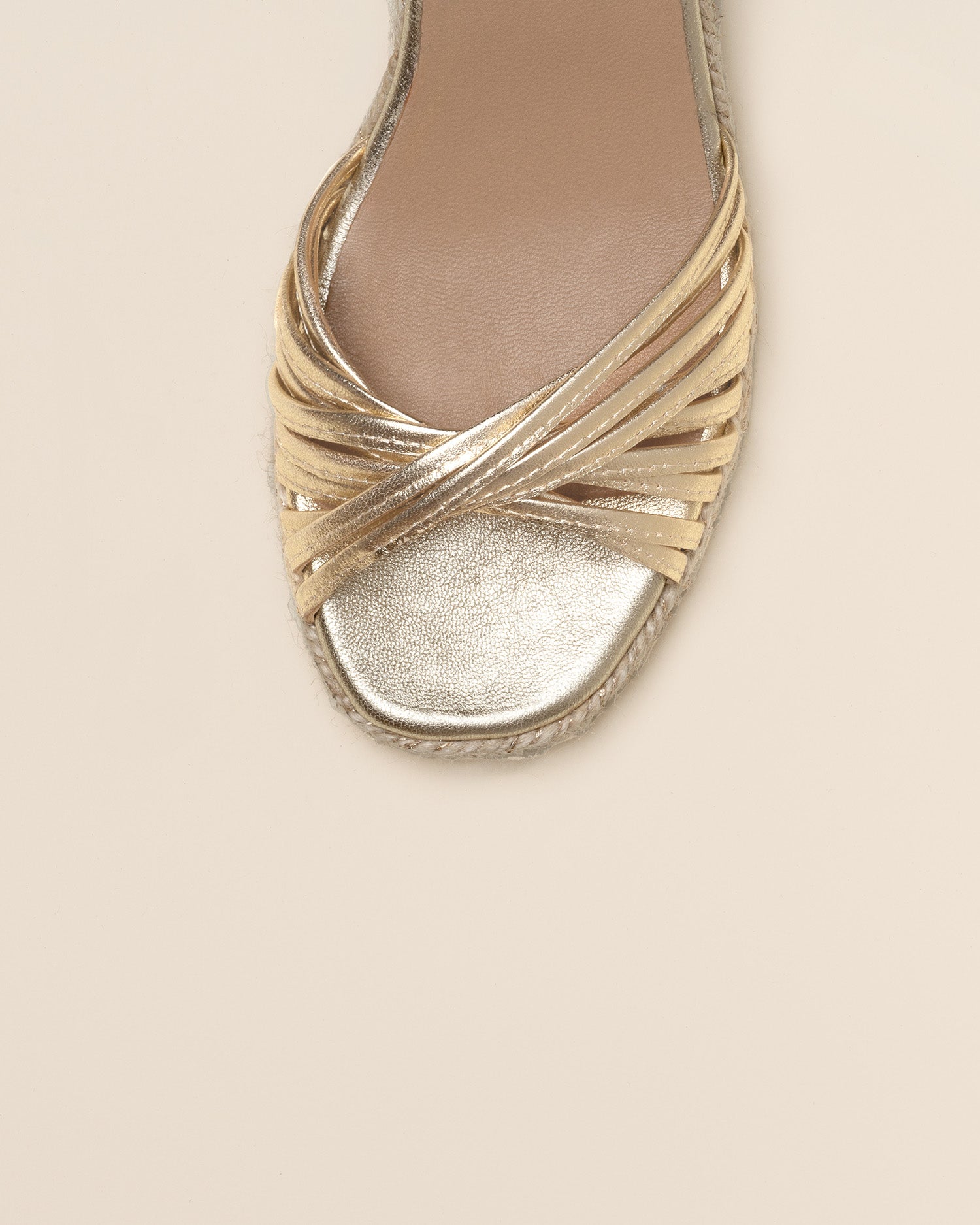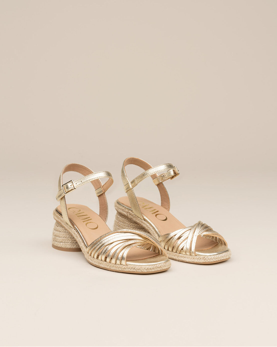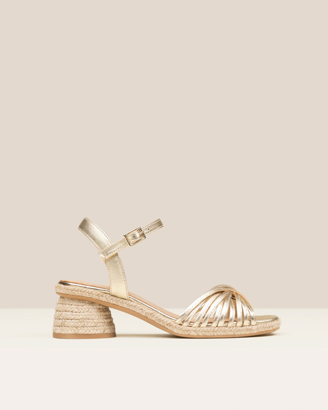 Sandalia GAIMO Narcisa de multitiras doradas en piel y tacón de yute.