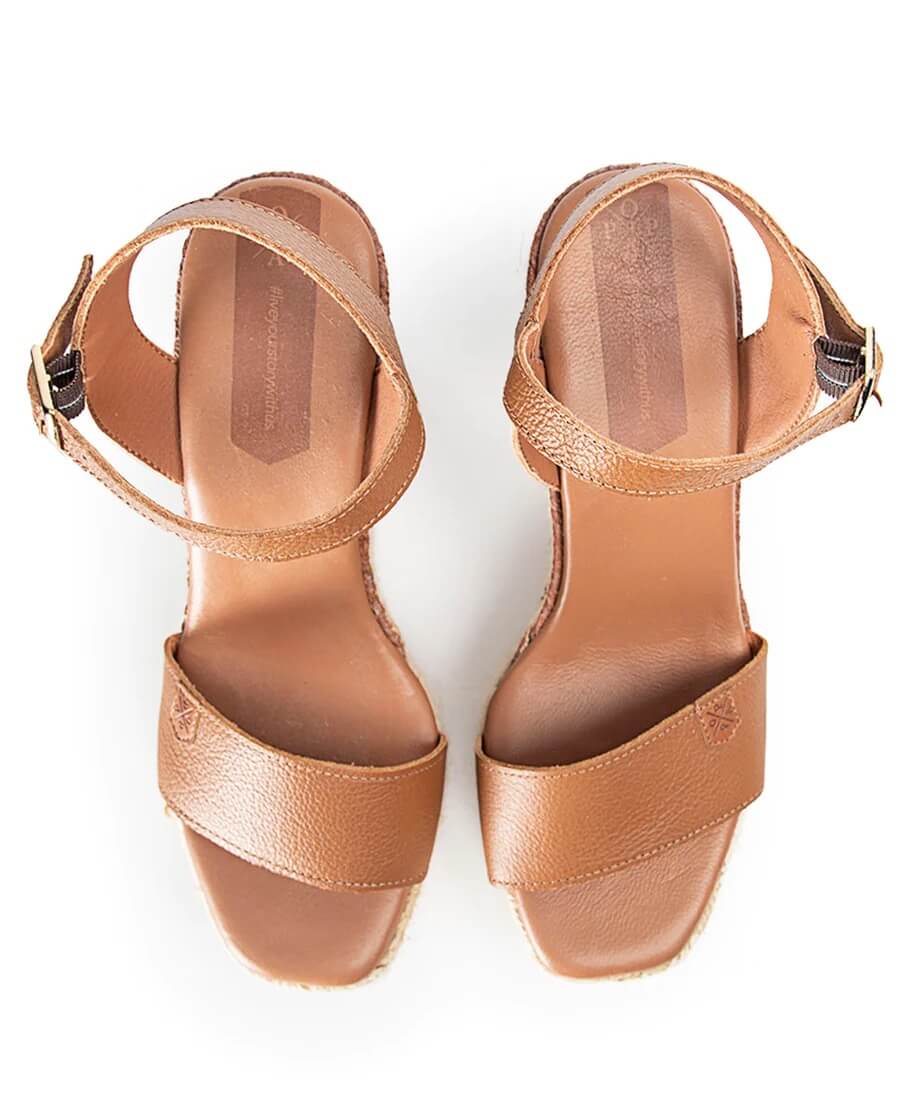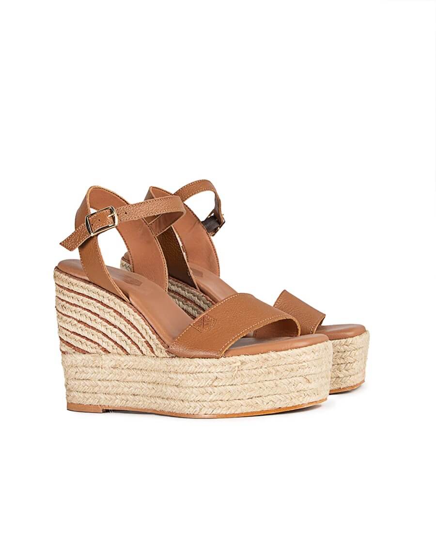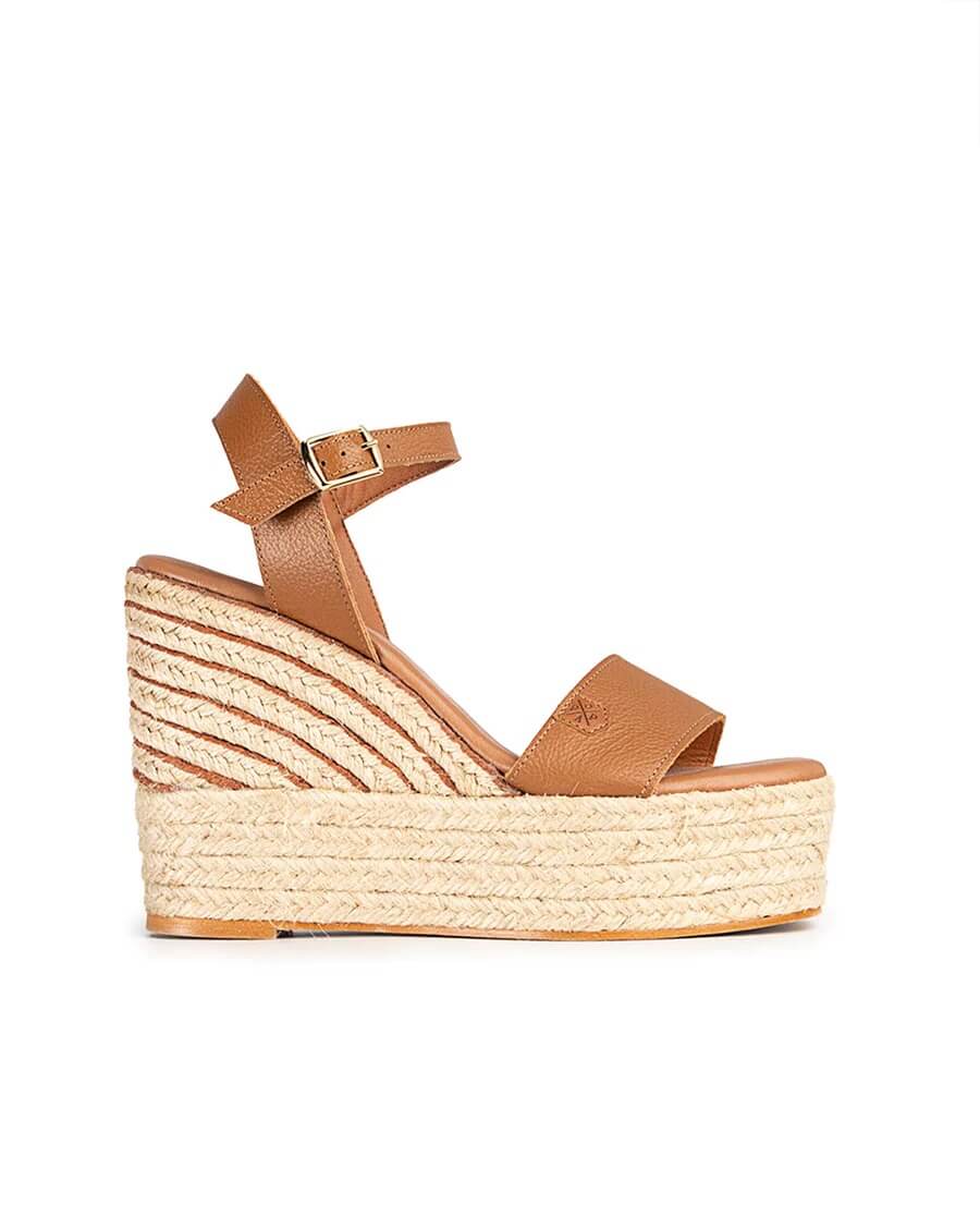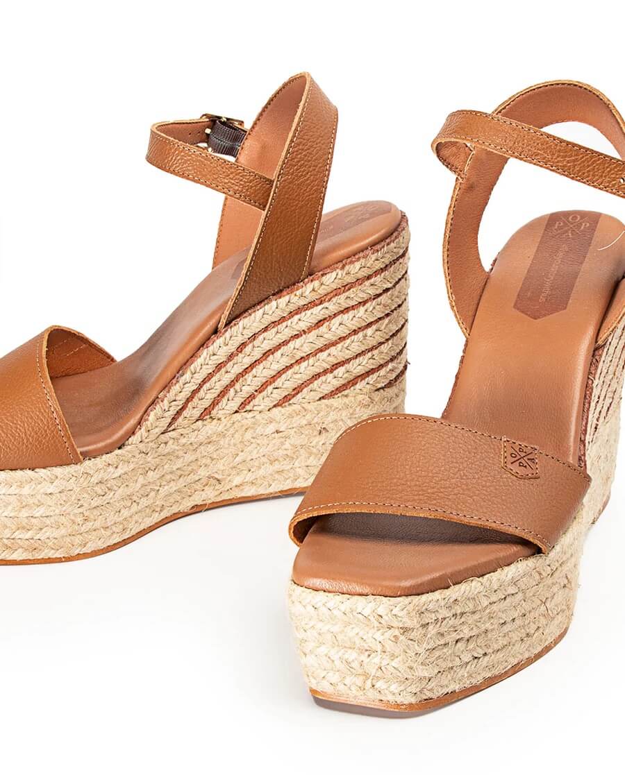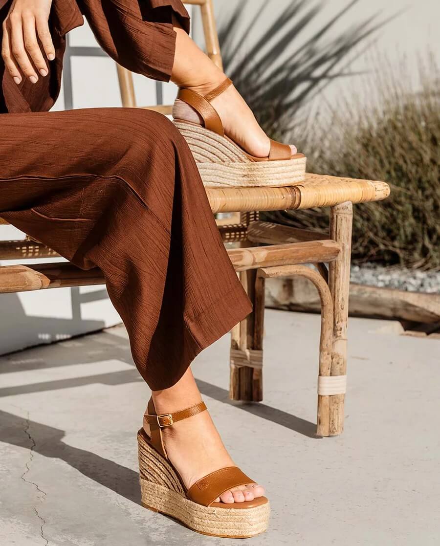 Sandalia Popa Kuta de piel en color cuero, con hebilla en el tobillo. La sandalia popa Kuta tiene una gran altura que estilizará cualquier look, y muy cómoda gracias a su plataforma. La planta esta realizada en piel vegana acolchada.