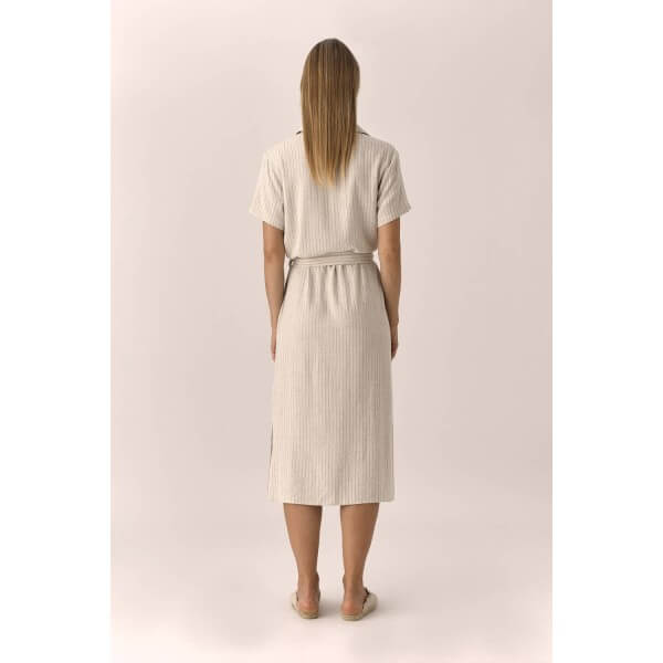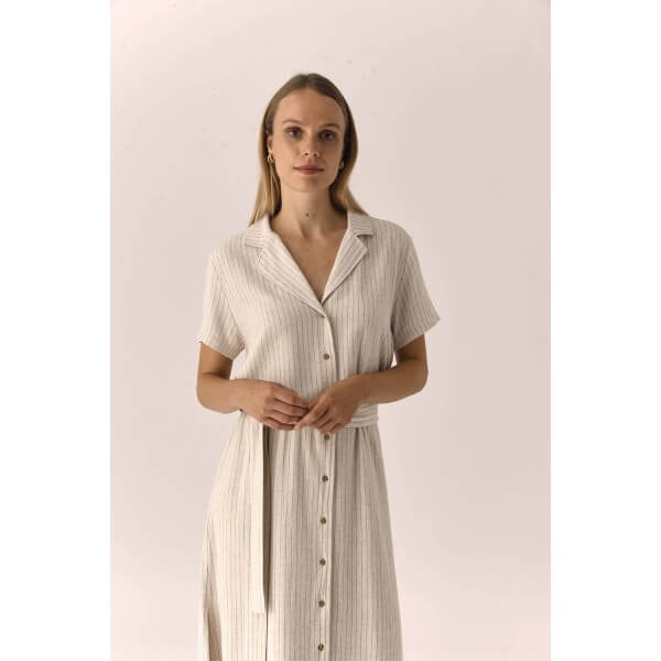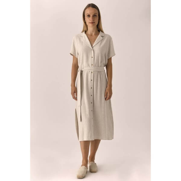 Vestido designers society kupla camisero de rayas marineras con cinturón y botonadura delantera. El vestido designers society kupla tiene una largura midi, y aberturas que le dan movilidad. Confeccionado en viscosa y lino.