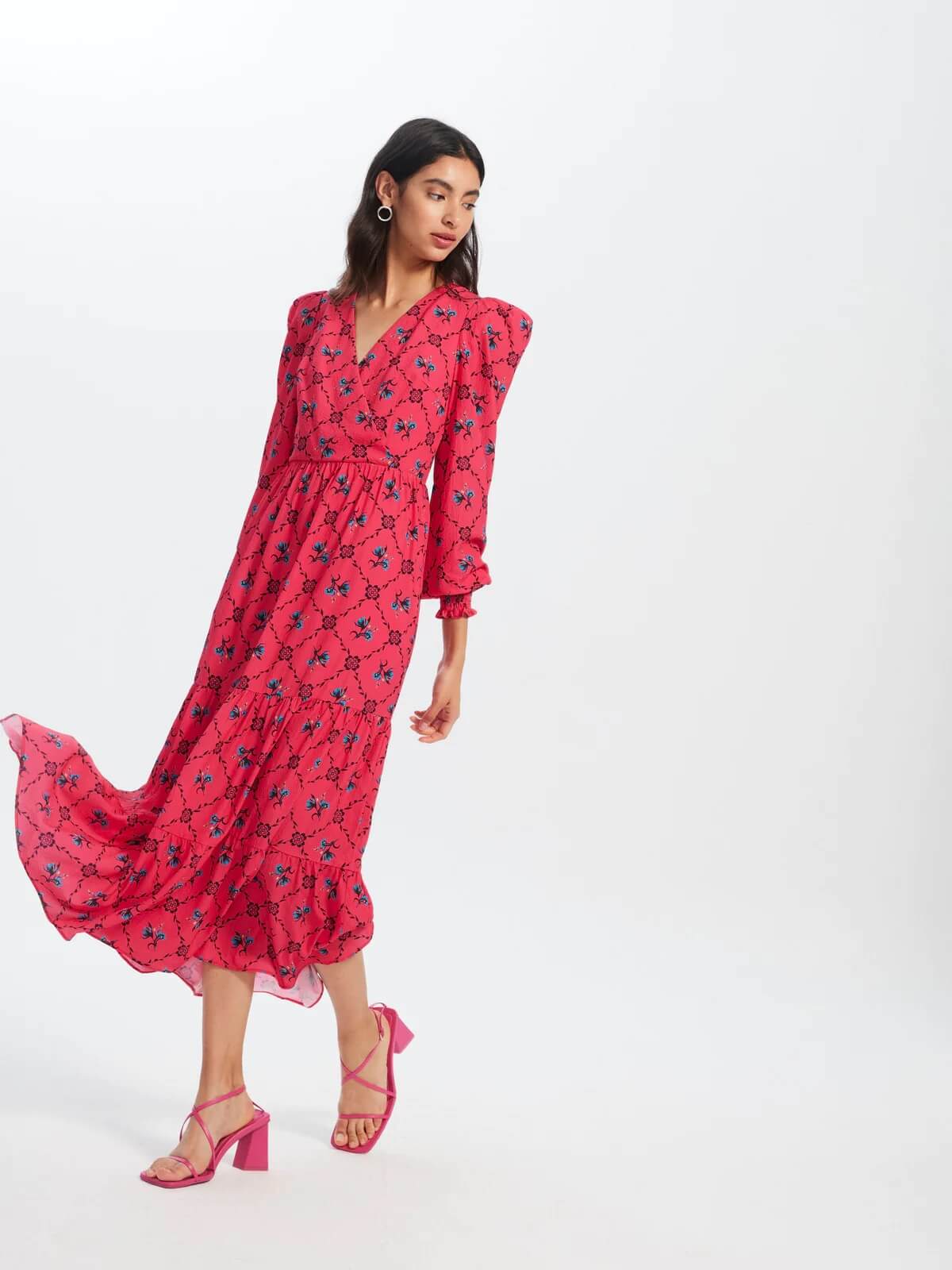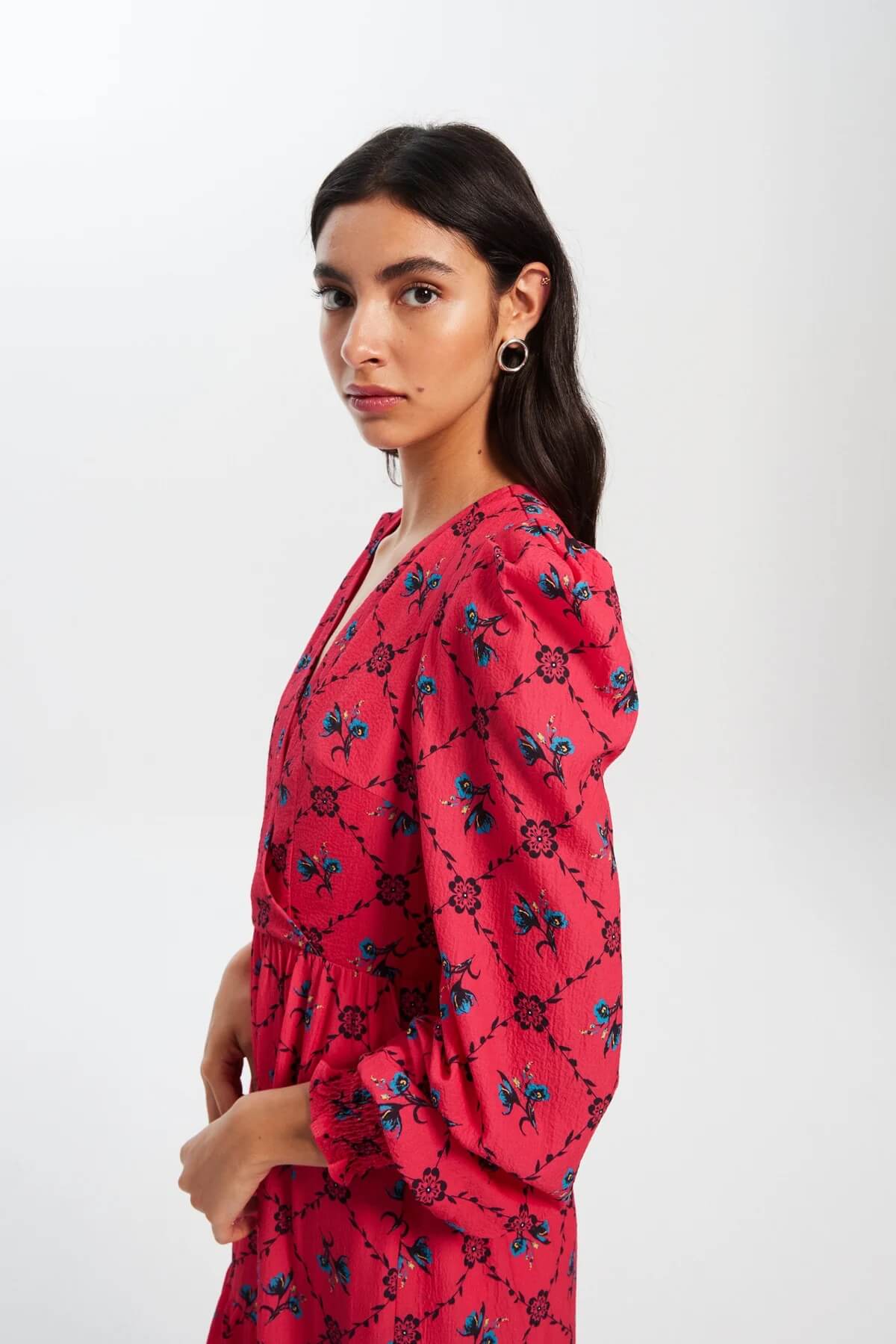Vestido mioh cecilia bloom estampado, de manga larga farol con hombreras, corte en la cintura y bolsillos. El vestido mioh cecilia bloom es perfecto para una fiesta o evento.