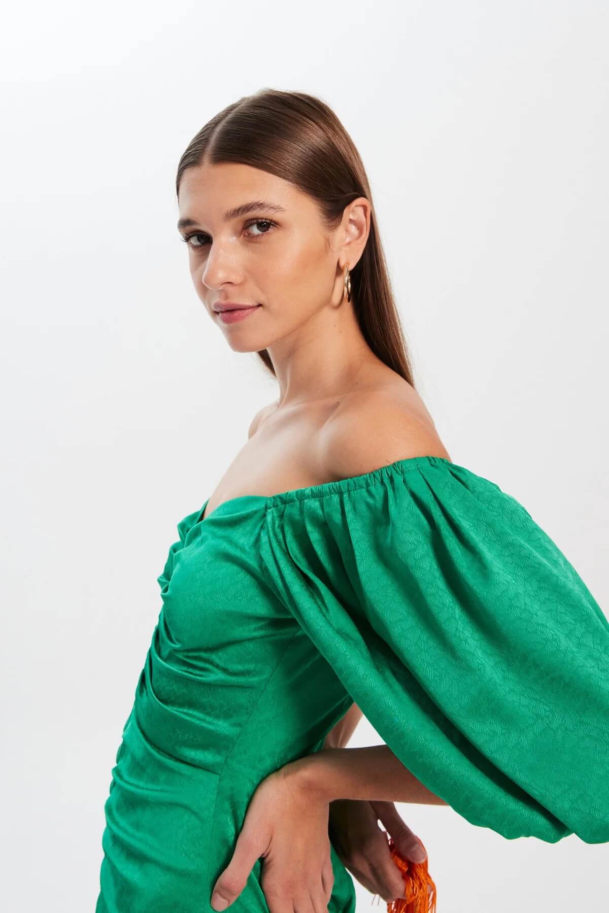 Vestido mioh julia verde con escote corazón, cuerpo drapeado y espalda recta con cremallera. El vestido mioh julia verde es perfecto para invitada de boda, con tejido jacquard.