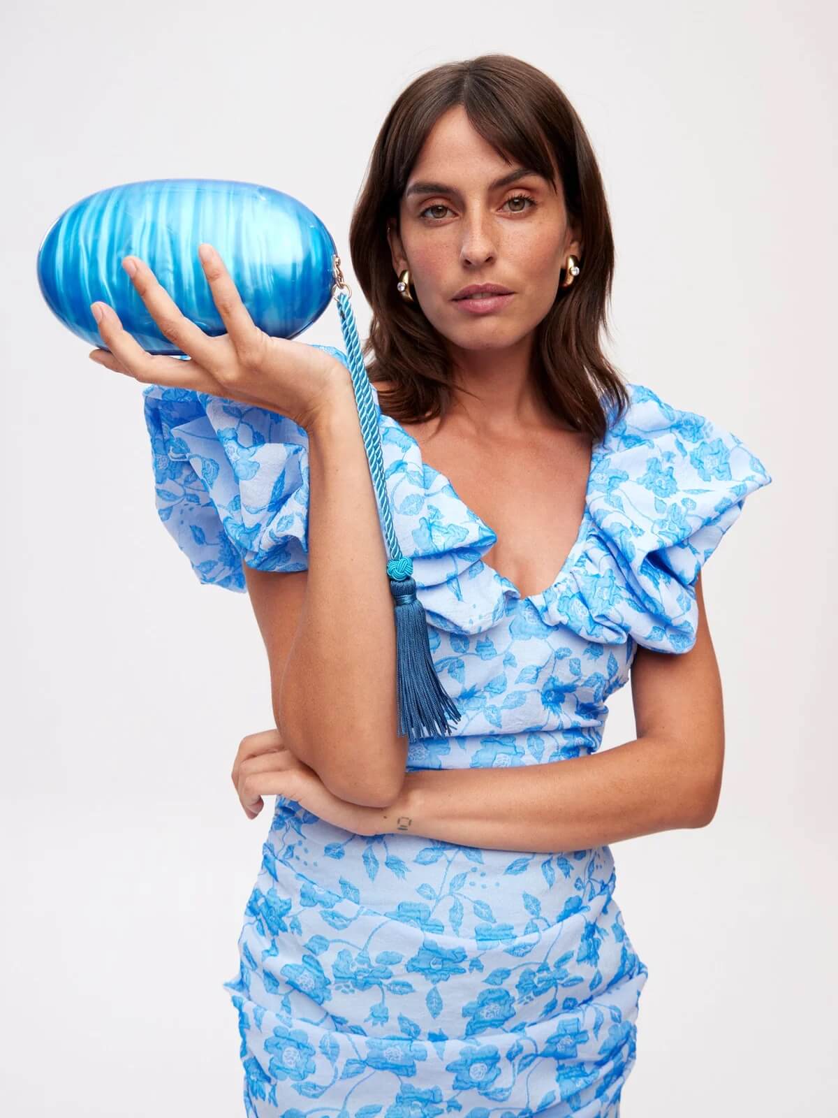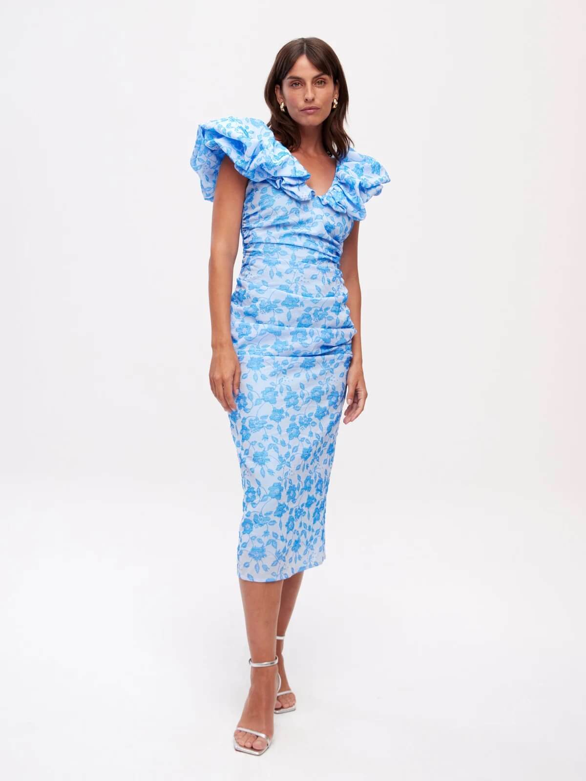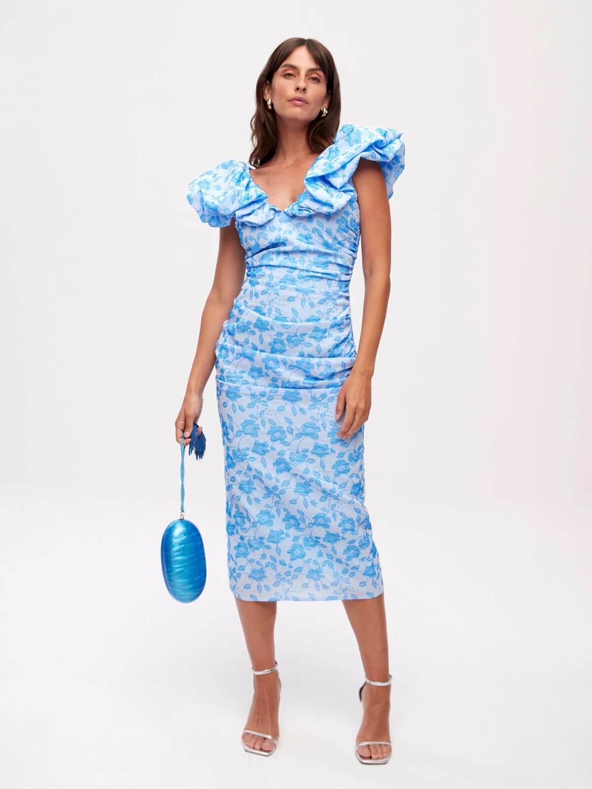 Vestido Mioh Tropez Damasco azul estampado con volumen posicional en el escote.