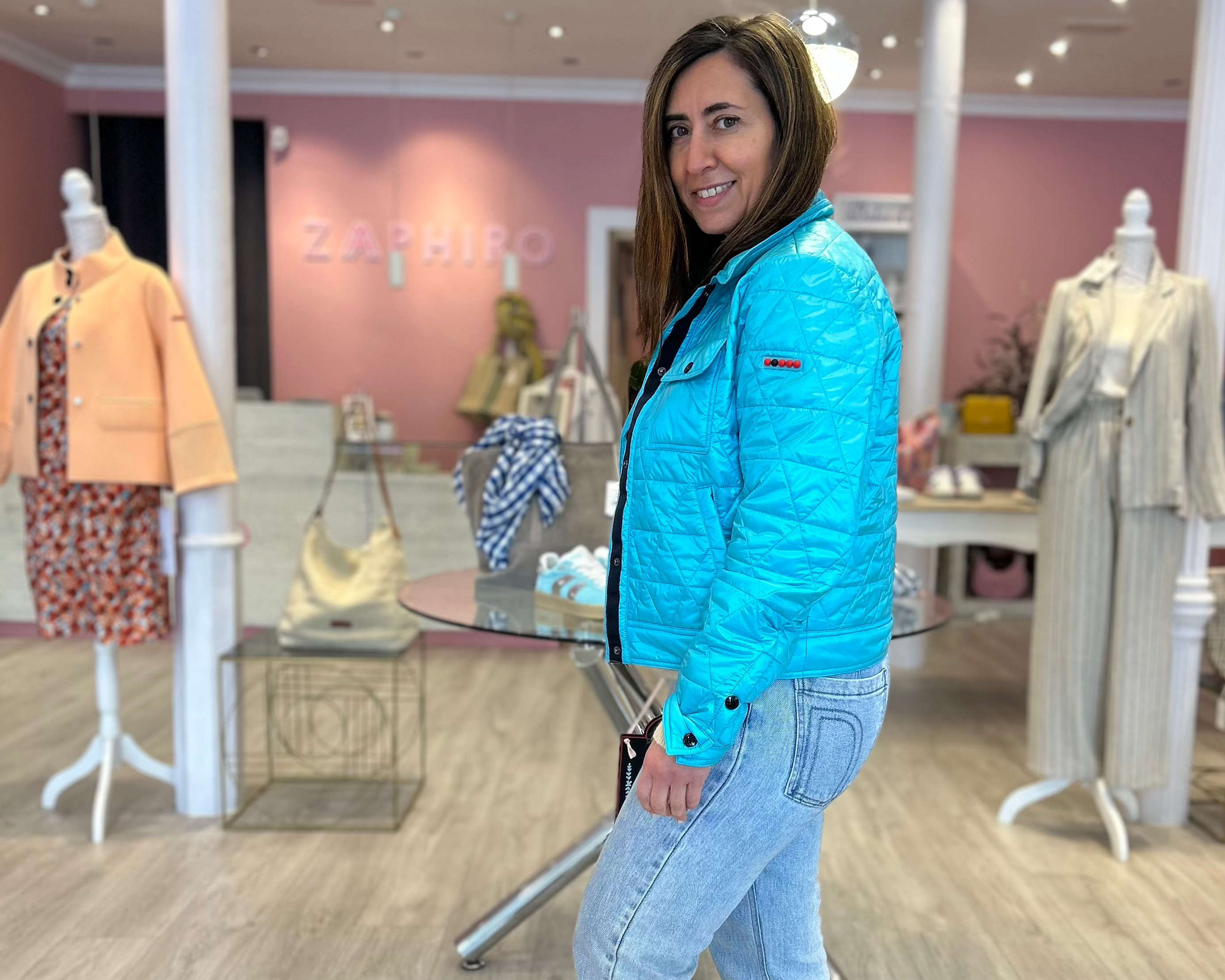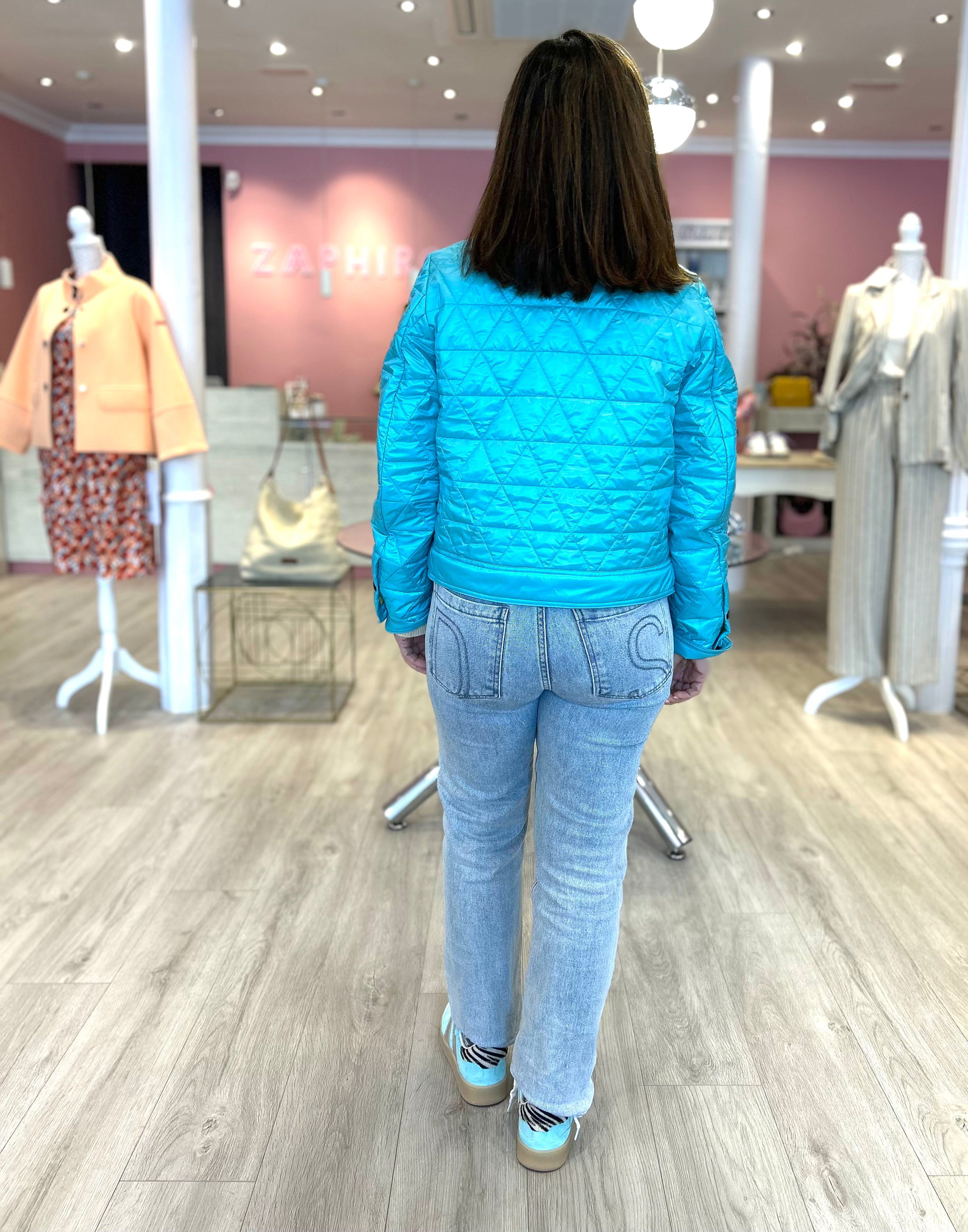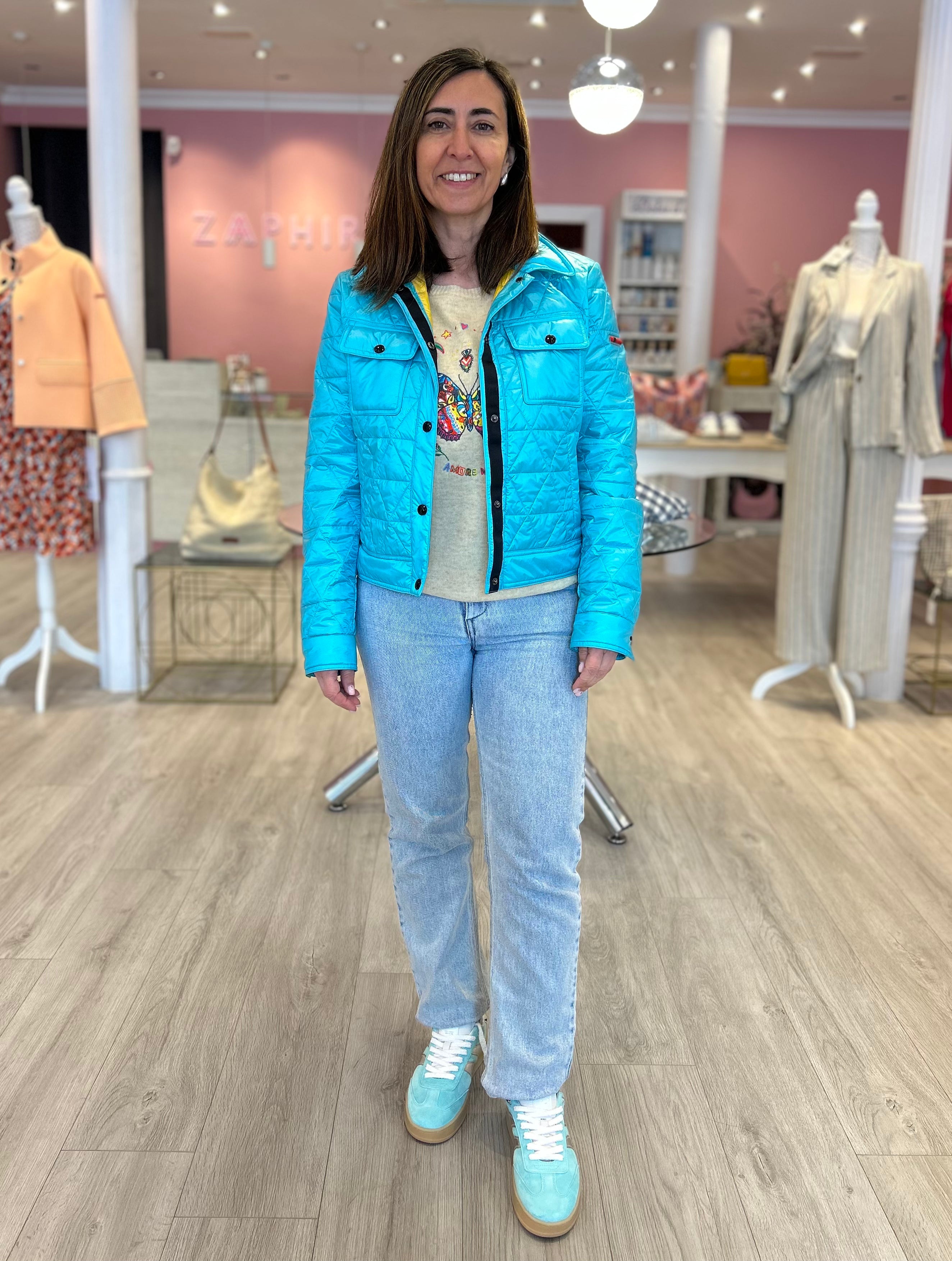 Abrigo DICHI Ashera en color azul con un tejido contrastado, brillante en la parte delantera y trasera.