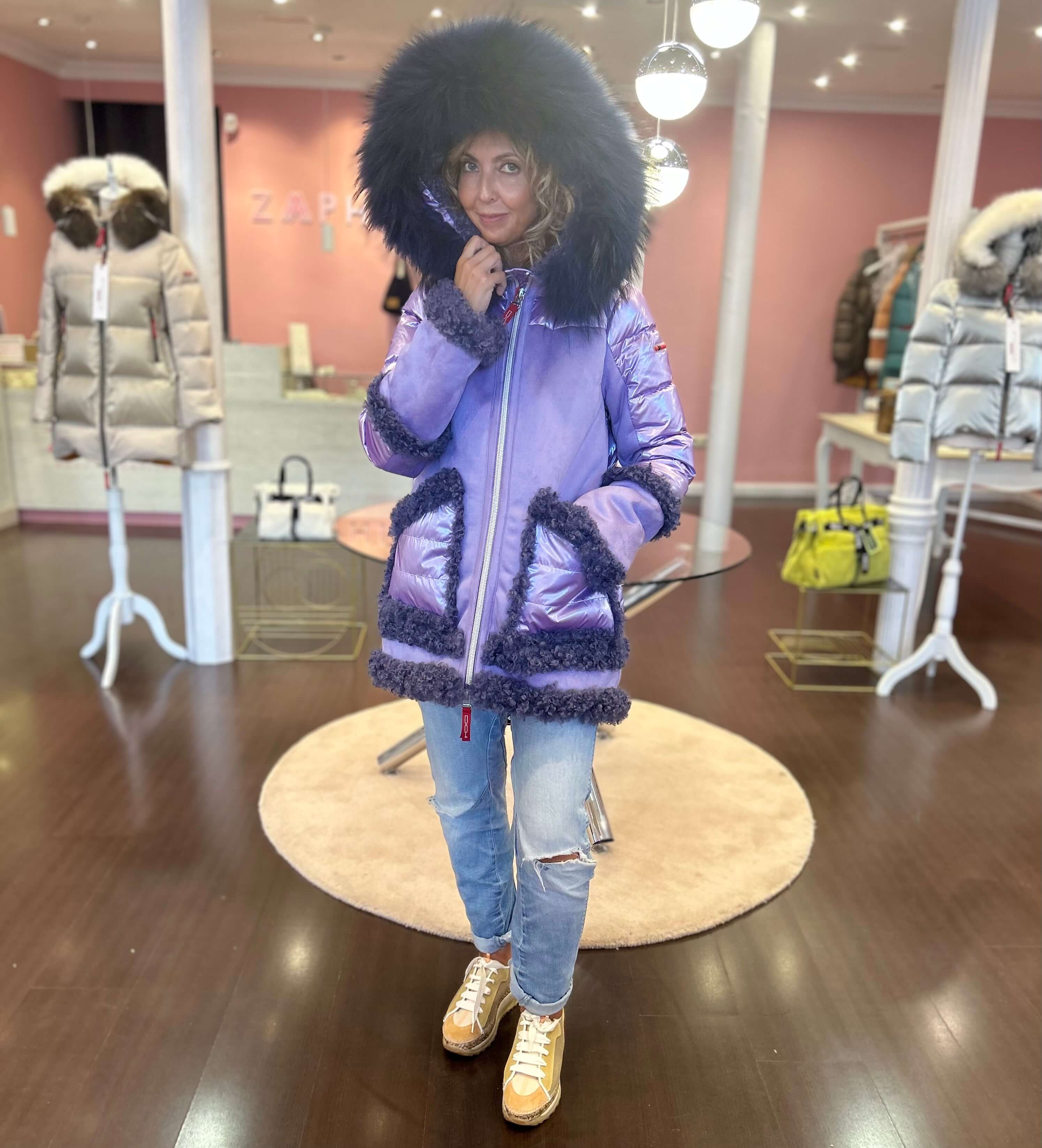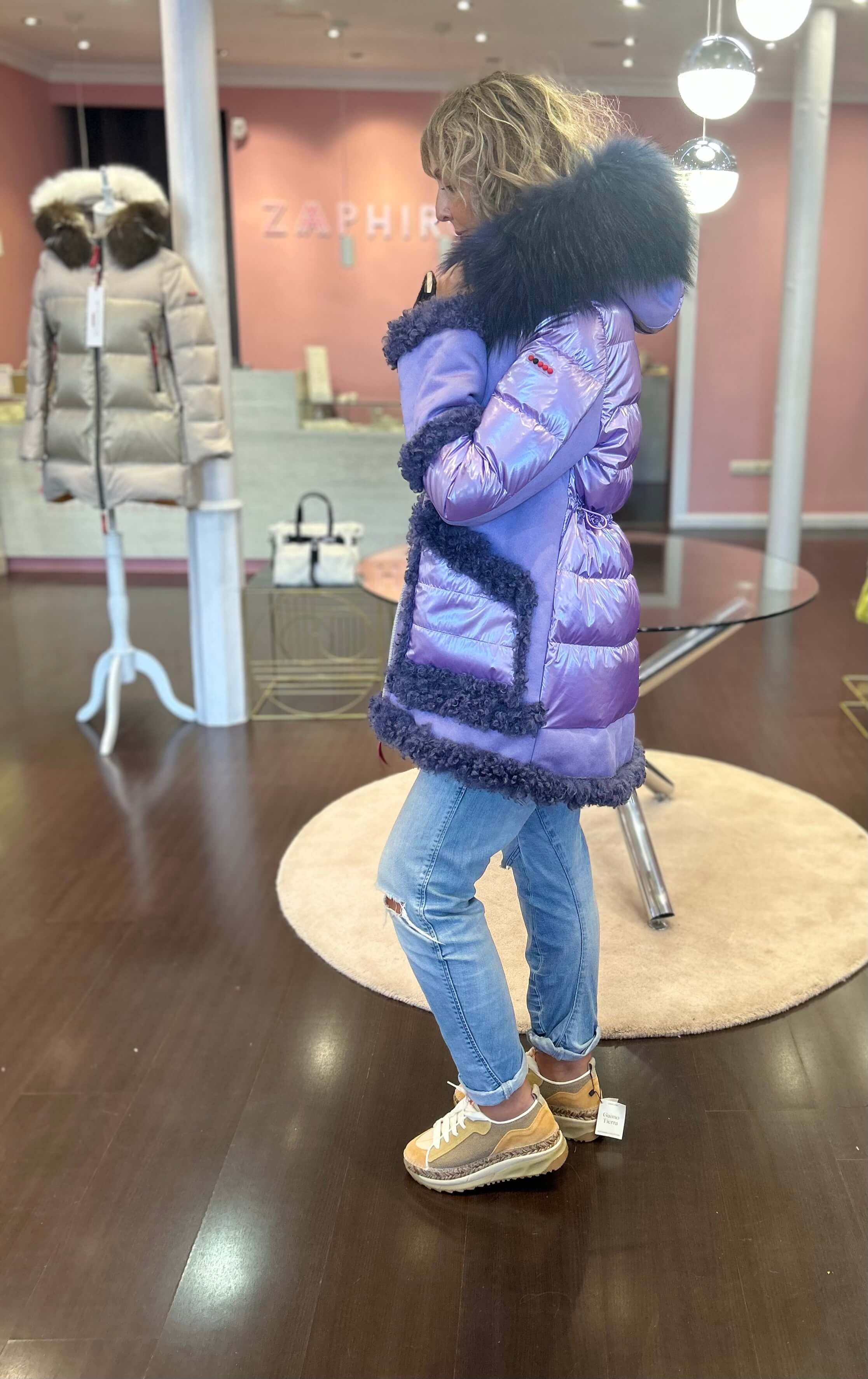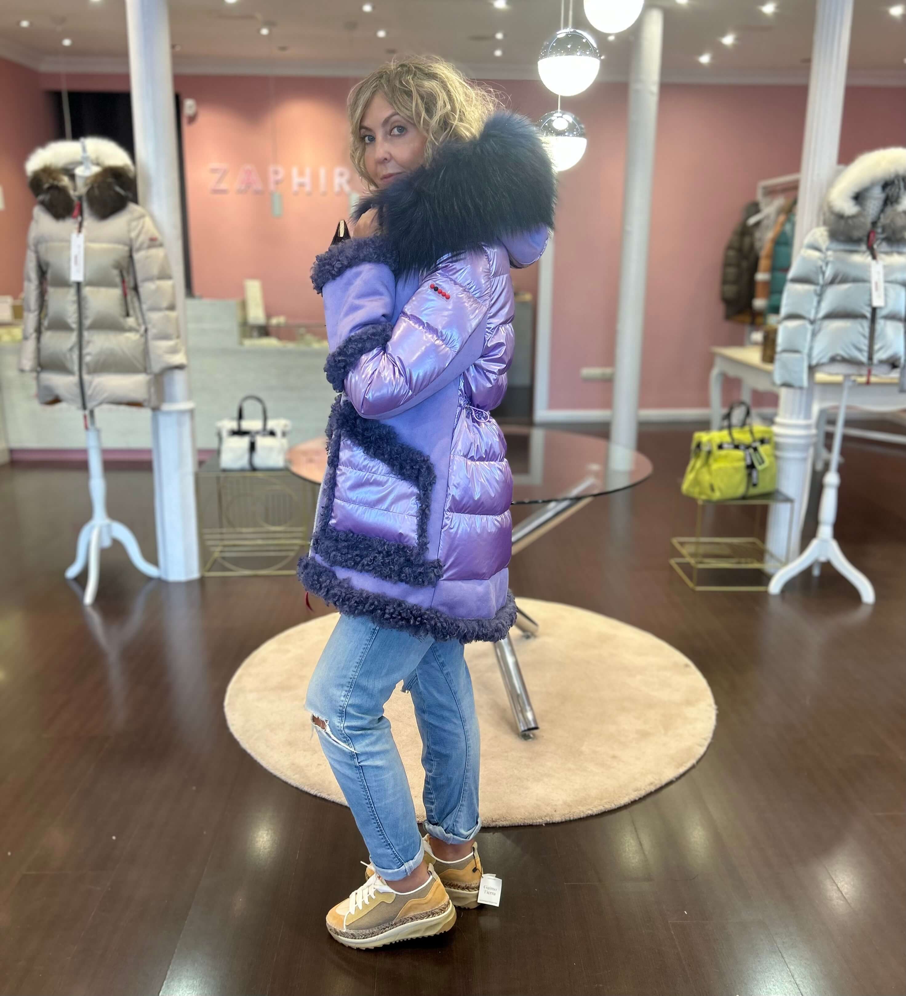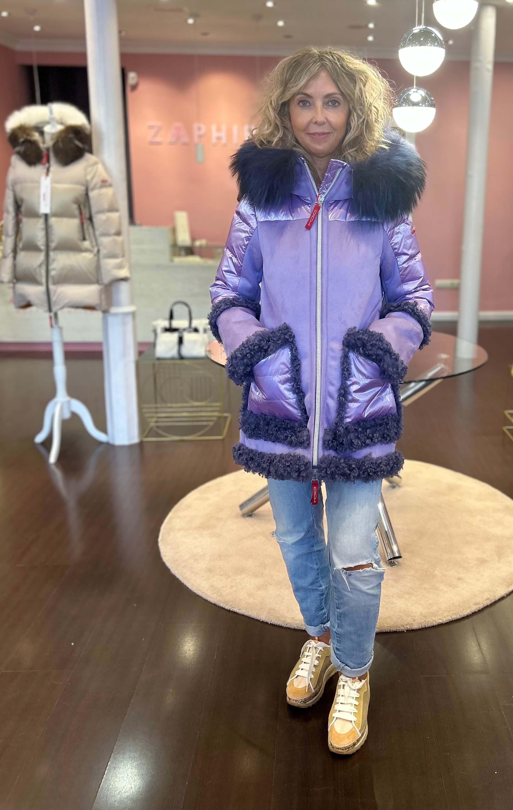 Abrigo Dichi Orsa en color malva, contraste de tejidos y pelo natural al tono. El abrigo Dichi Orsa es elegante y cálido, relleno 90% de plumón de pato y borreguillo.