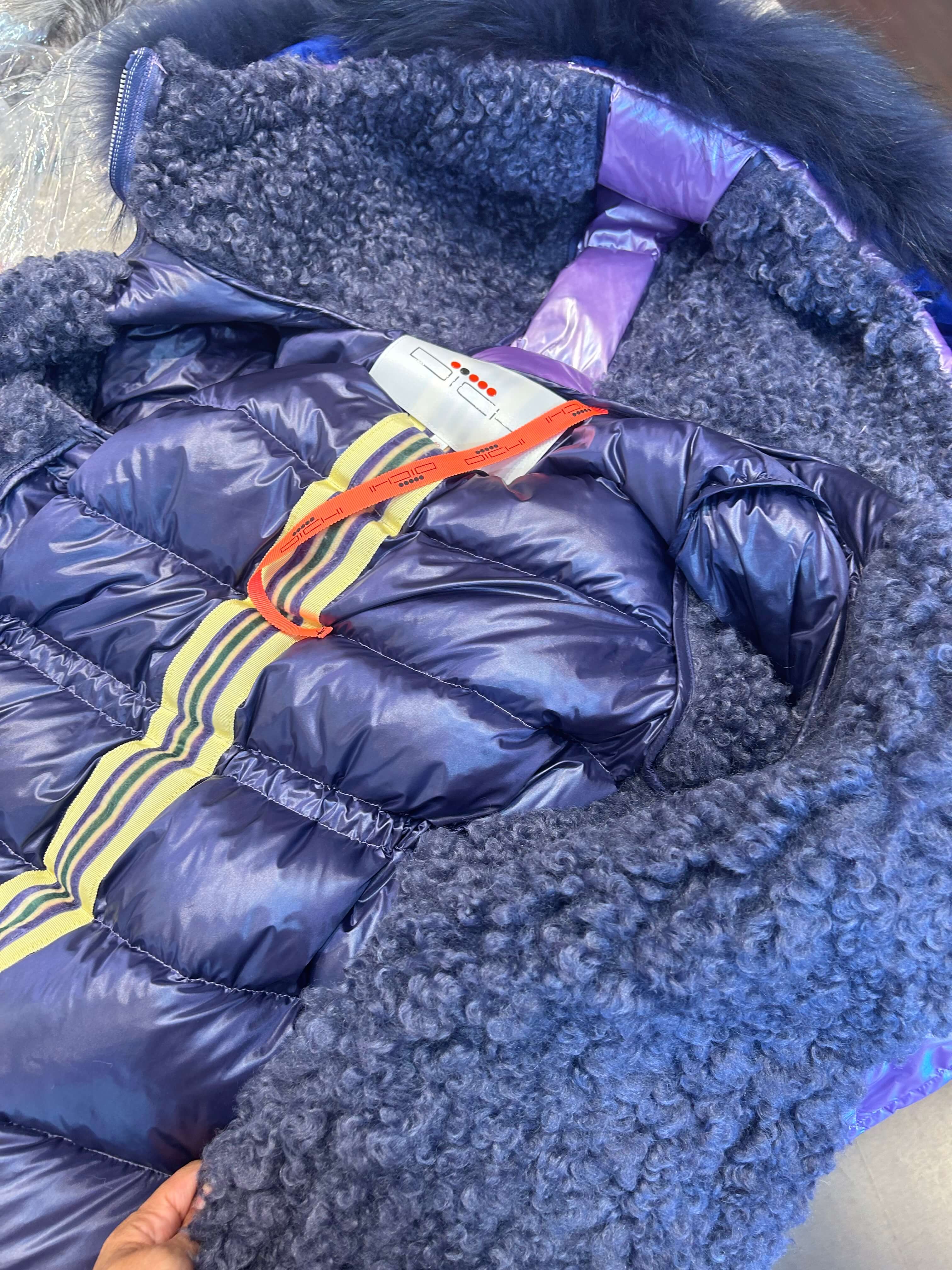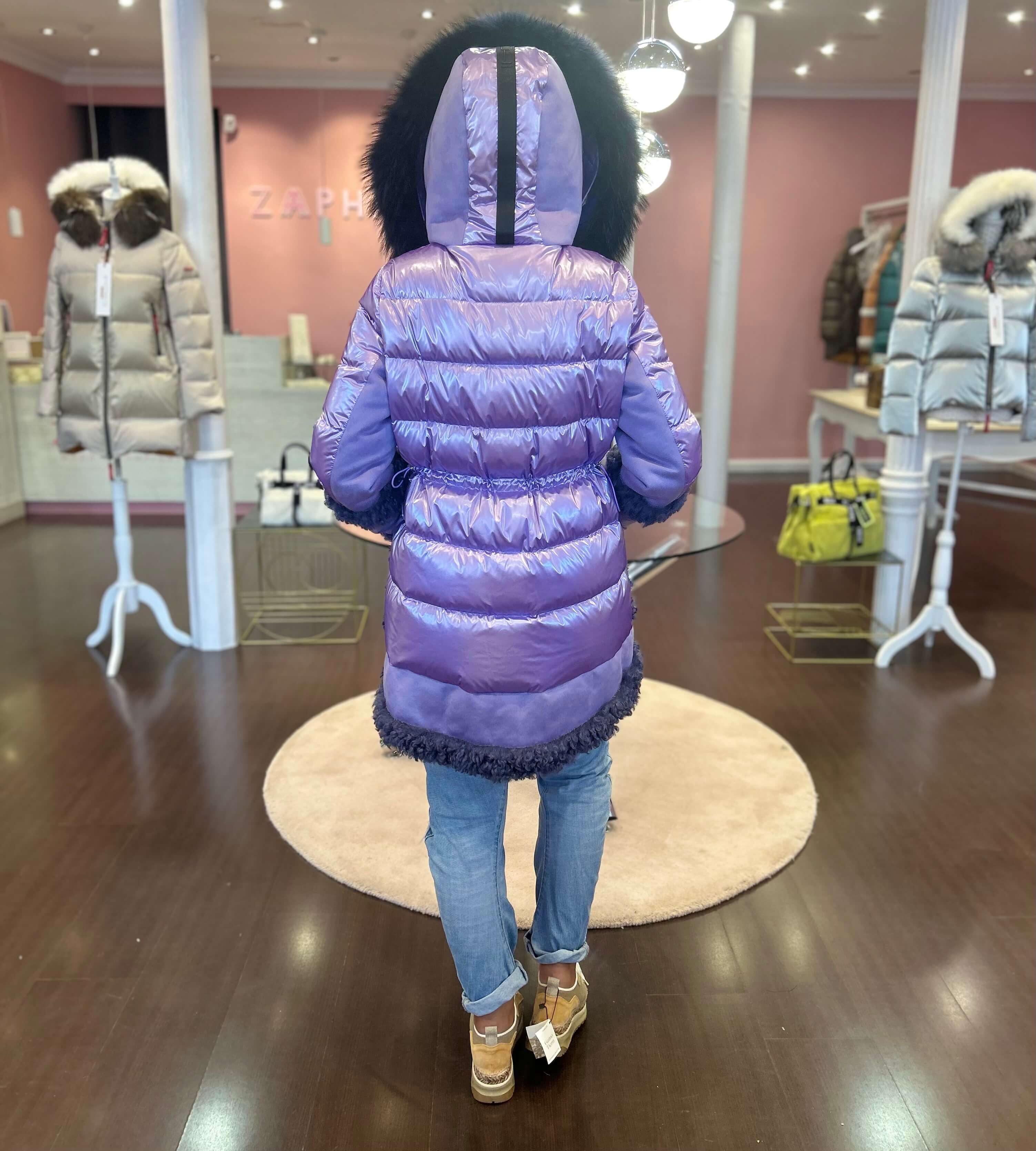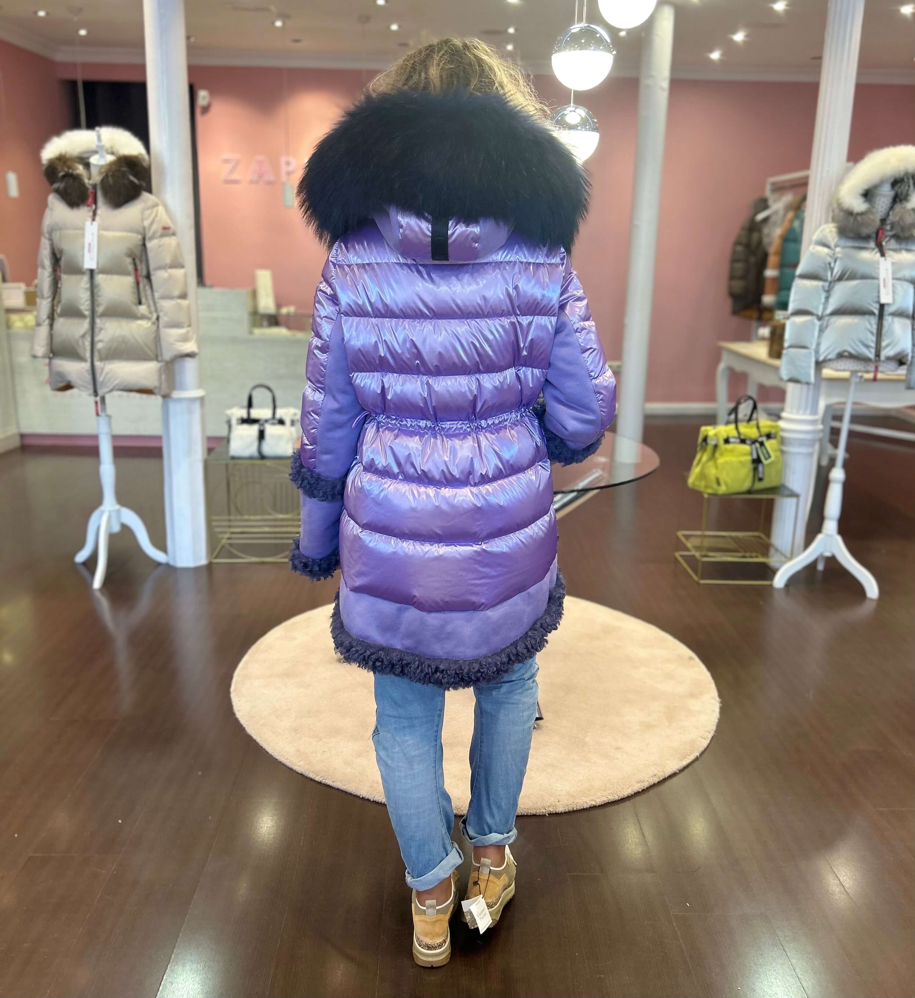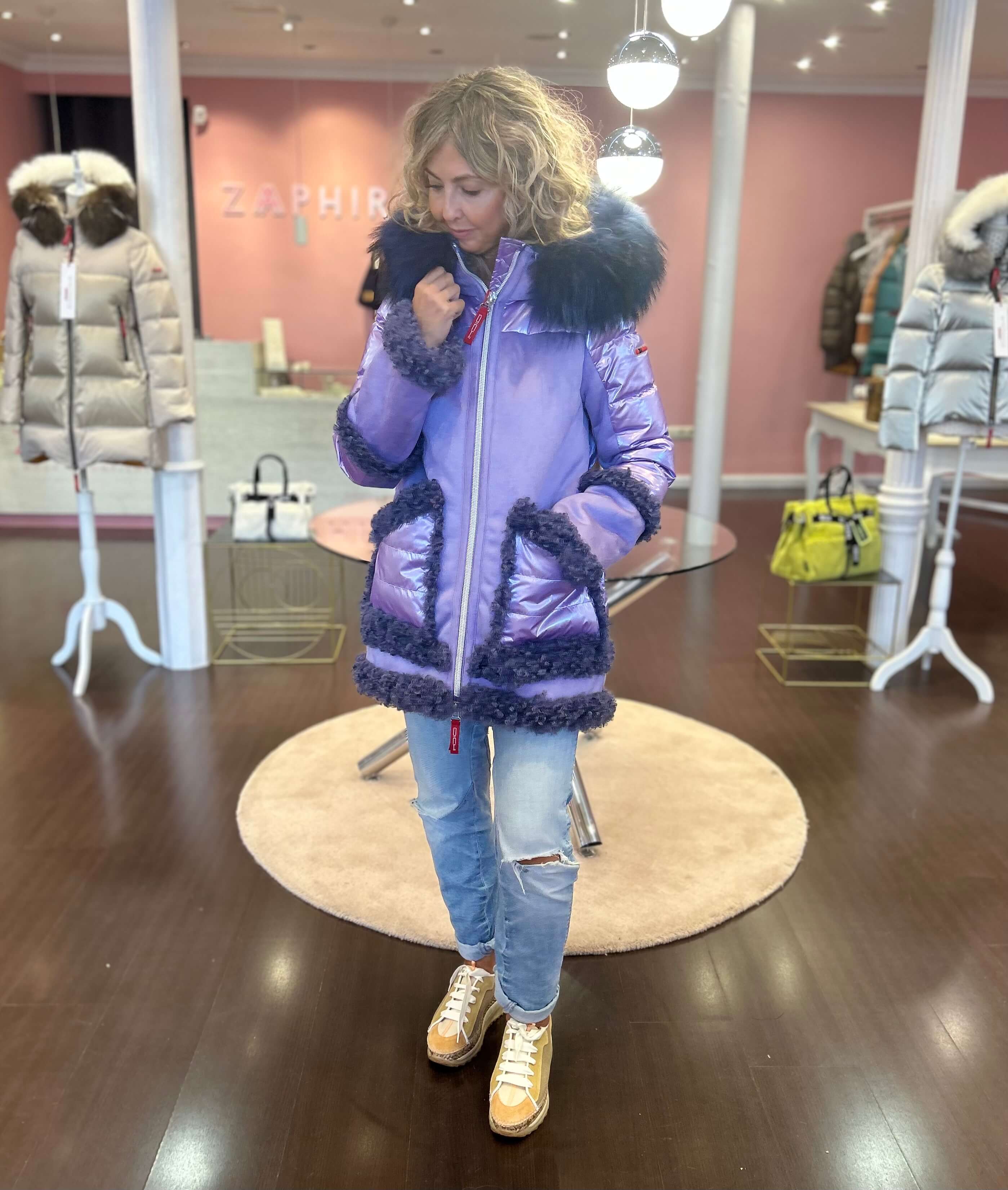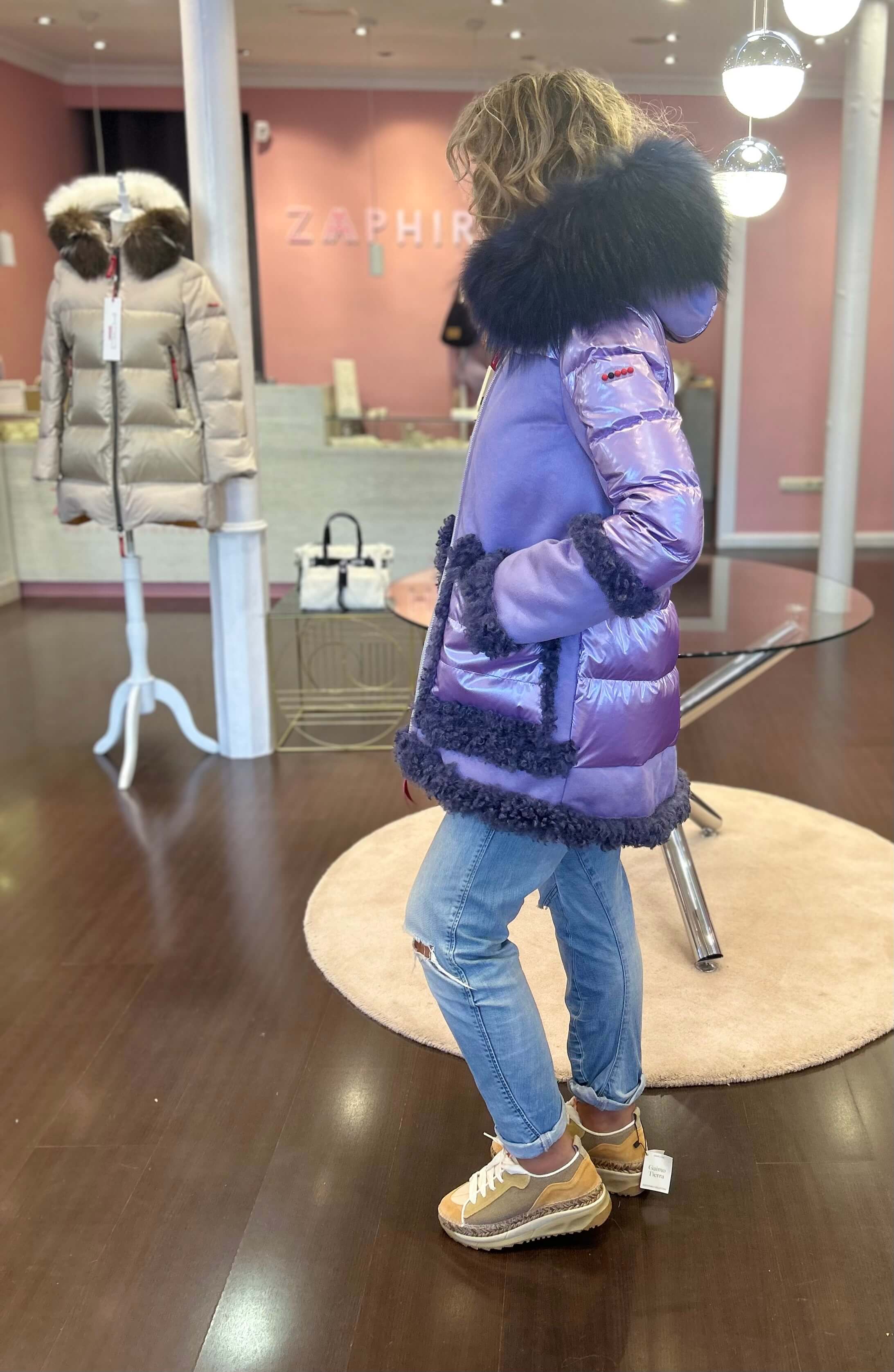 Abrigo Dichi Orsa en color malva, contraste de tejidos y pelo natural al tono. El abrigo Dichi Orsa es elegante y cálido, relleno 90% de plumón de pato y borreguillo.