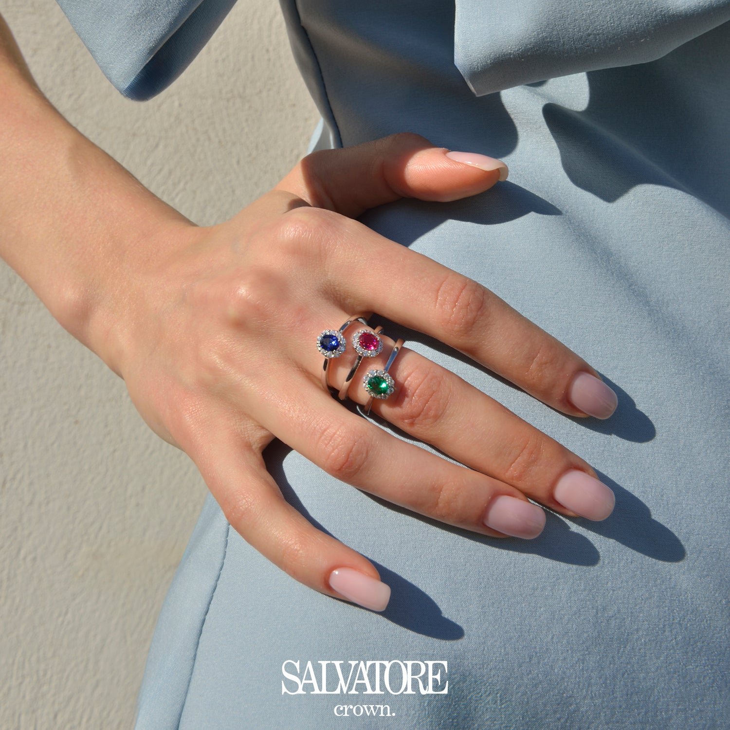 Anillo SALVATORE PLATA 136S0415 en plata con circonita zafiro ovalada en el centro y circonitas blancas alrededor.