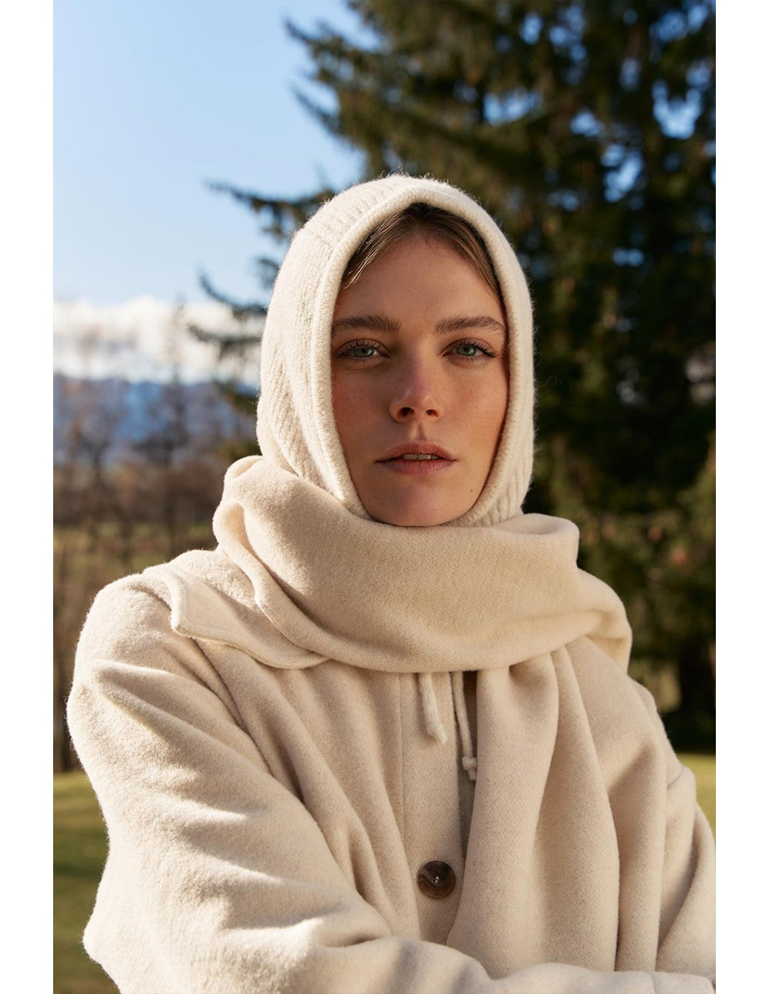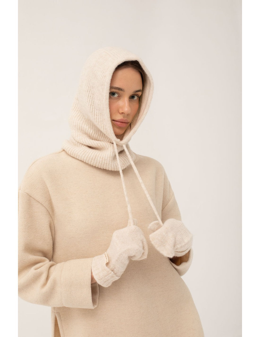 Balaclava Mus & Bombon Vezi en color crudo de punto con cordón ajustable.