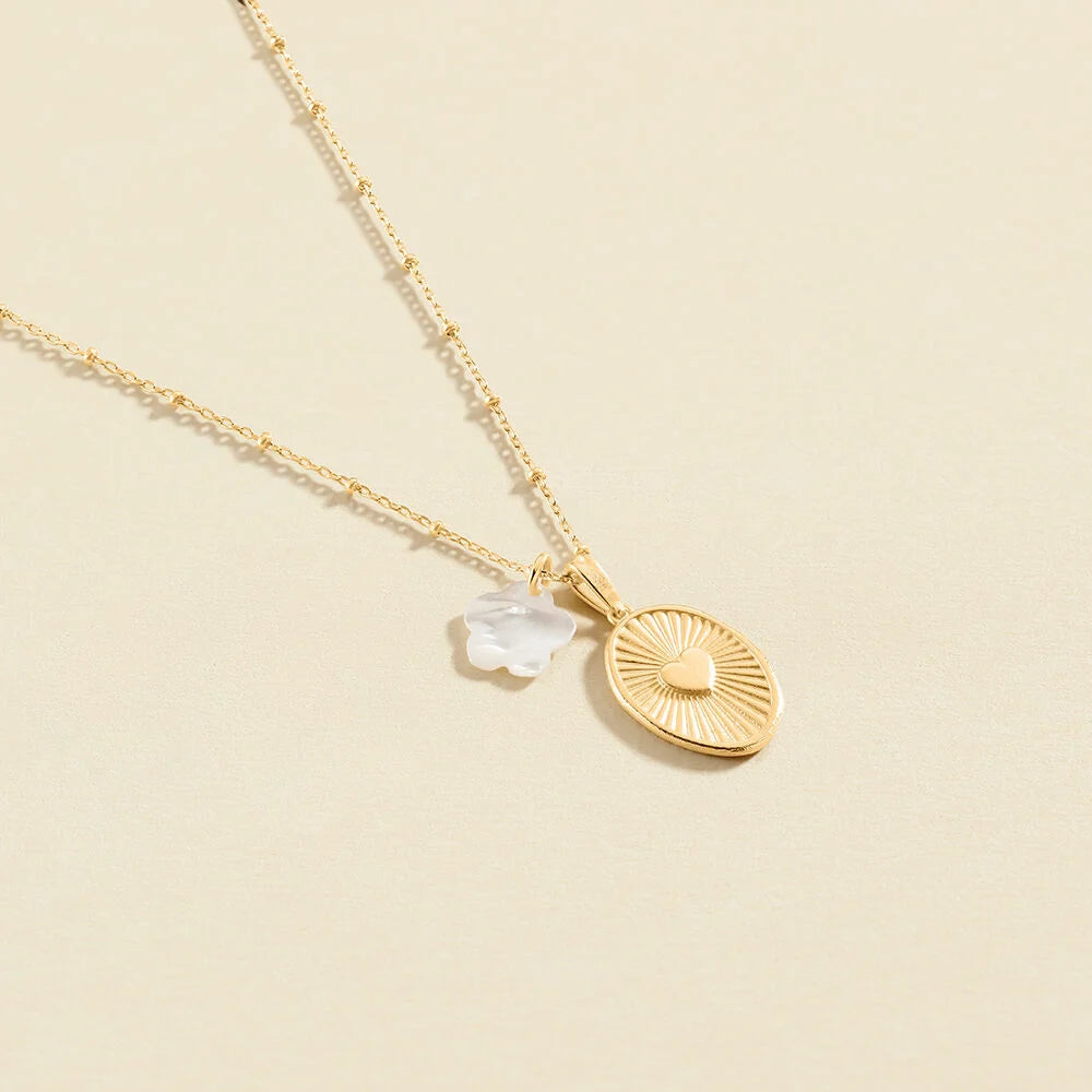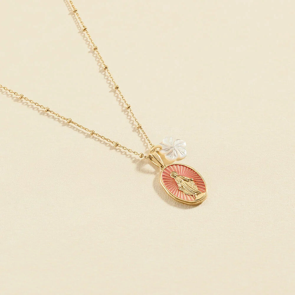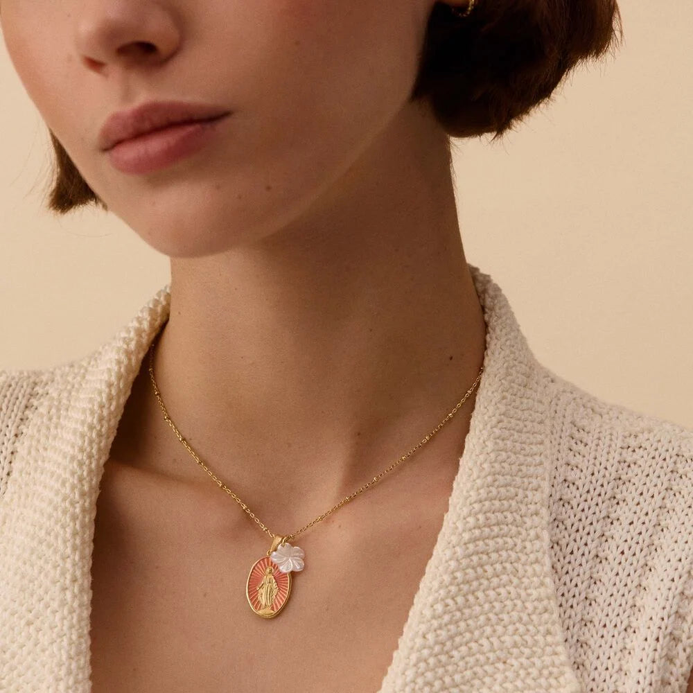 Collar Agatha Paris Twlight naranja con medalla de la Virgen esmaltada y colgante de flor de nácar.