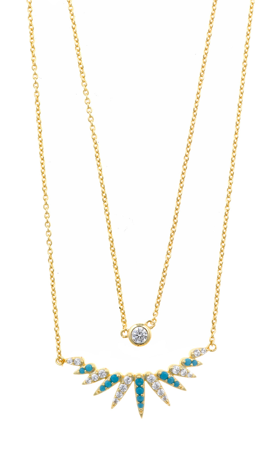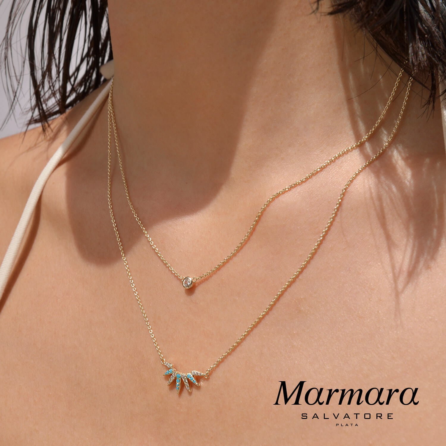 Collar Salvatore Plata con doble cadena, la cadena mas corta con circonita y la mas larga con turquesitas. El collar salvatore plata doble es ideal, no querrás quitártelo este verano. Hecho en plata de ley con baño de oro.