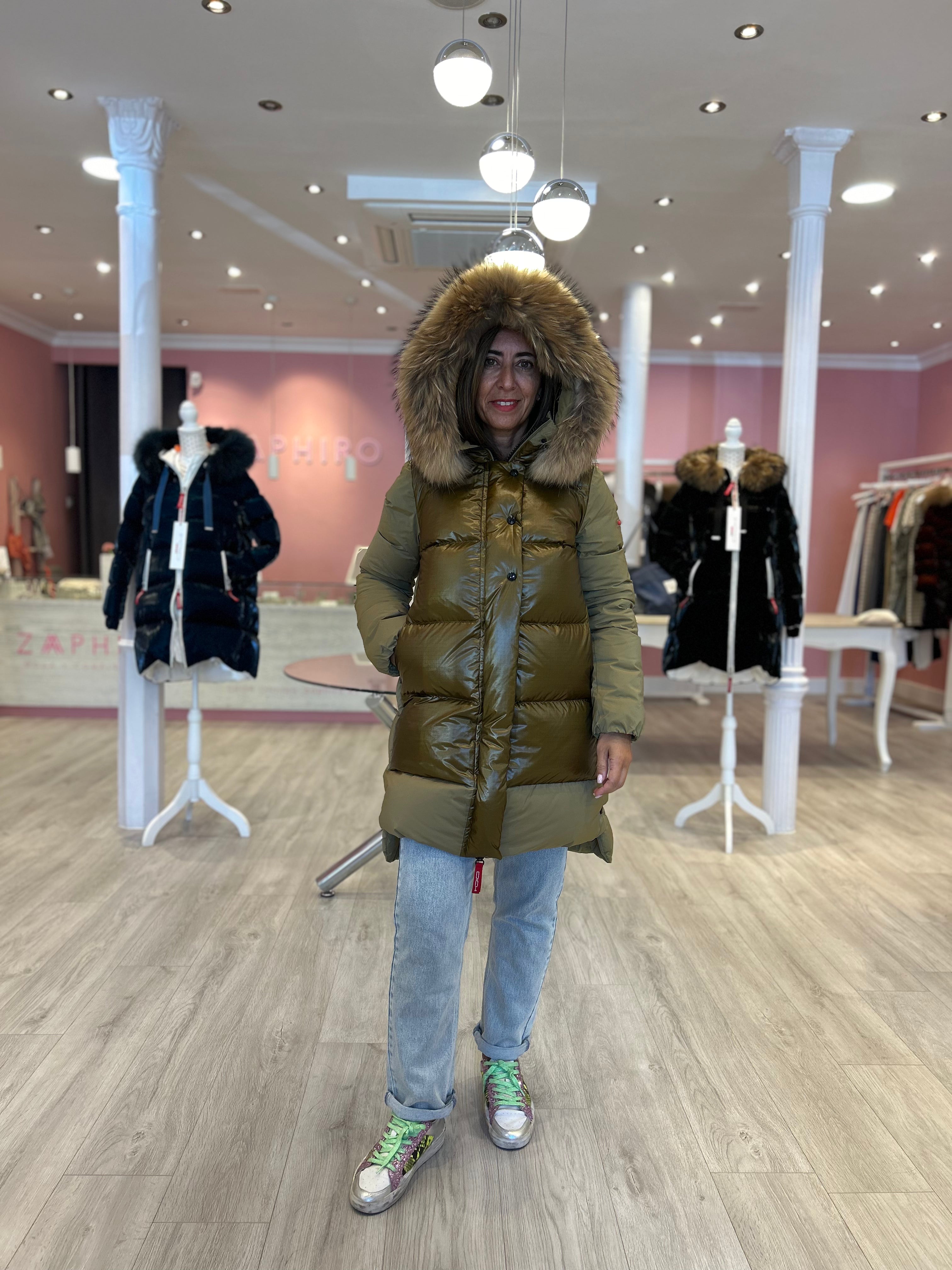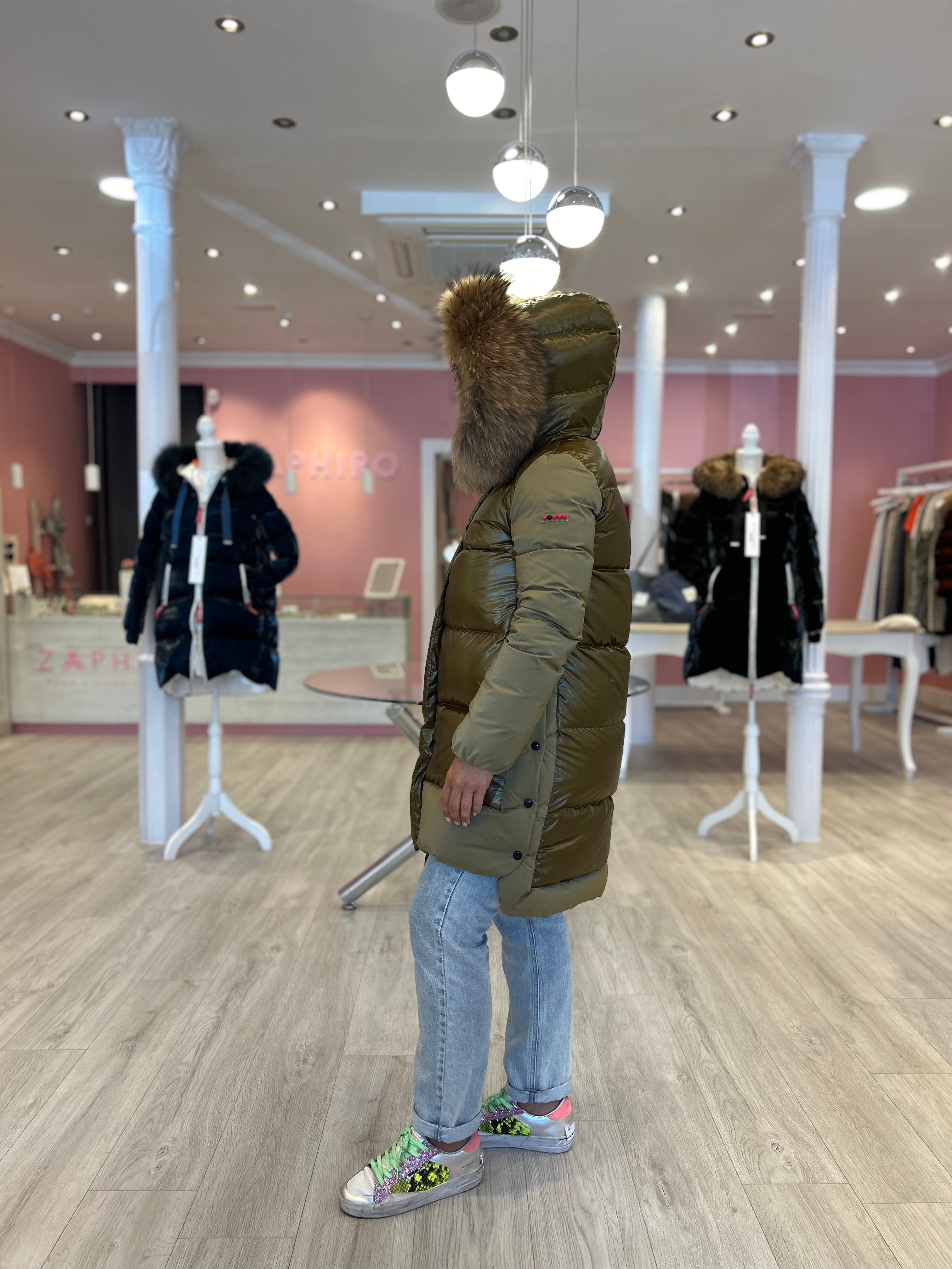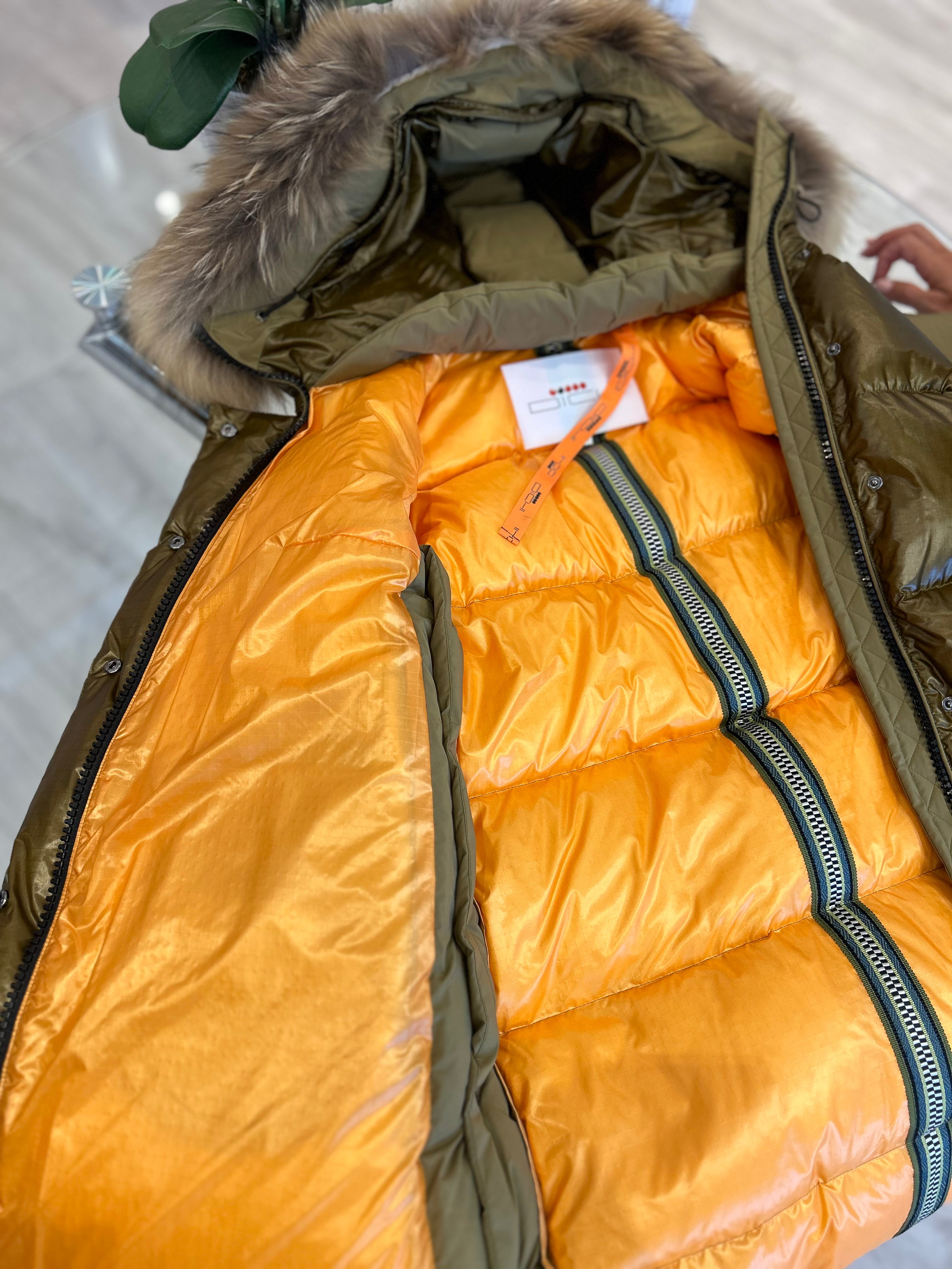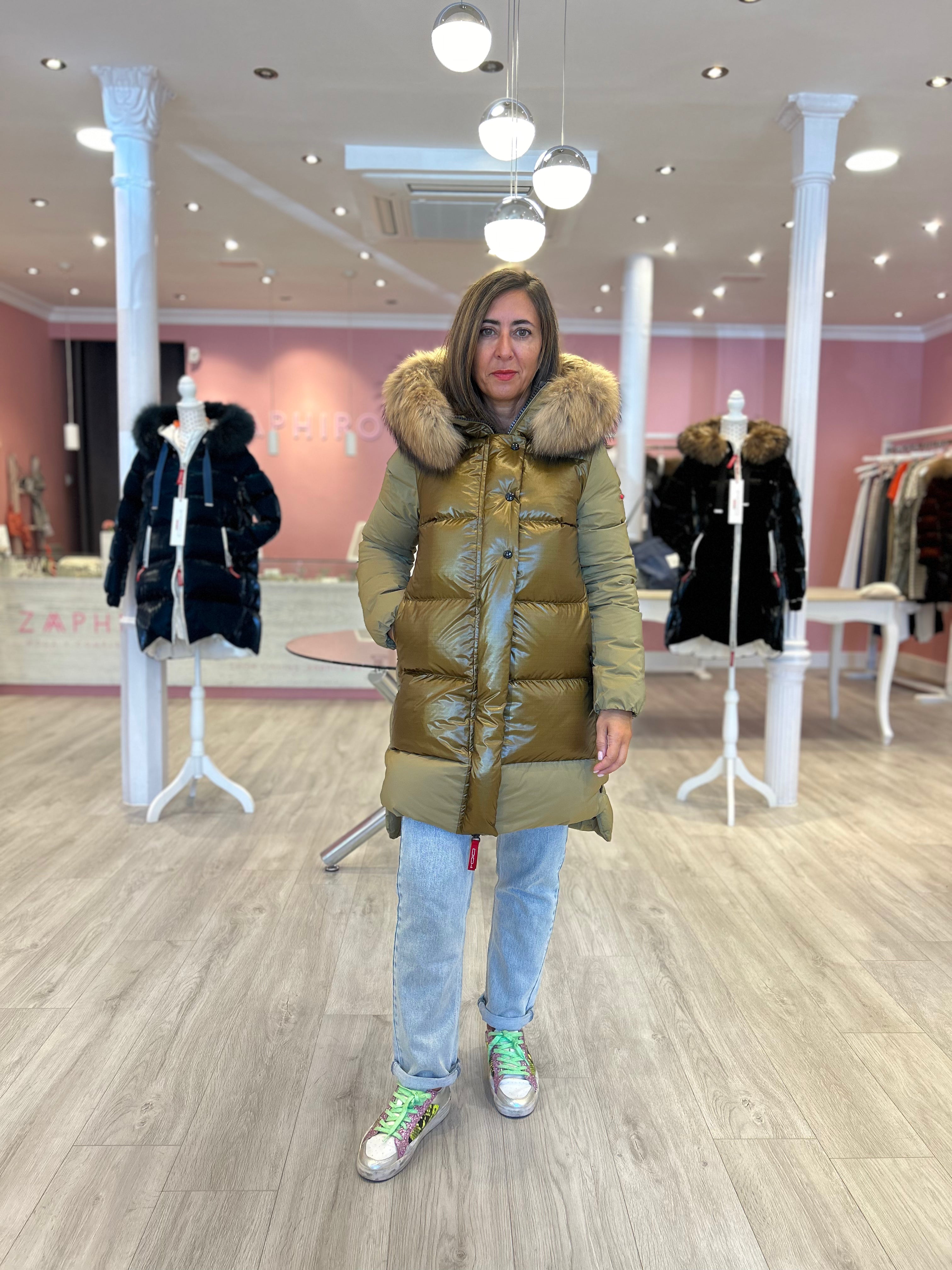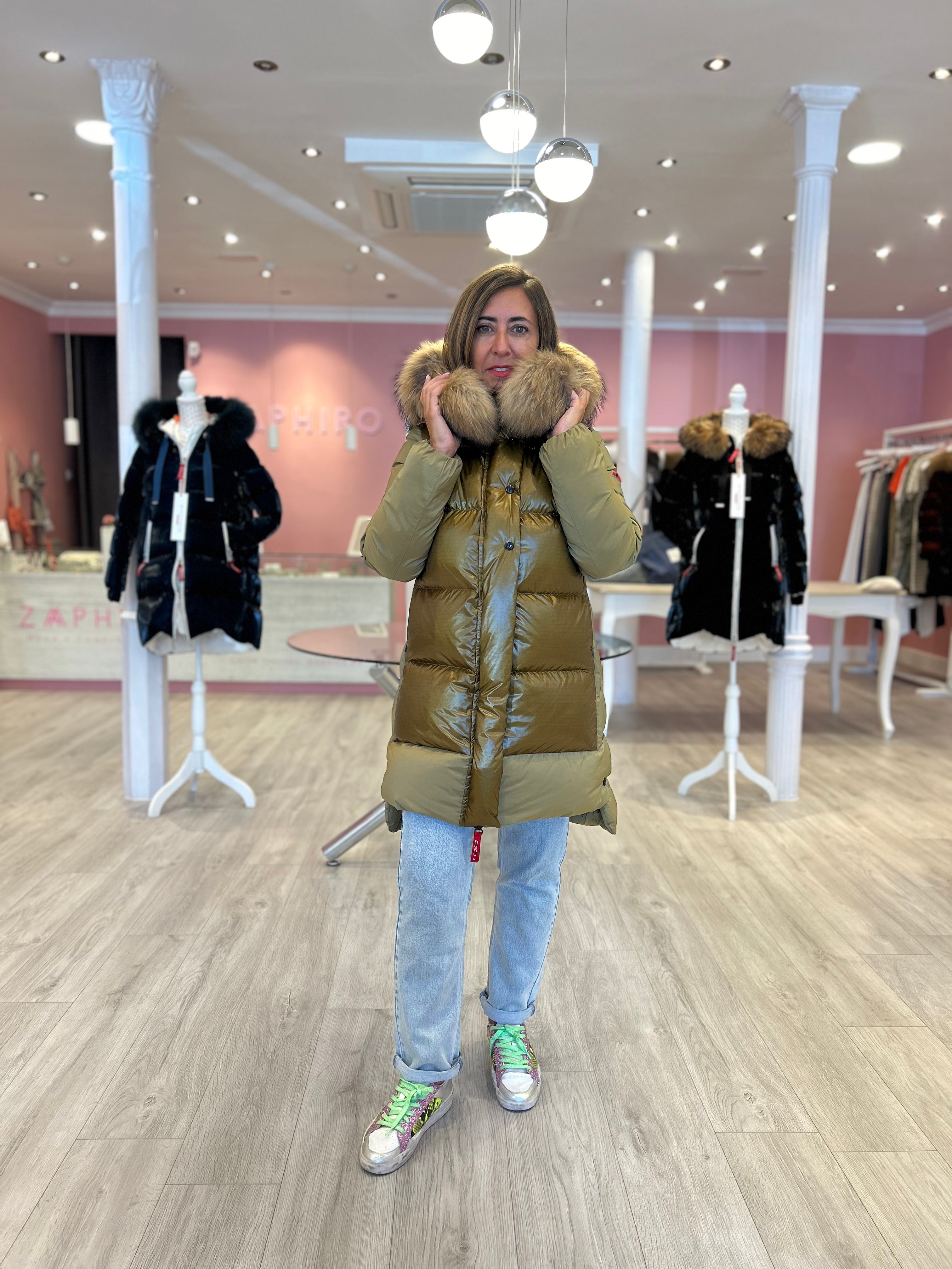 Plumífero Dichi Ariane en tono verde caqui y con pelo natural desmontable.