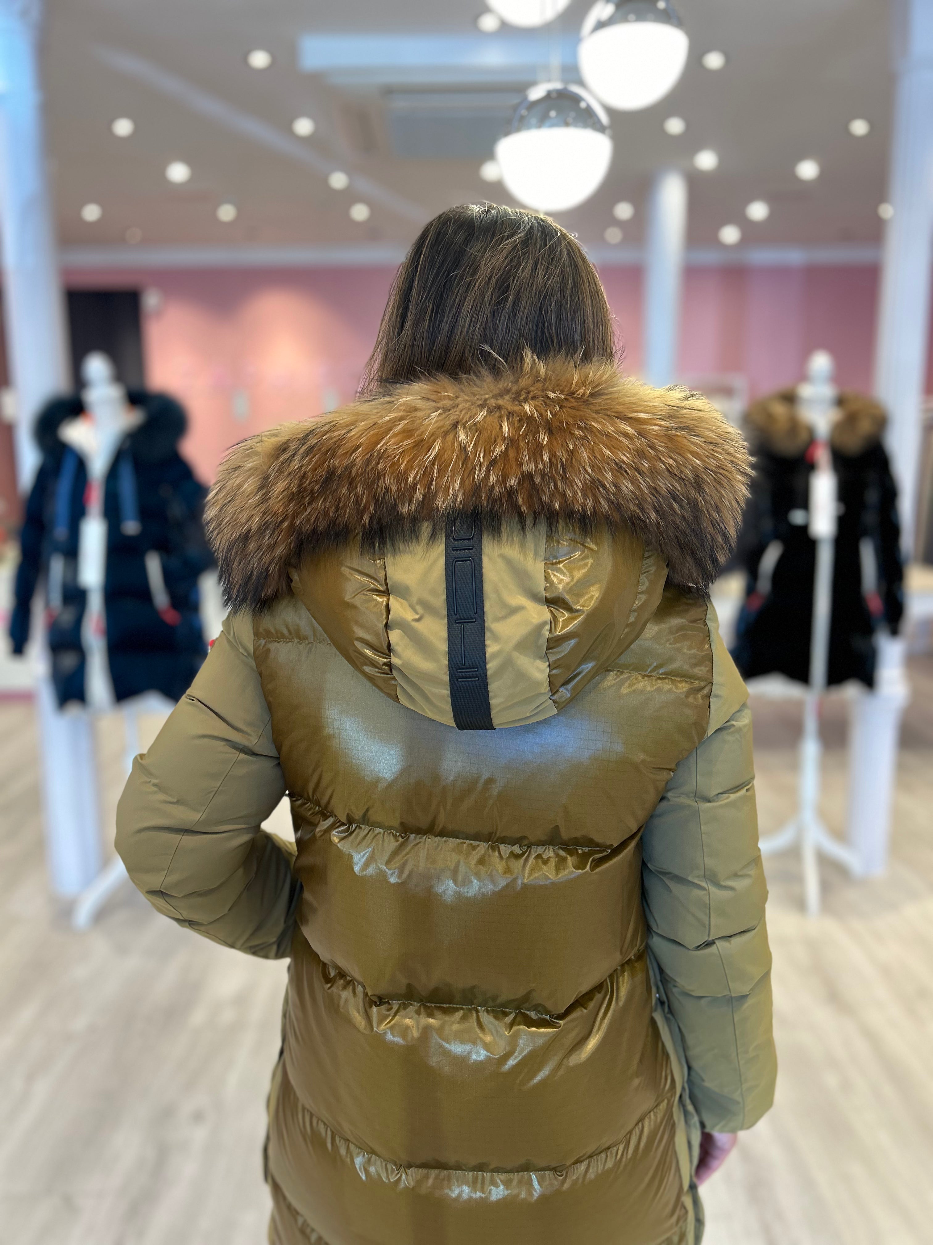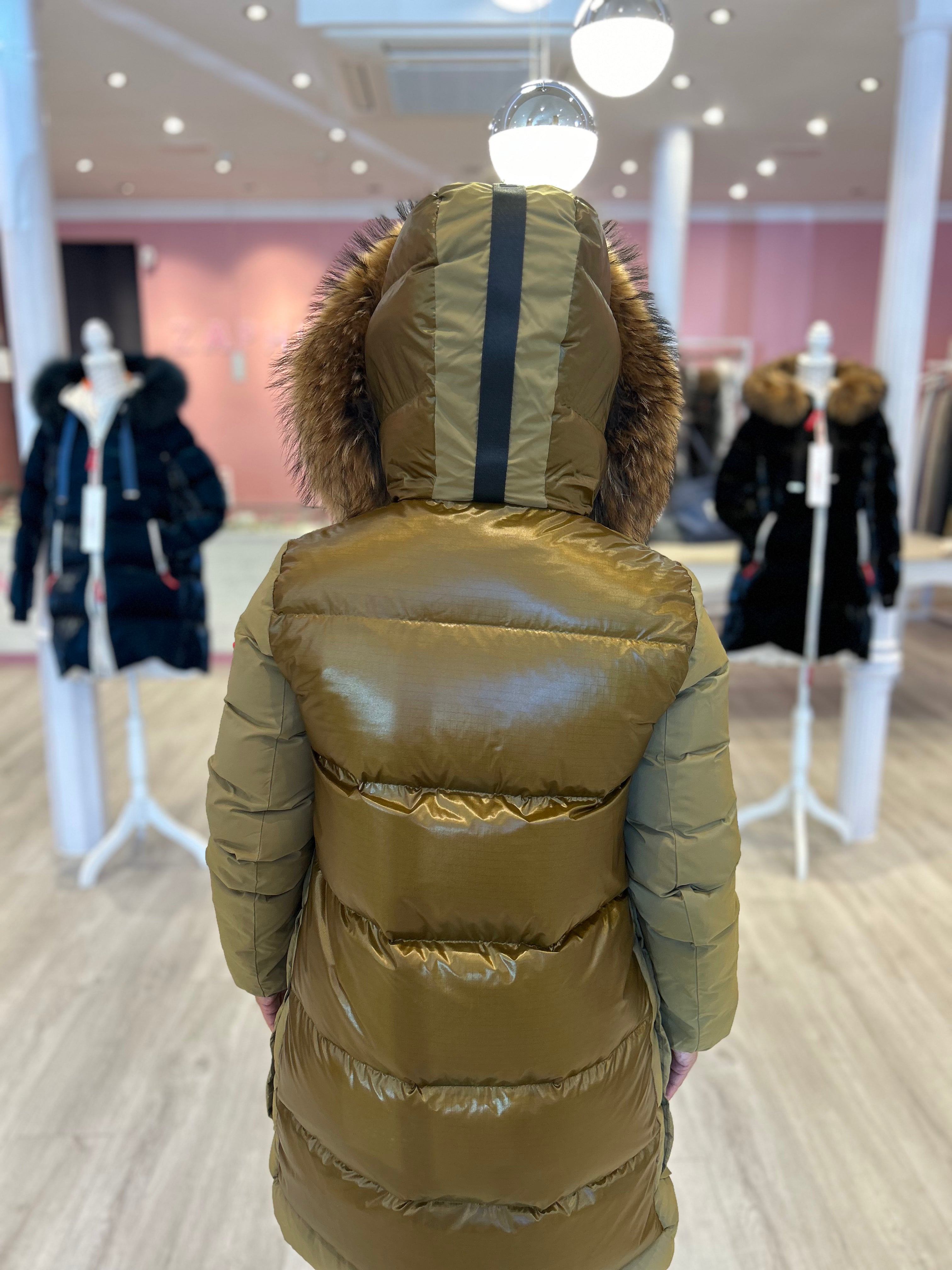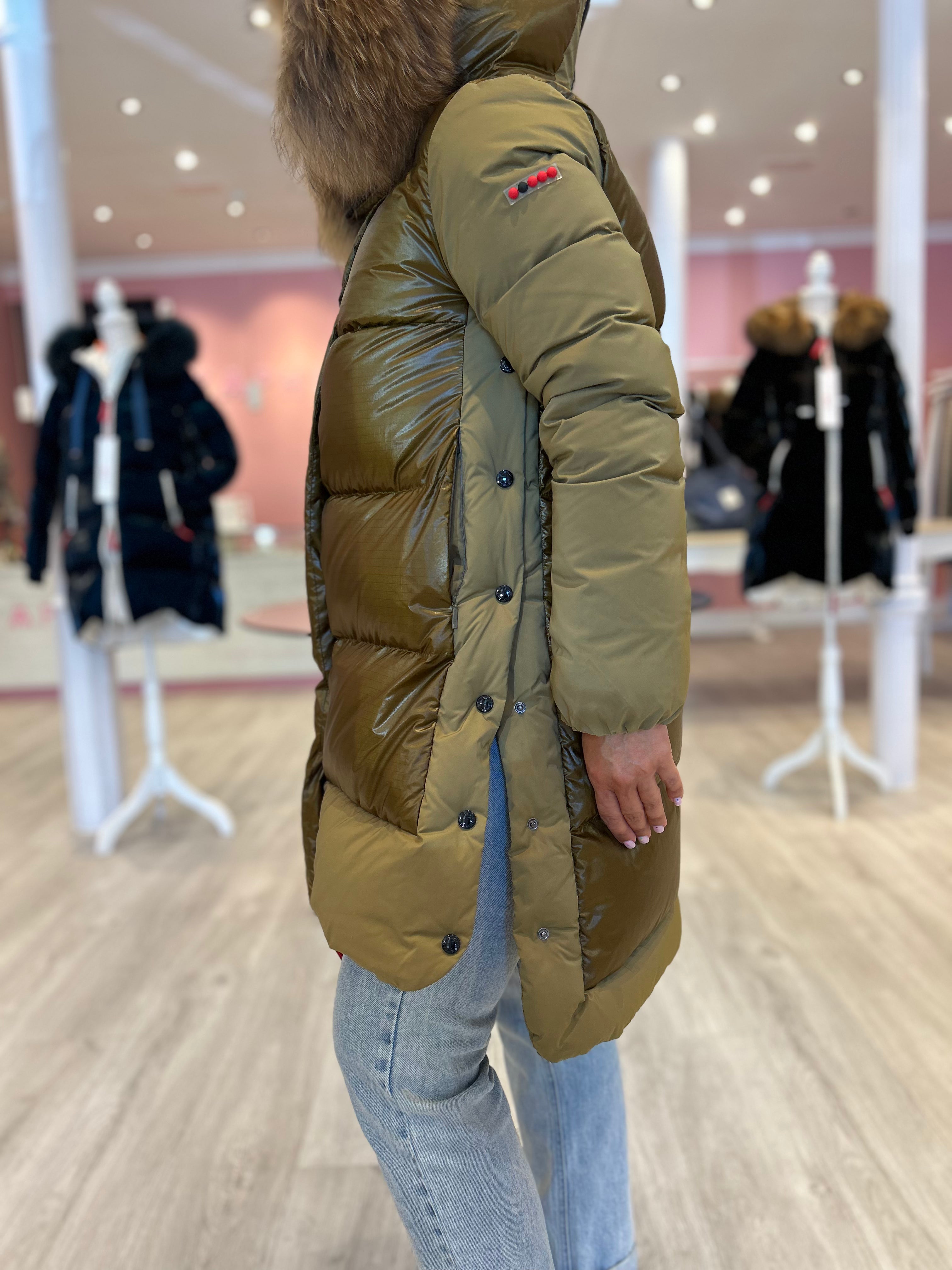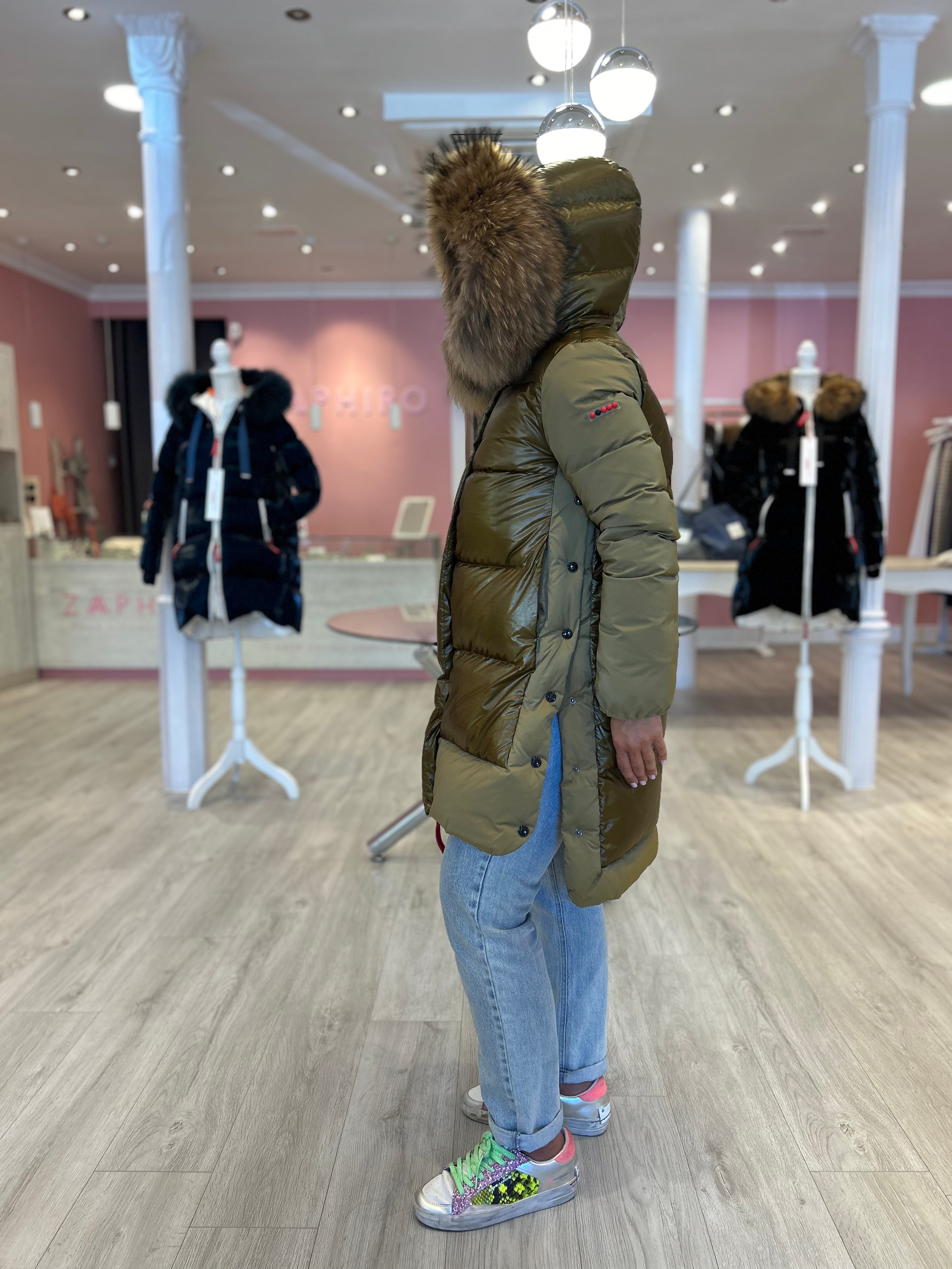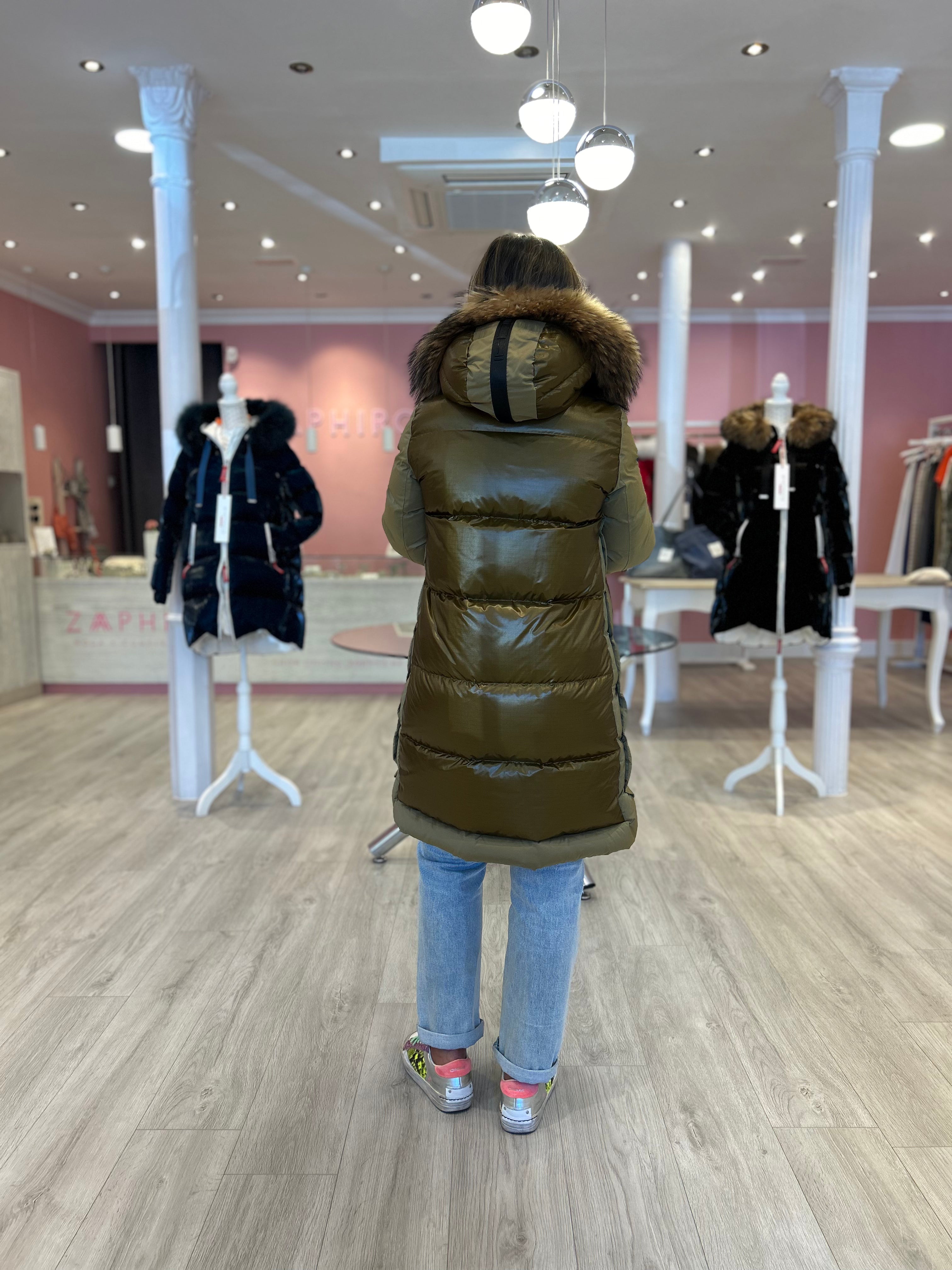 Plumífero Dichi Ariane en tono verde caqui y con pelo natural desmontable.