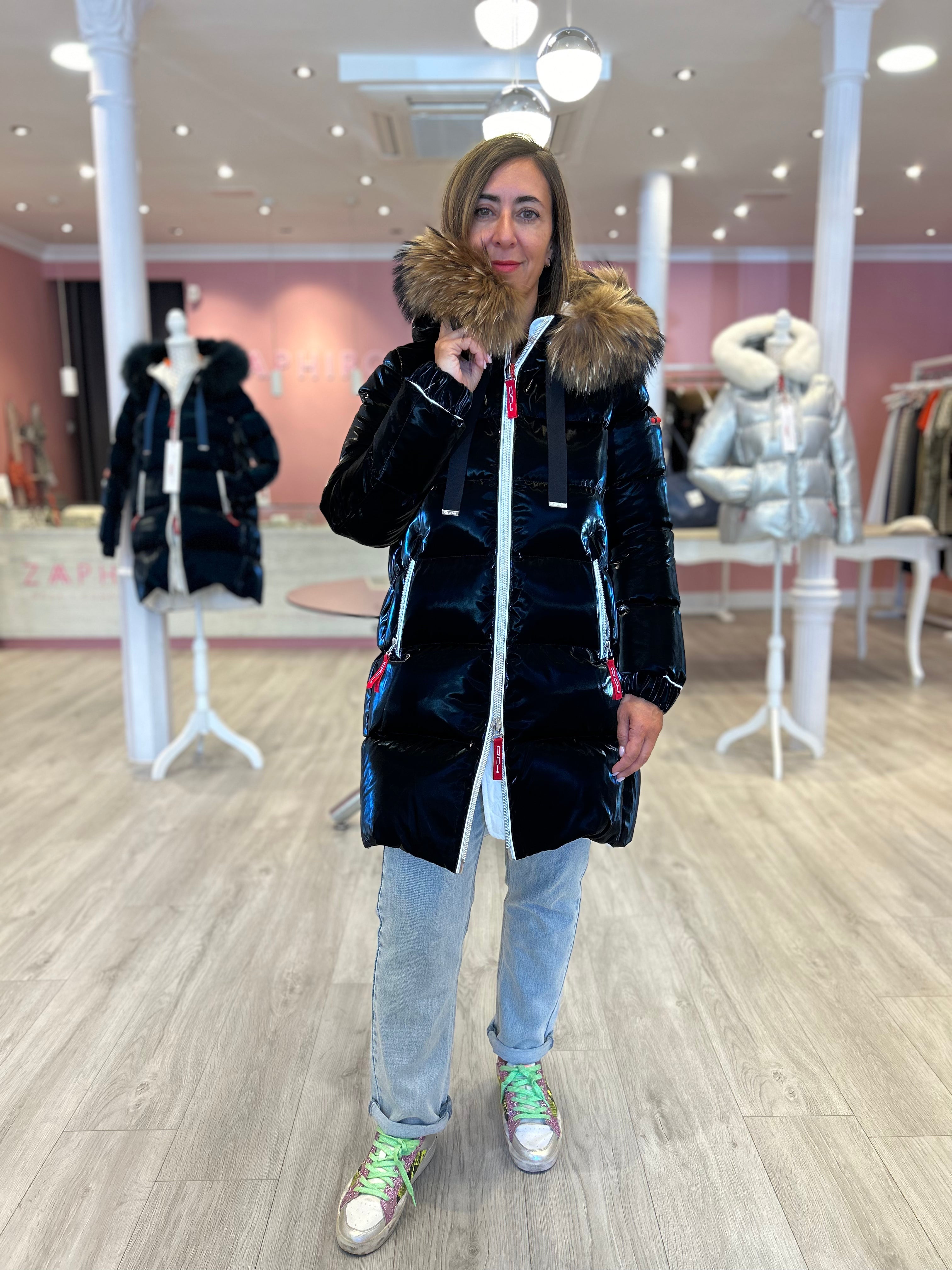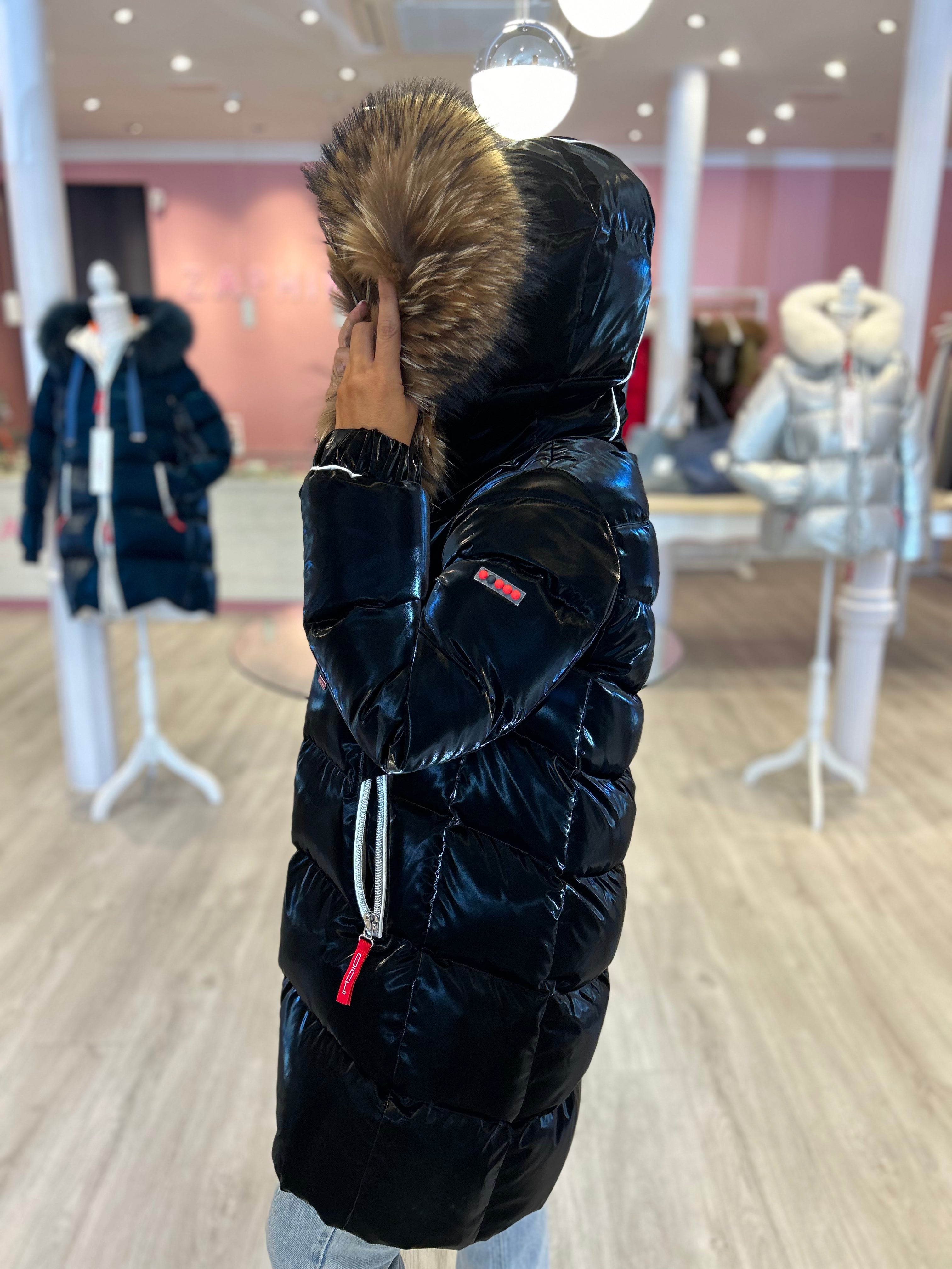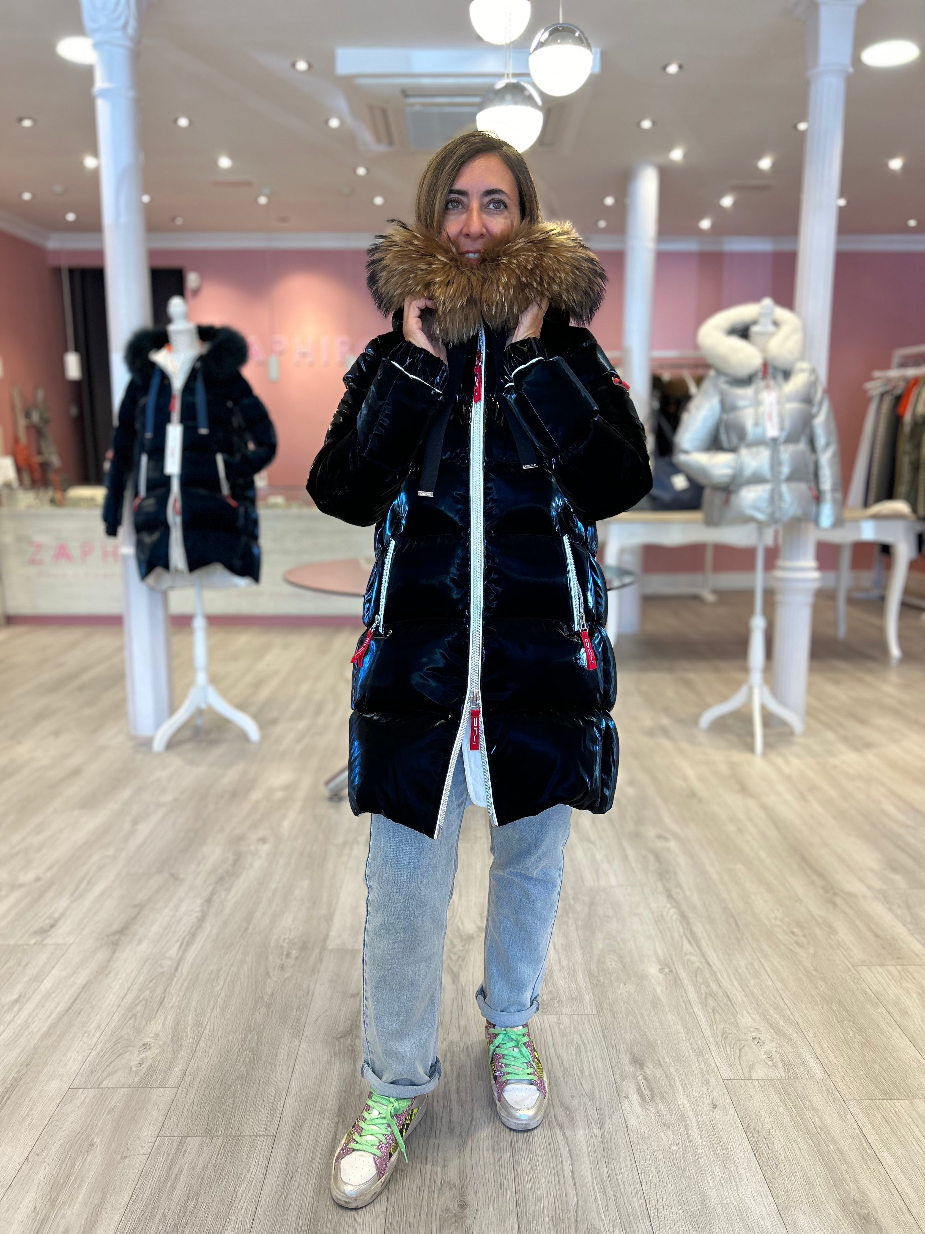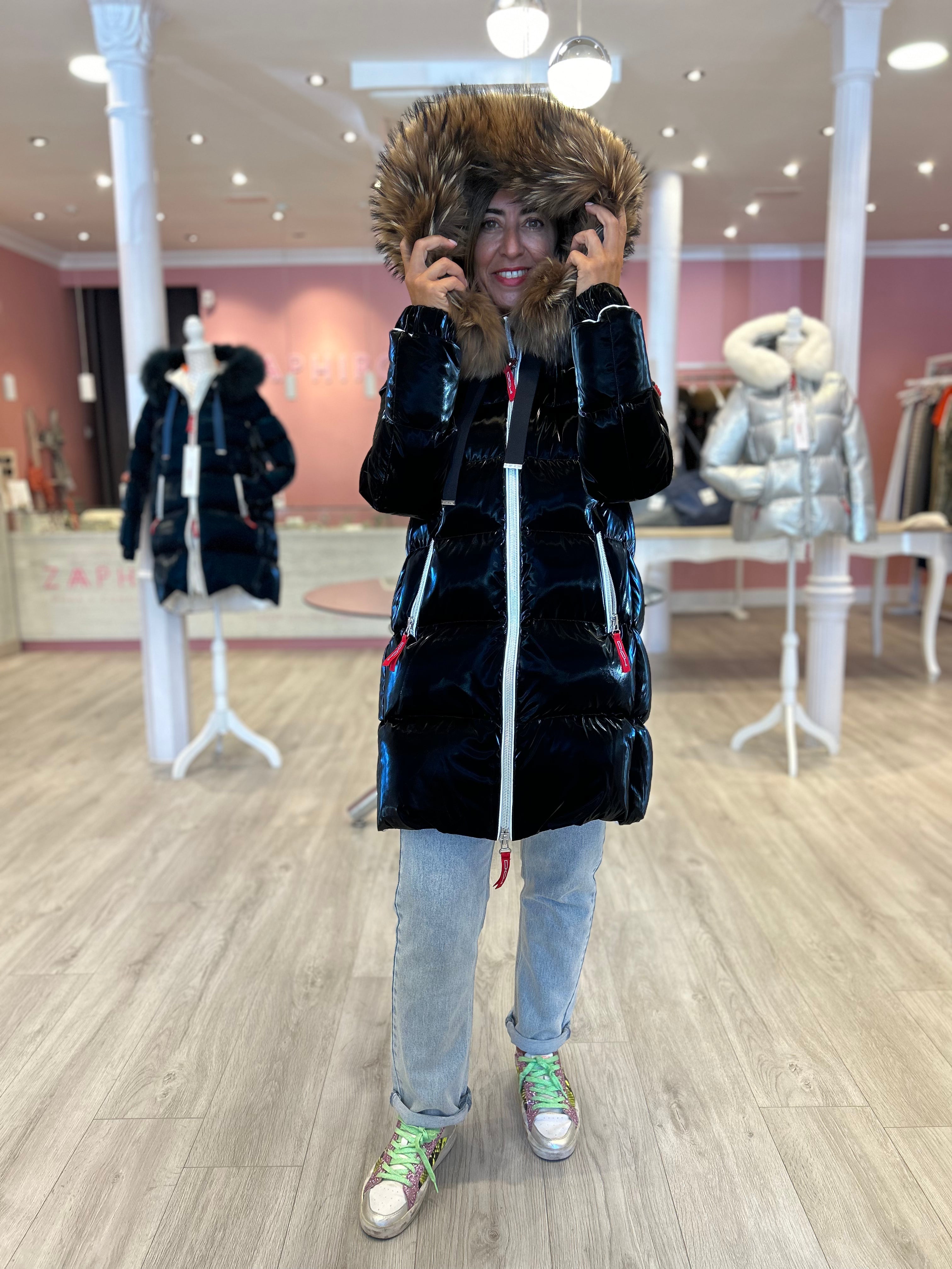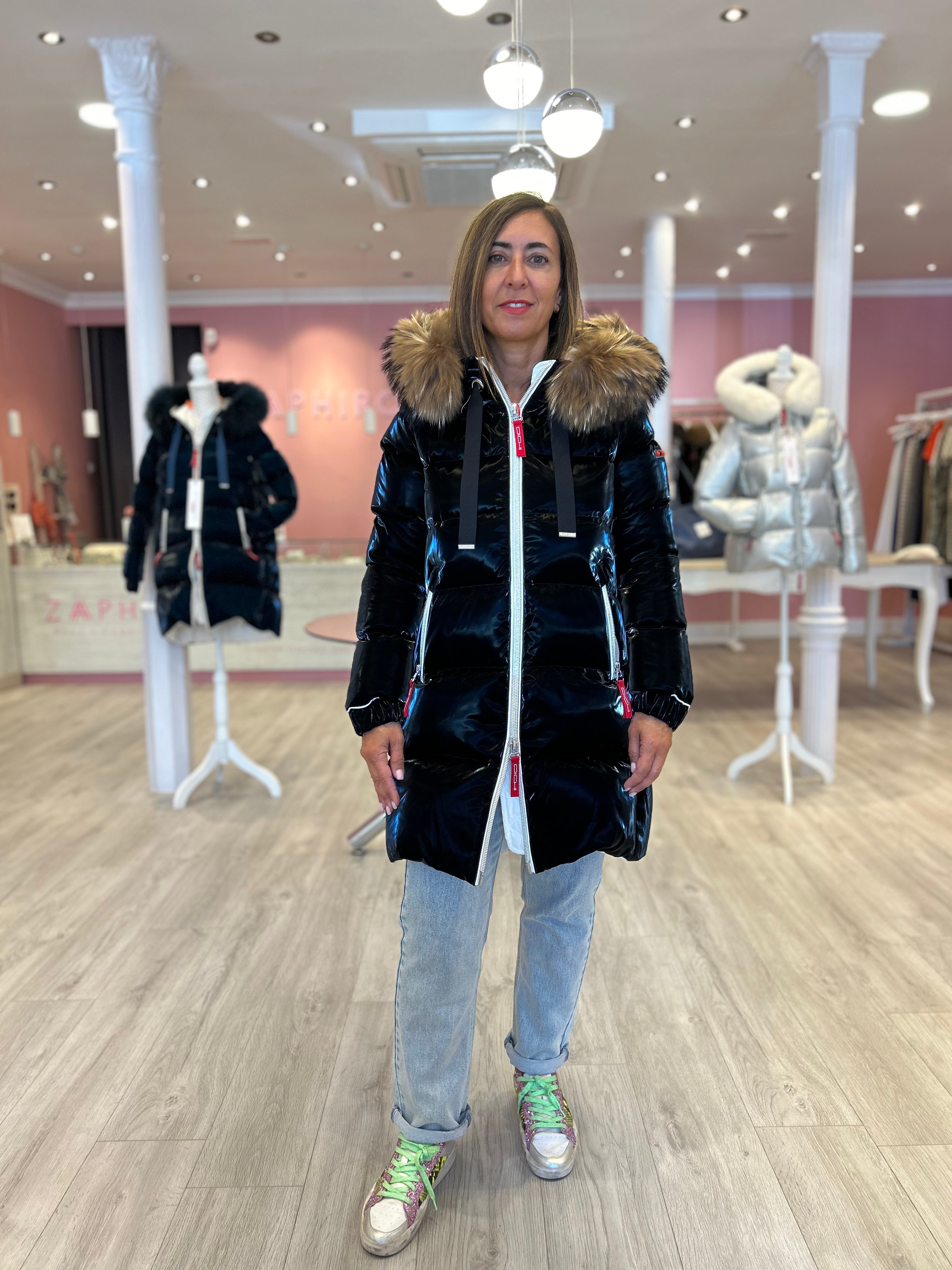 Plumífero Dichi Cherry en color negro, con pelo natural desmontable al tono en capucha.
