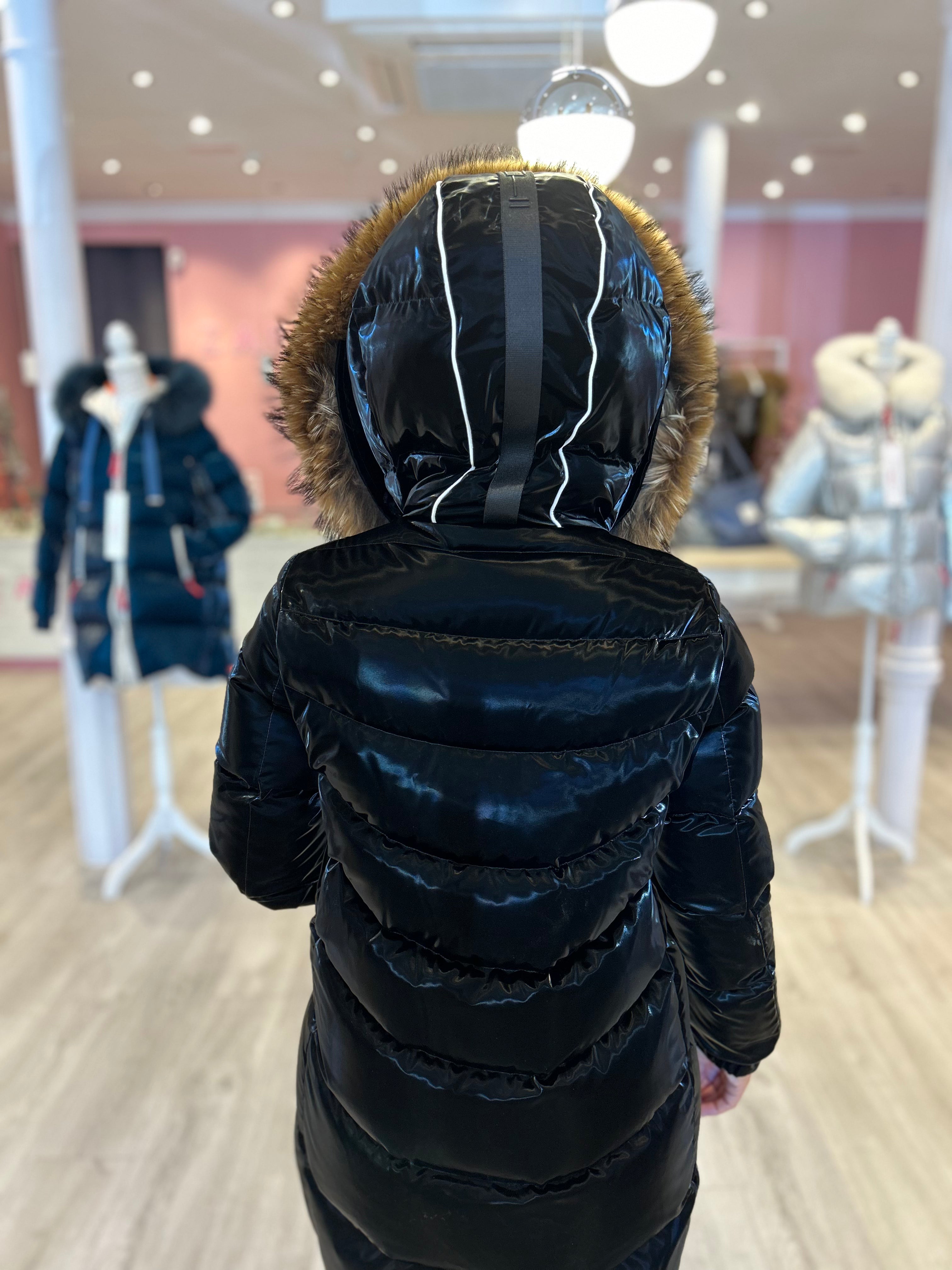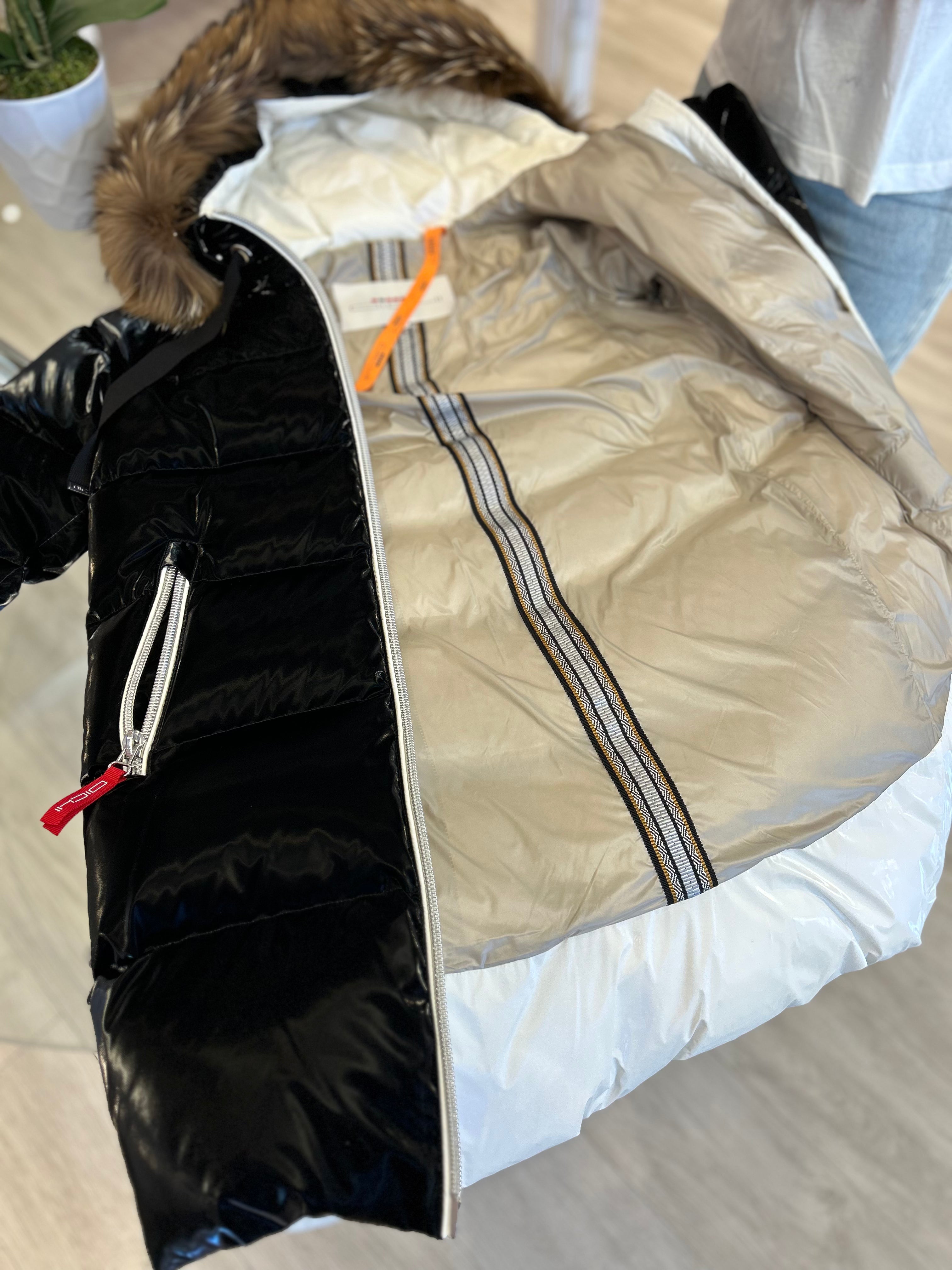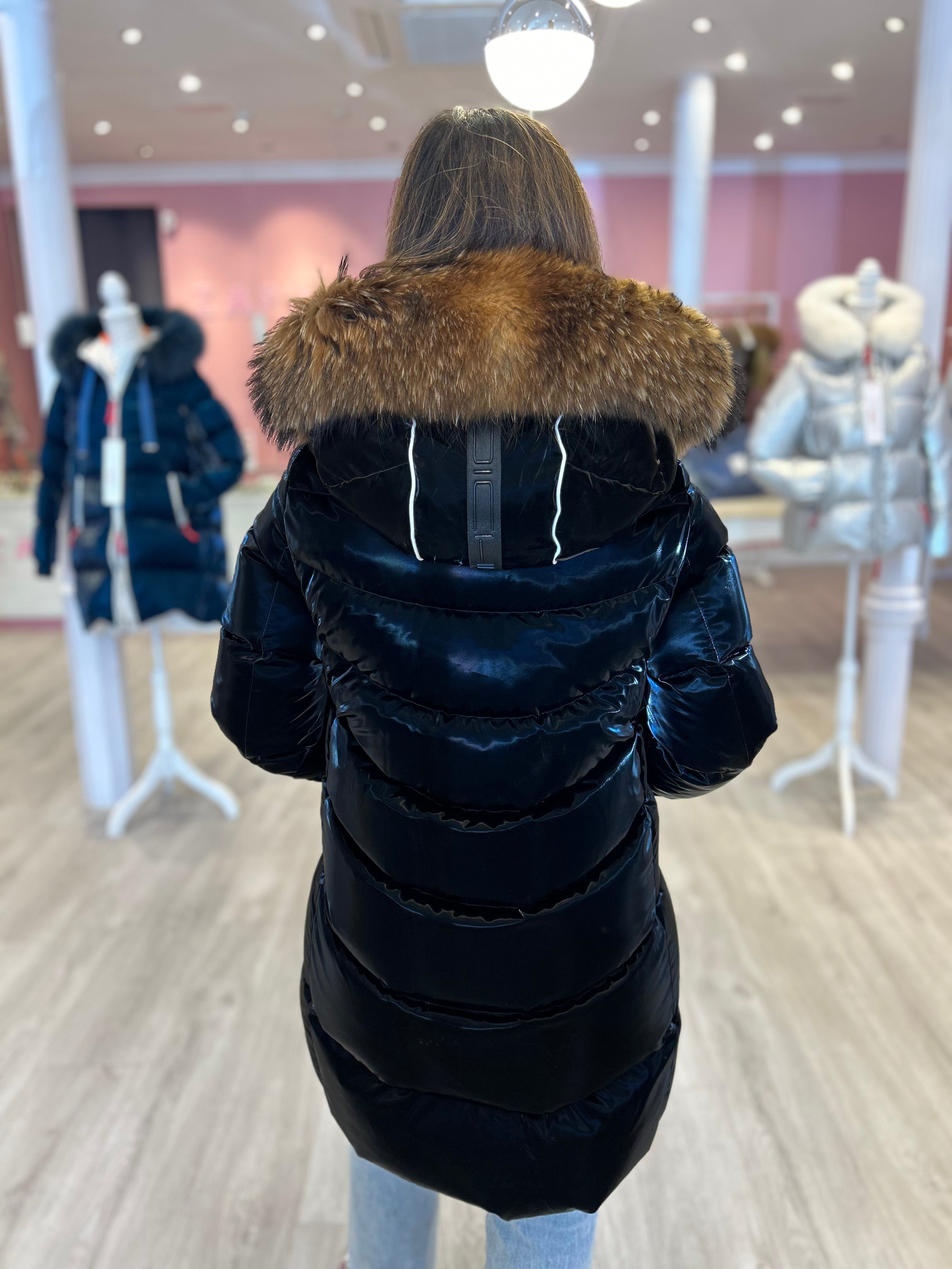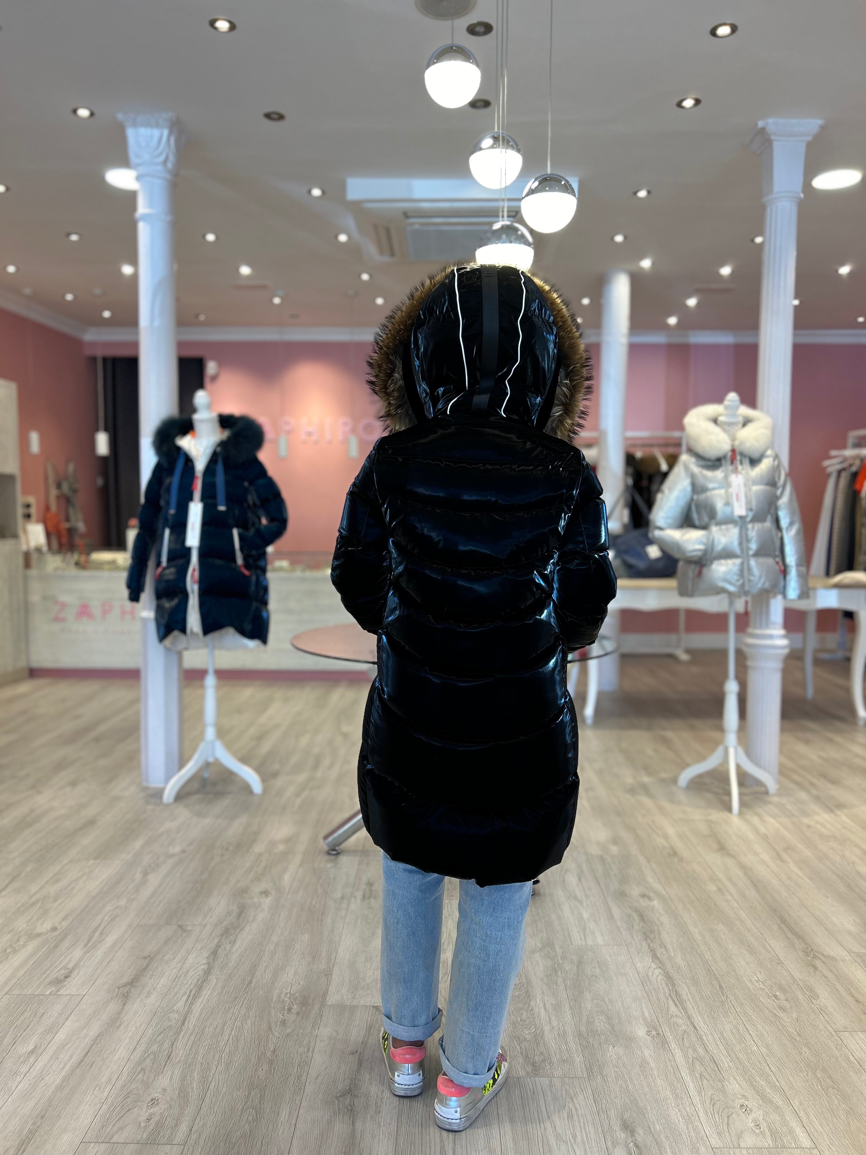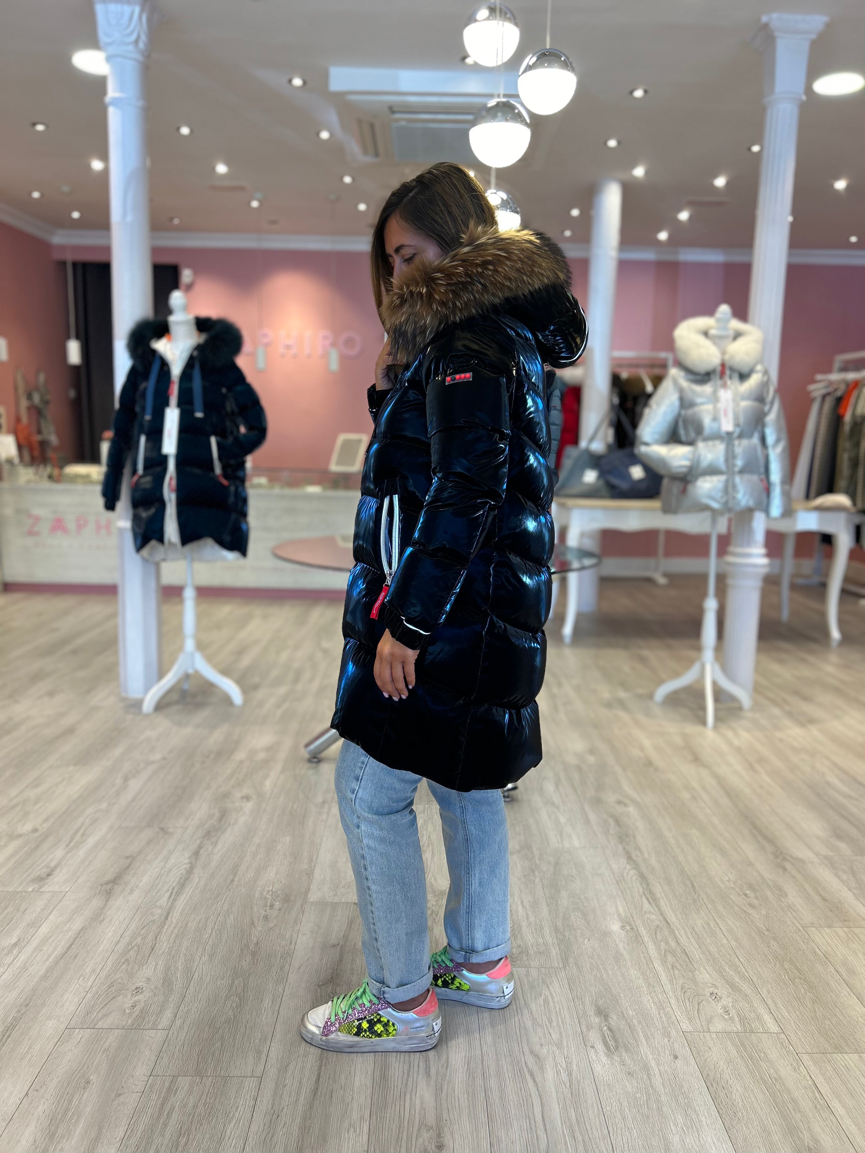Plumífero Dichi Cherry en color negro, con pelo natural desmontable al tono en capucha.