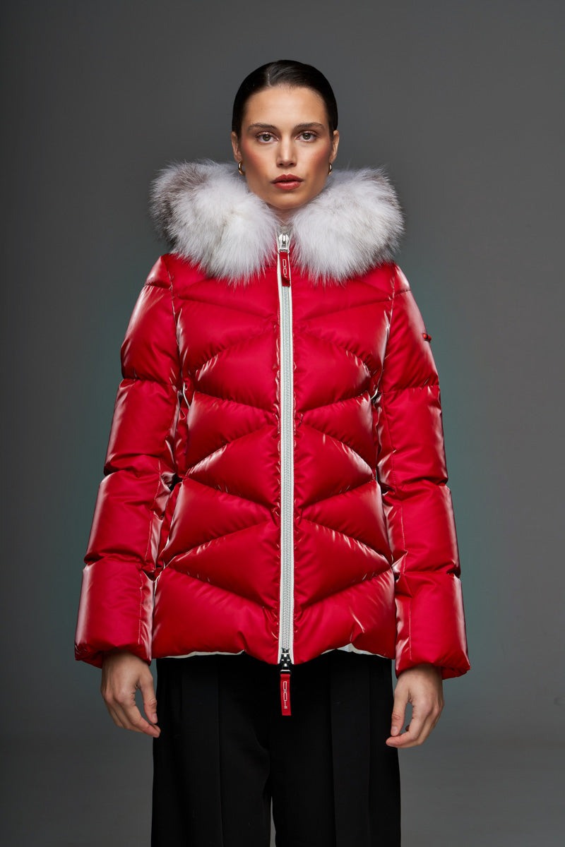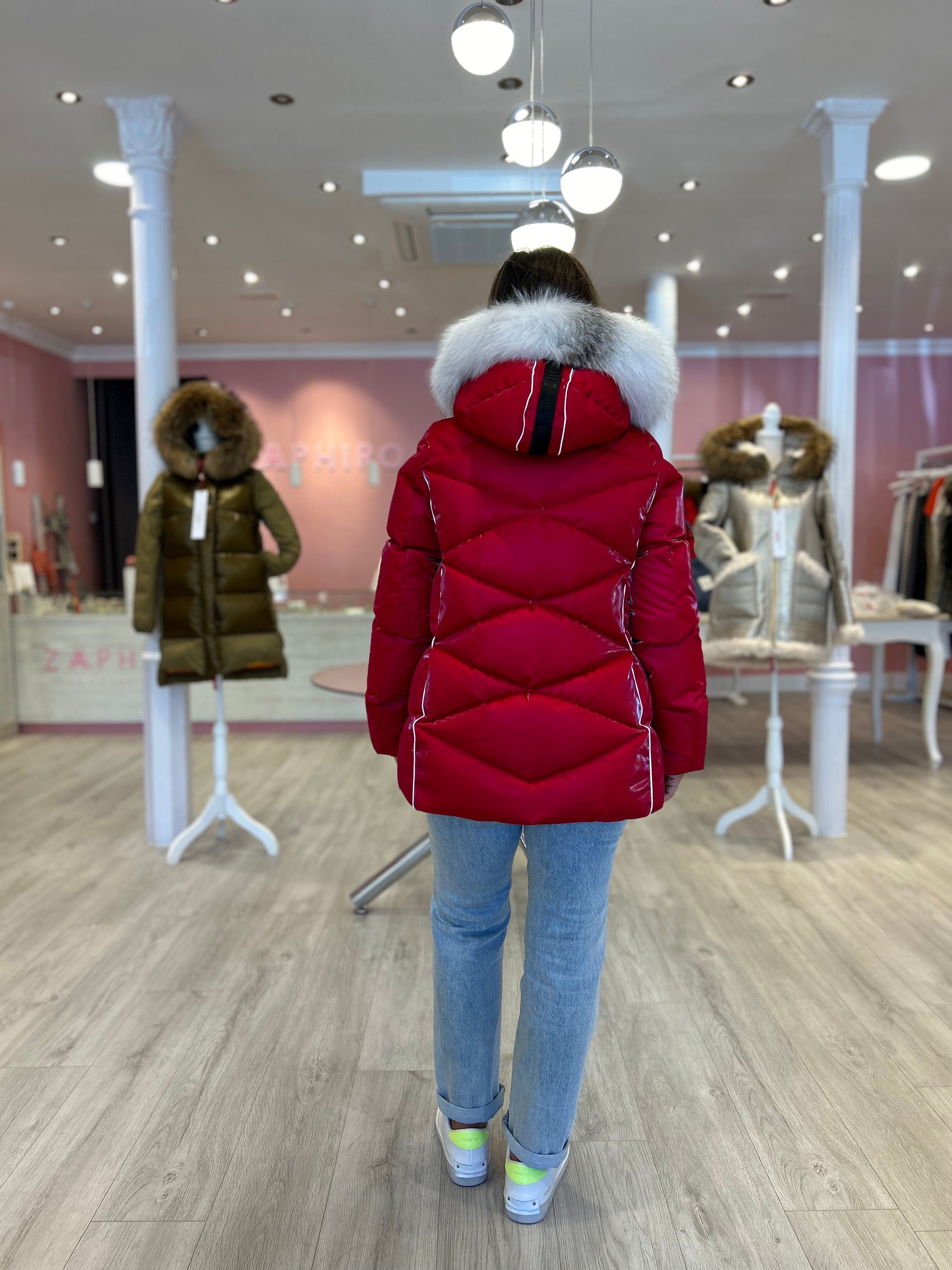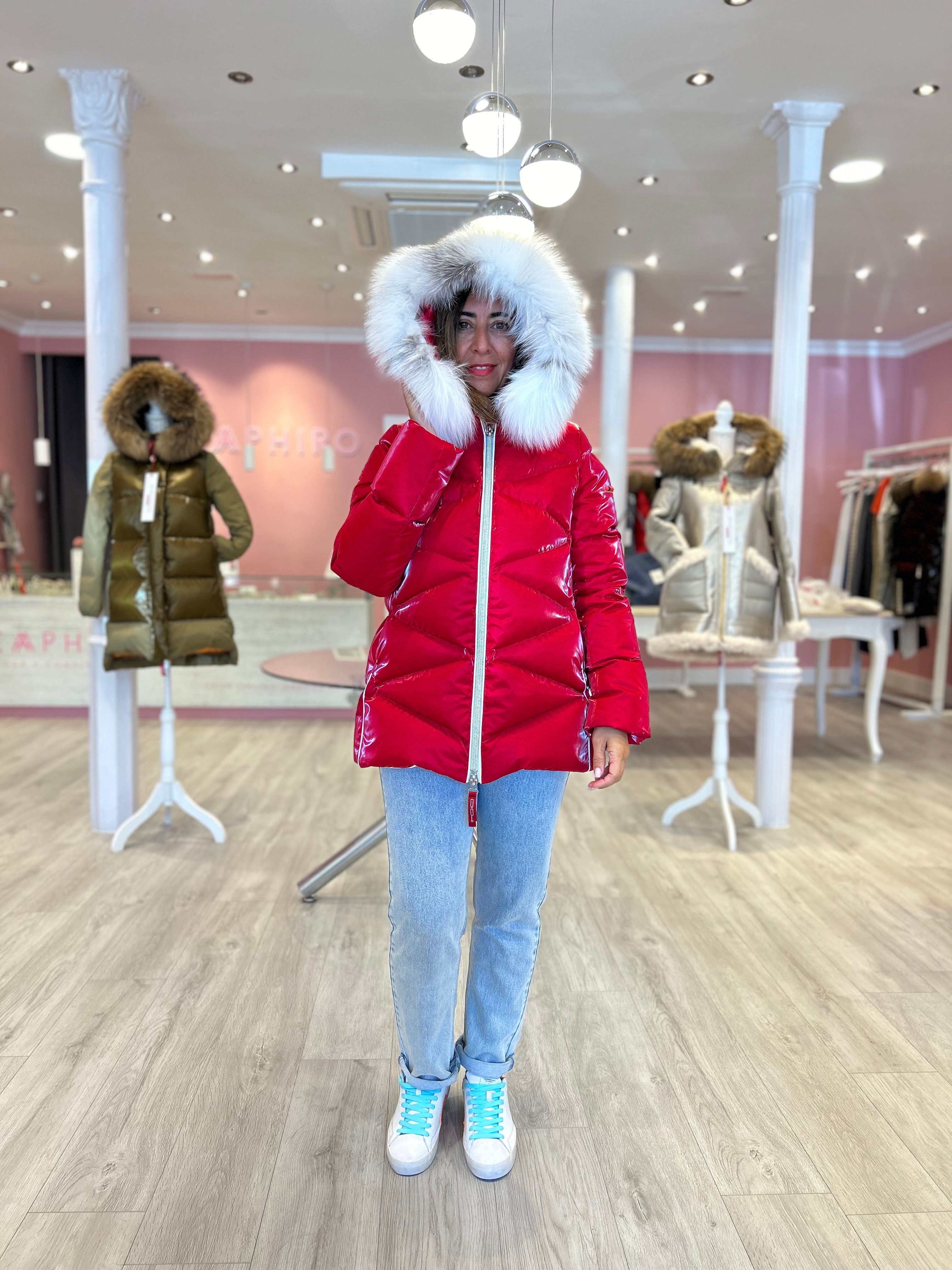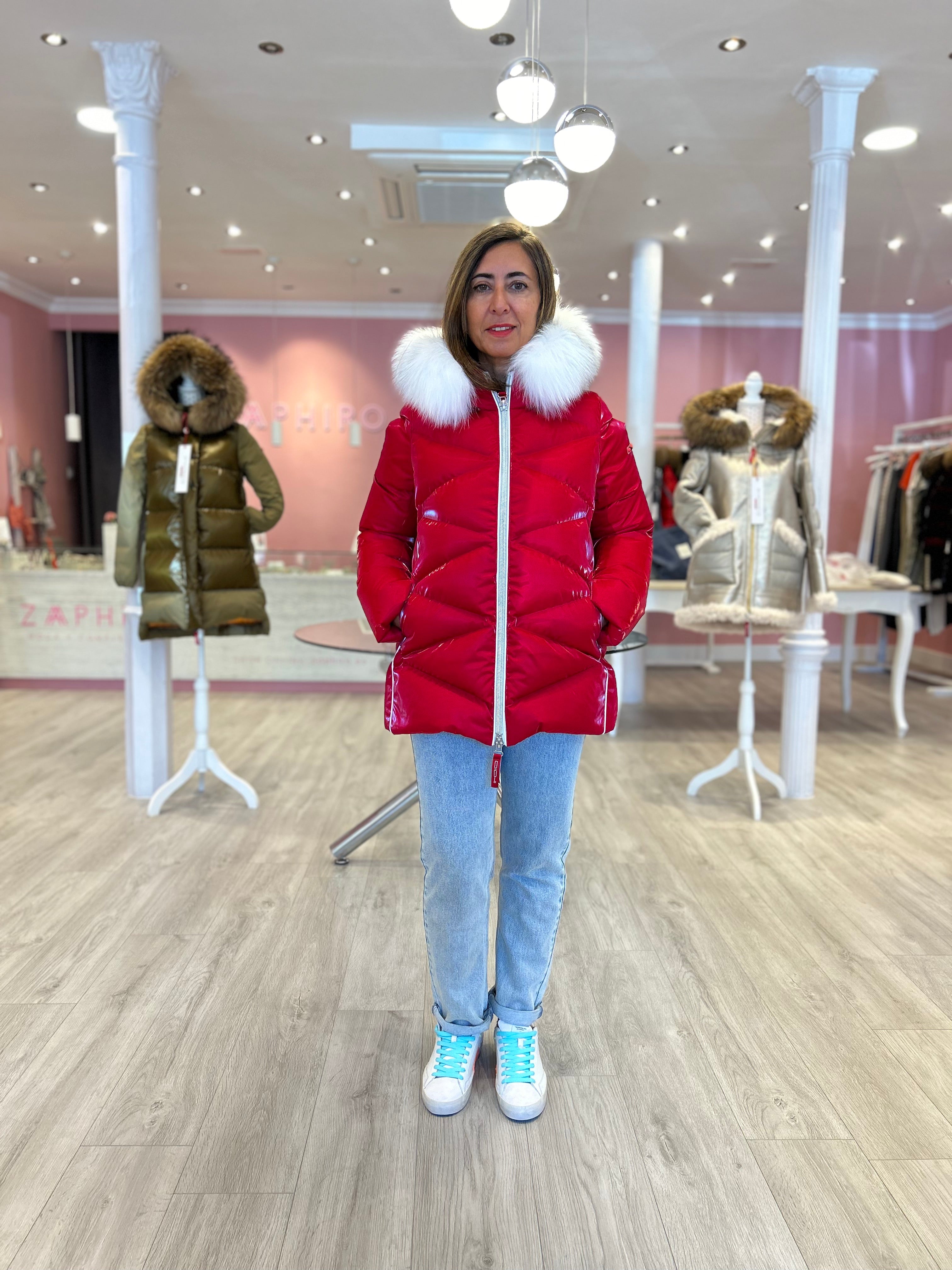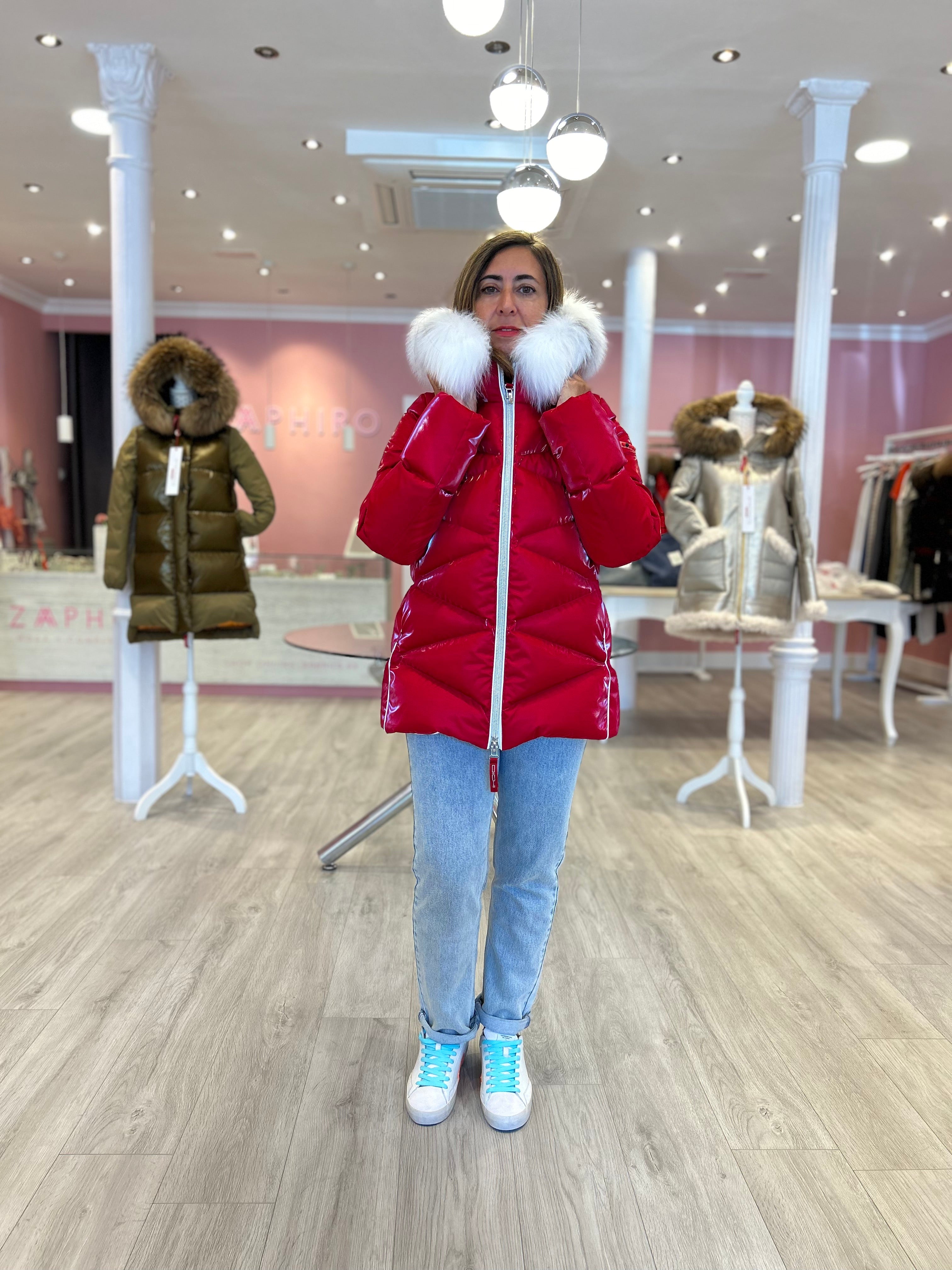 Plumífero Dichi Oki en tono frambuesa y efecto aterciopelado, con pelo natural desmontable.