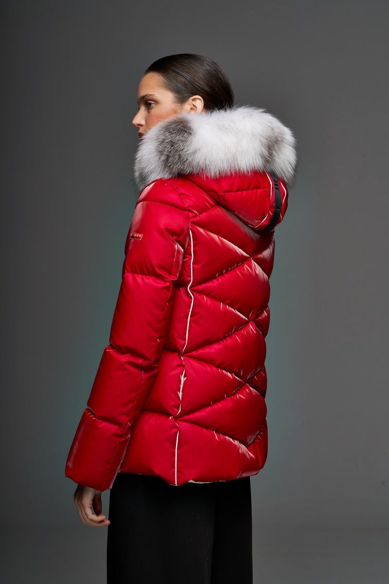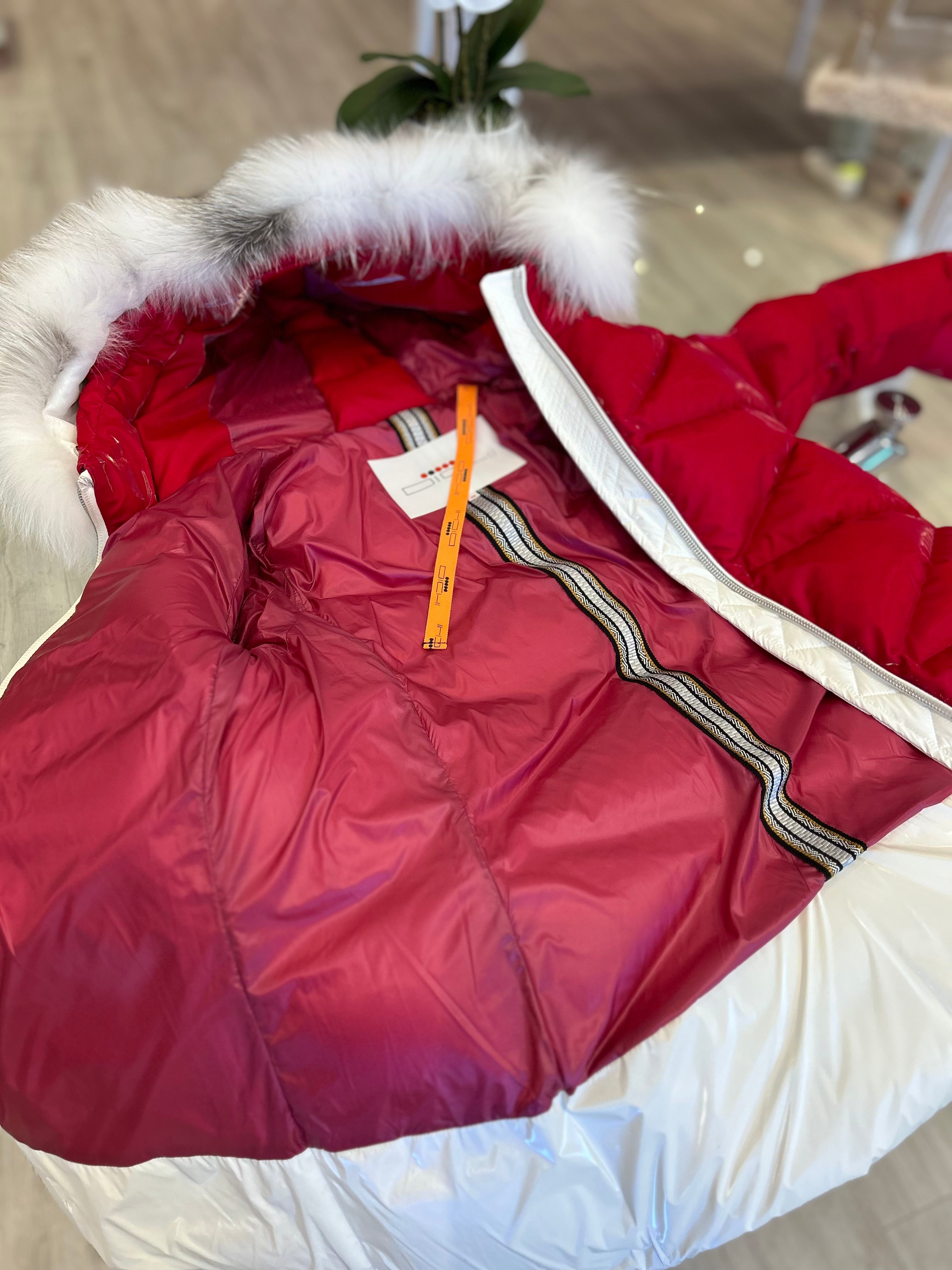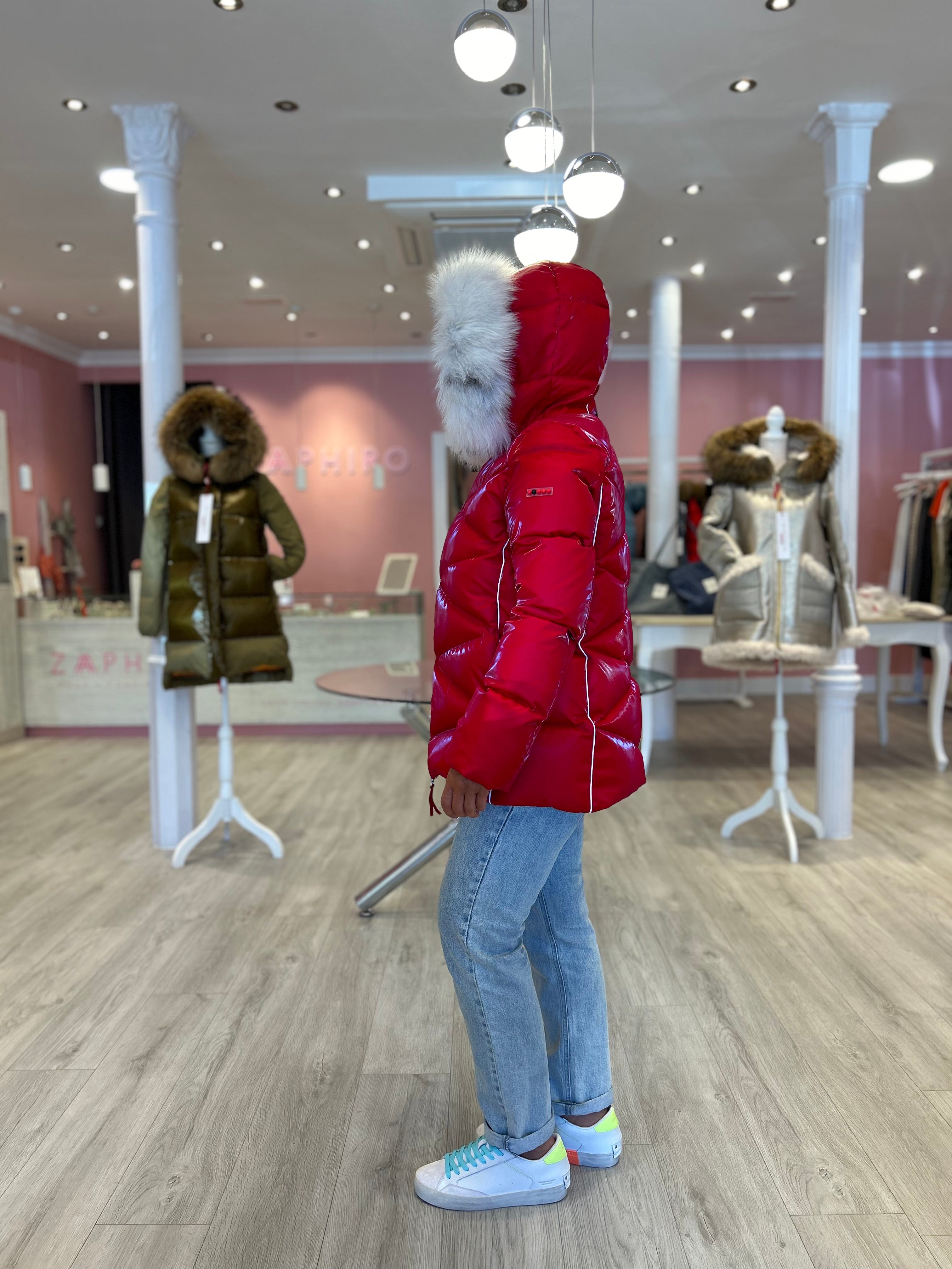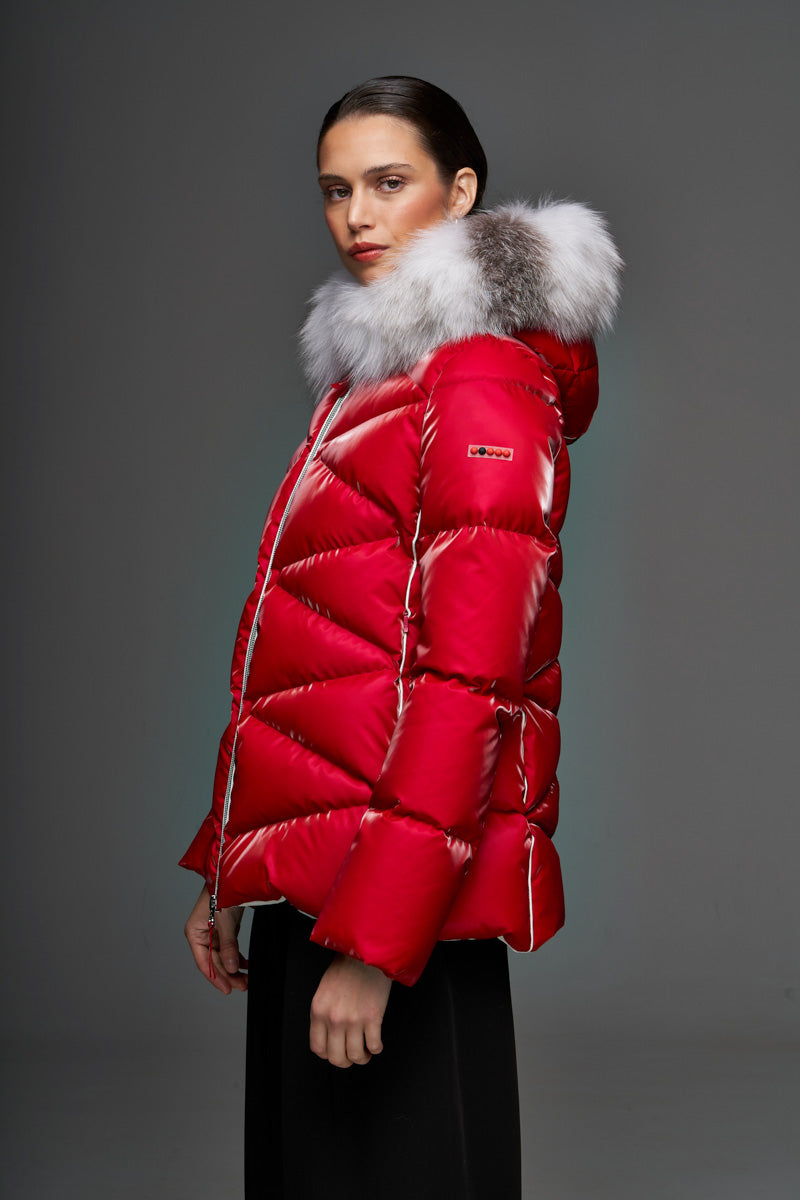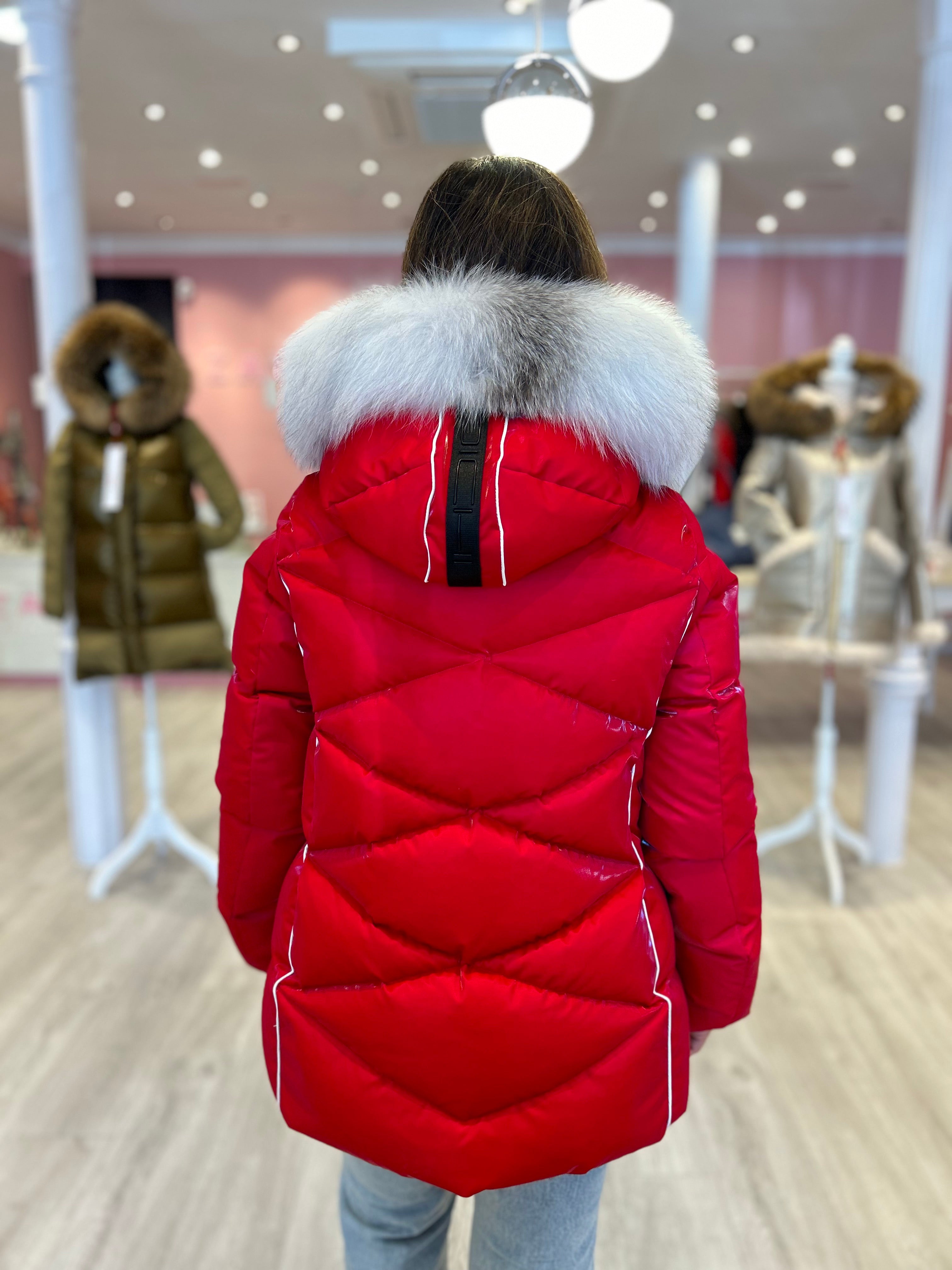 Plumífero Dichi Oki en tono frambuesa y efecto aterciopelado, con pelo natural desmontable.
