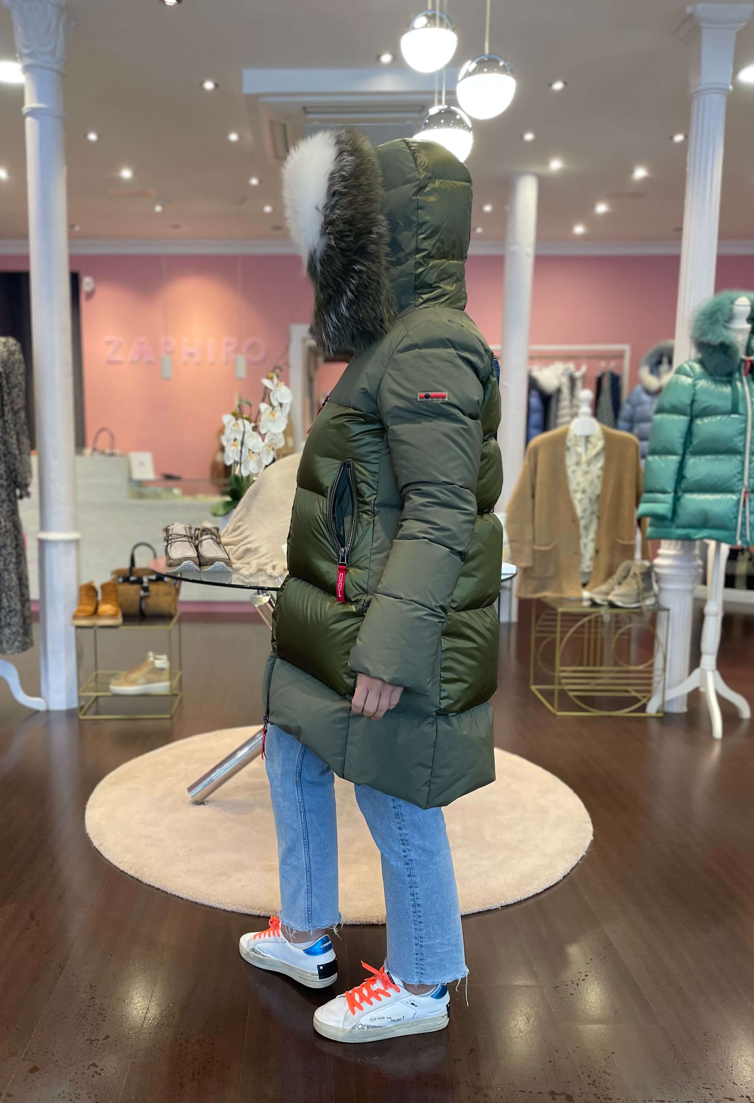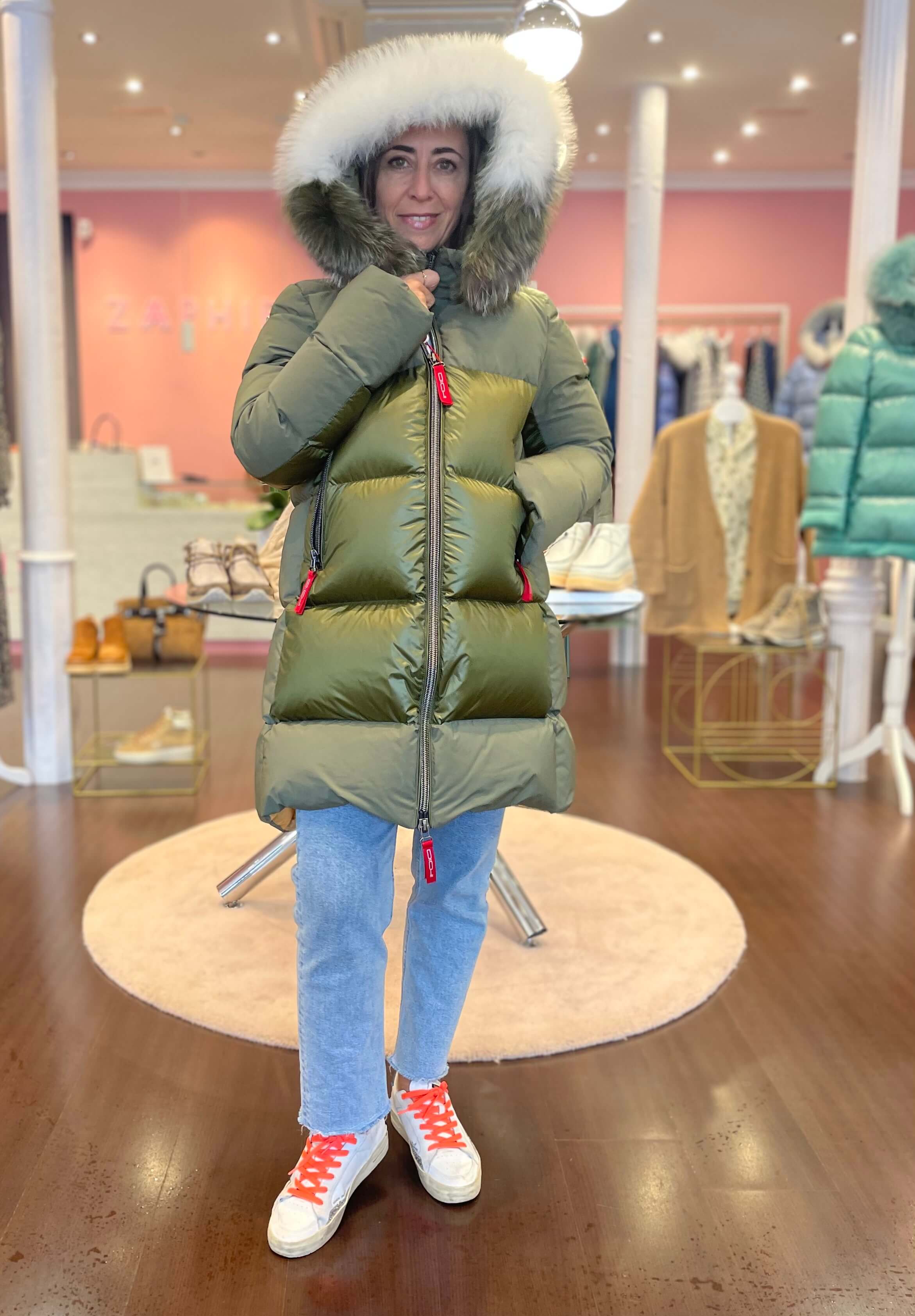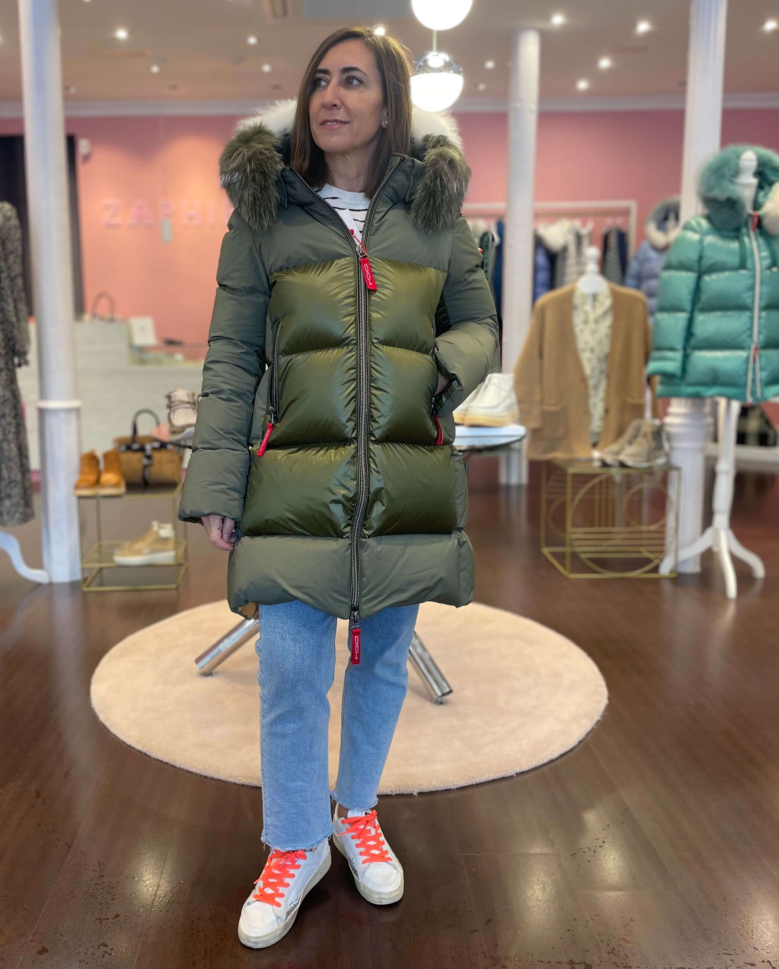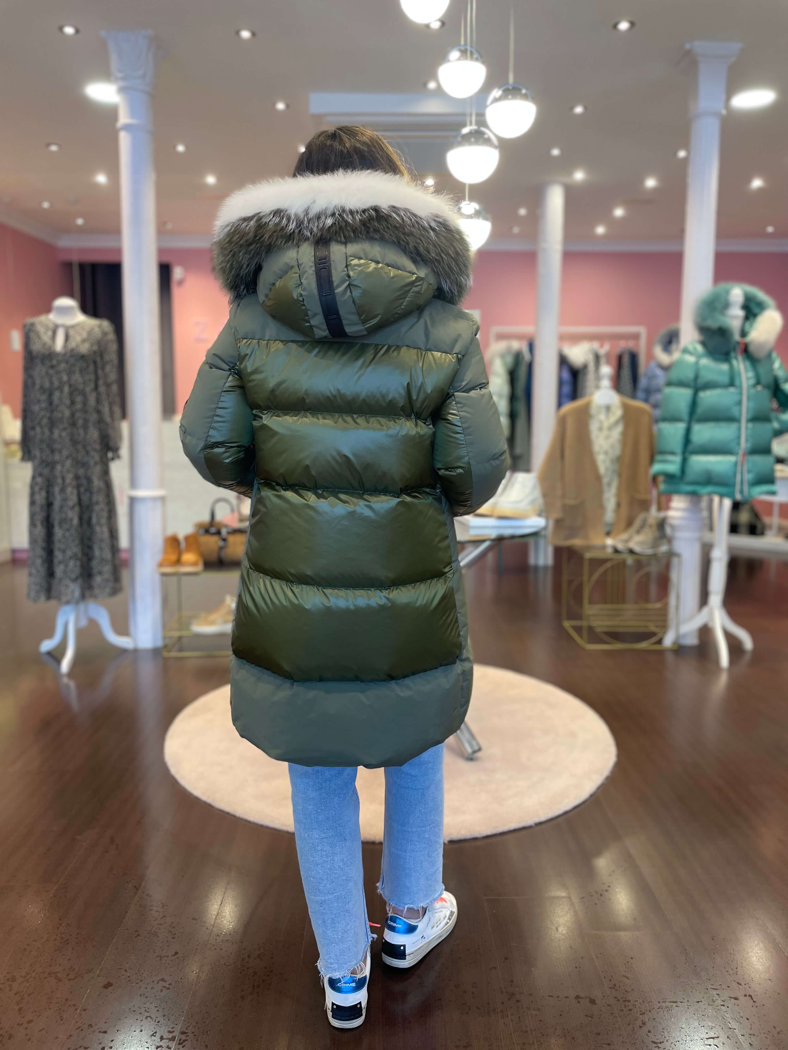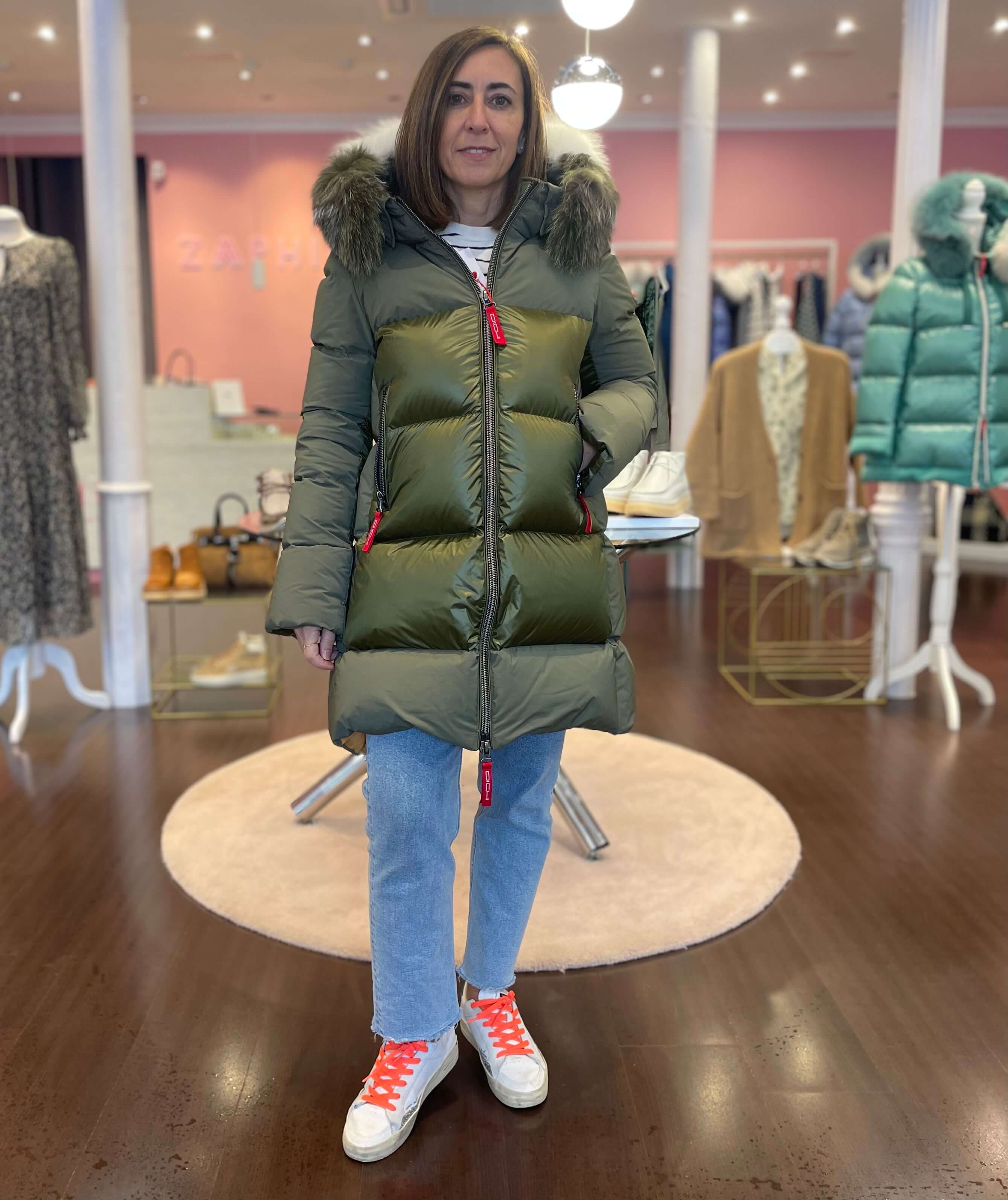 Plumífero Dichi Shina en tono verde musgo con tejido combinado y con pelo natural desmontable en capucha.