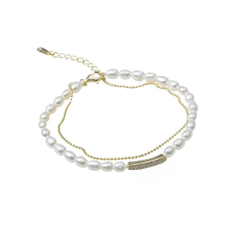 Pulsera Salvatore Plata de perlas irregulares y cadena bolitas en plata dorada.