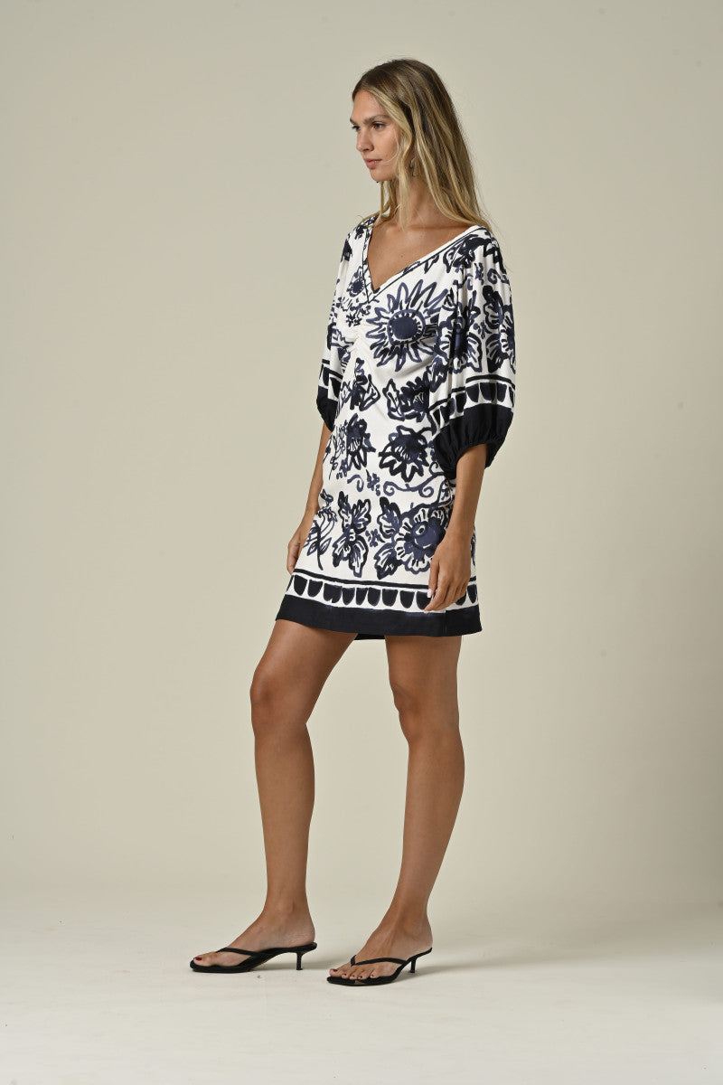 Vestido ORFEO Lorenza corto estampado en blanco y marino.
